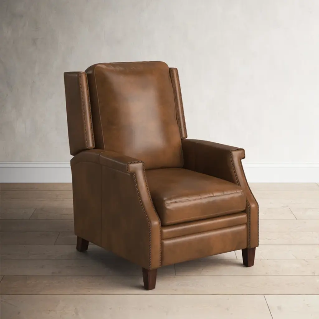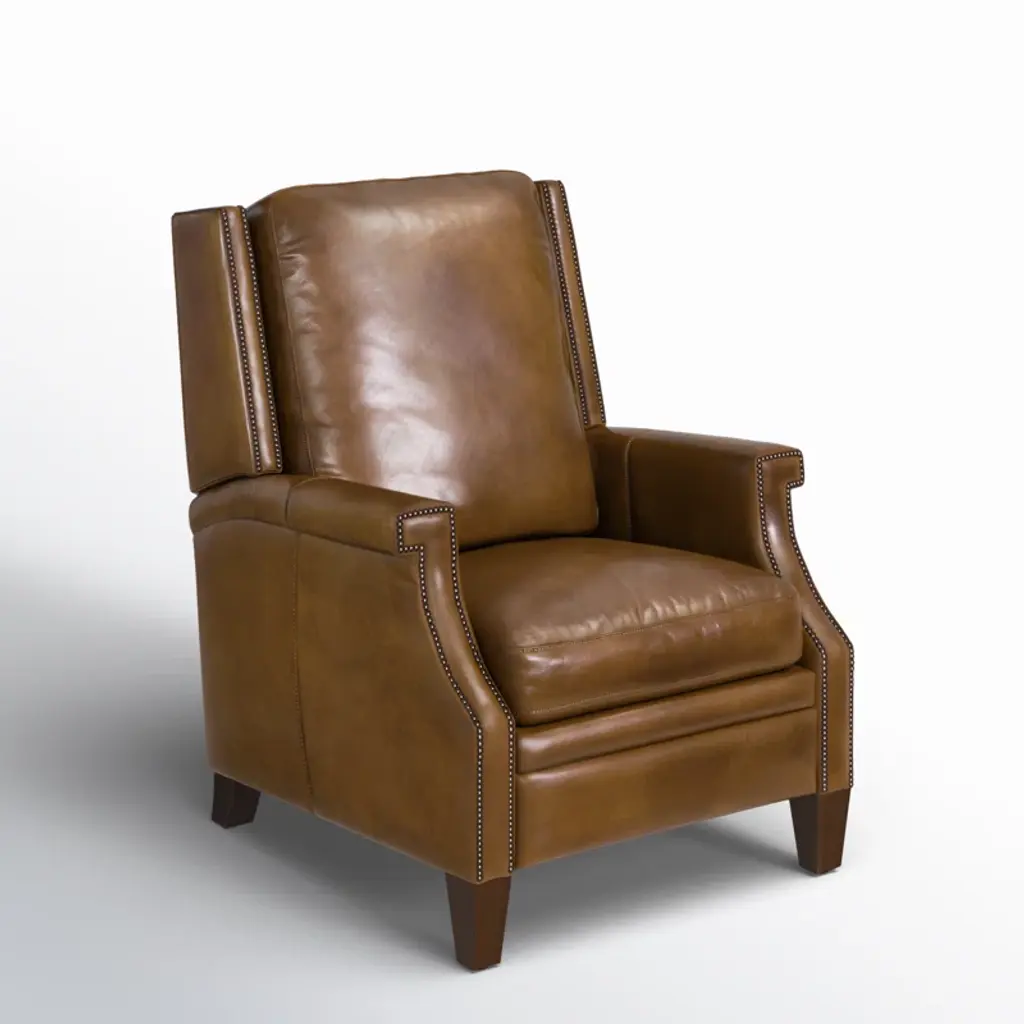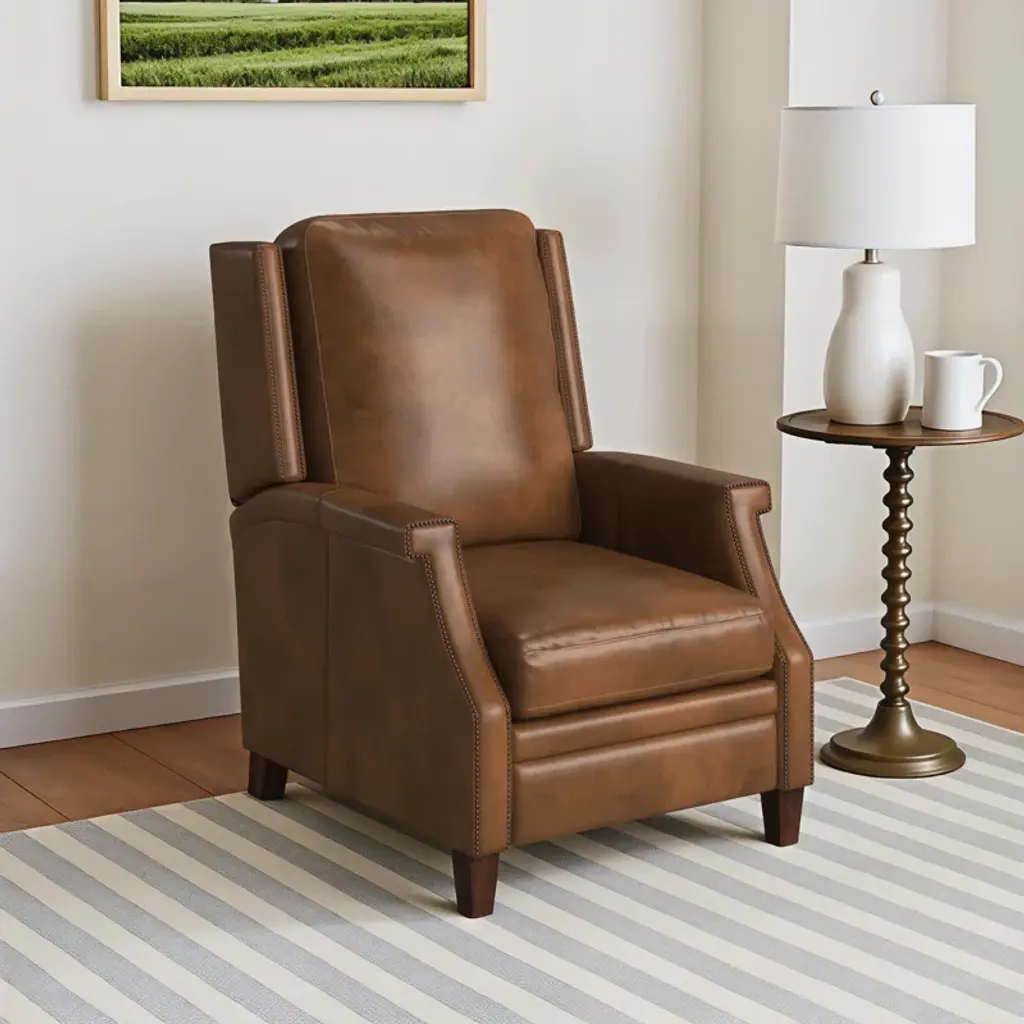 This genuine leather manual recliner has a traditional design that easily blends in with your living room or study furniture. We love its warm brown top-grain leather upholstery and the nailhead trim that lines its arms and back. There's no need to plug in this manual recliner – all you need to do is push back to recline in one of its three positions. It has a foam- and polyester-filled seat cushion that's supported by sinuous springs for just the right amount of support for every guest.
