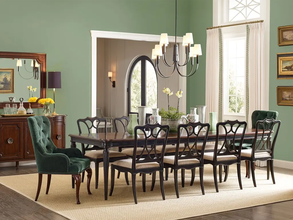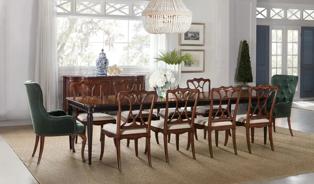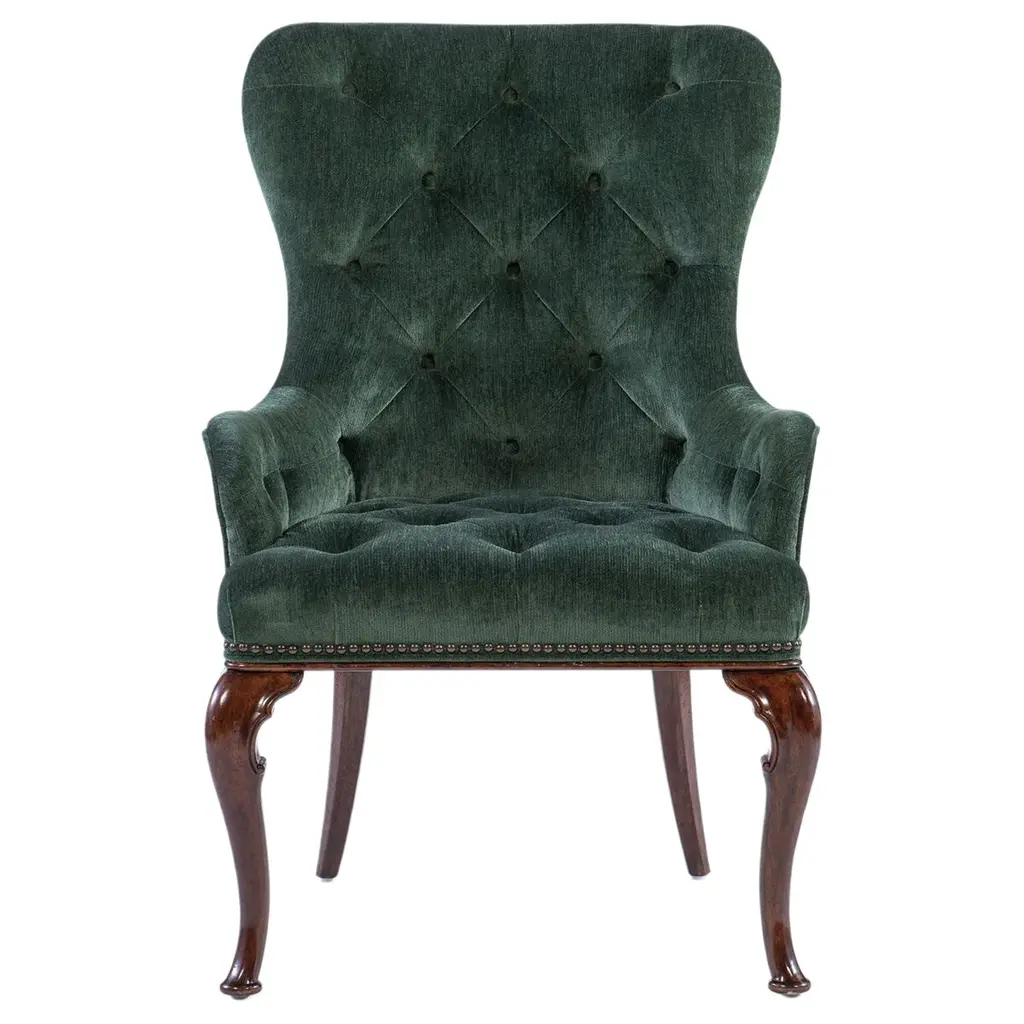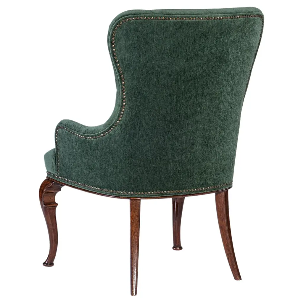 Grand and gracious, the exquisitely-scaled fully-upholstered Charleston Host Chair features delicate button-tufting on the seat and back and is accented with bronze nailhead and welt trim along the seat bottom and outside arms and back. The expansive cabriole legs are finished in Maraschino Cherry using natural grain Cherry Veneers showcasing the dramatic cathedral structure with the selective inclusion of naturally-occurring knots to deliver a rich warm cherry finish and a smooth sophisticated aesthetic.