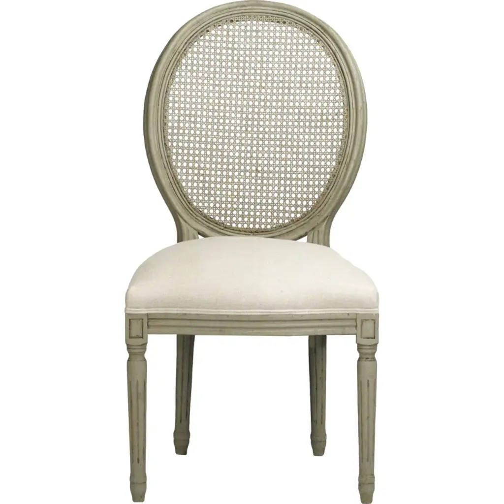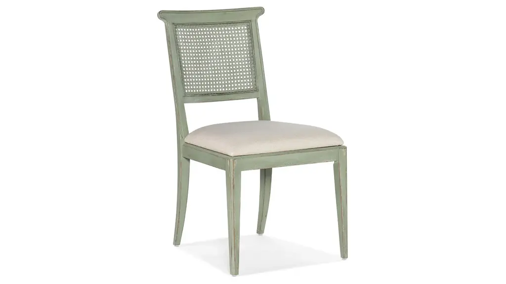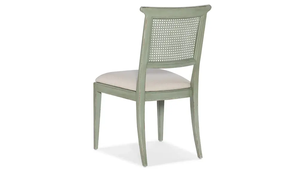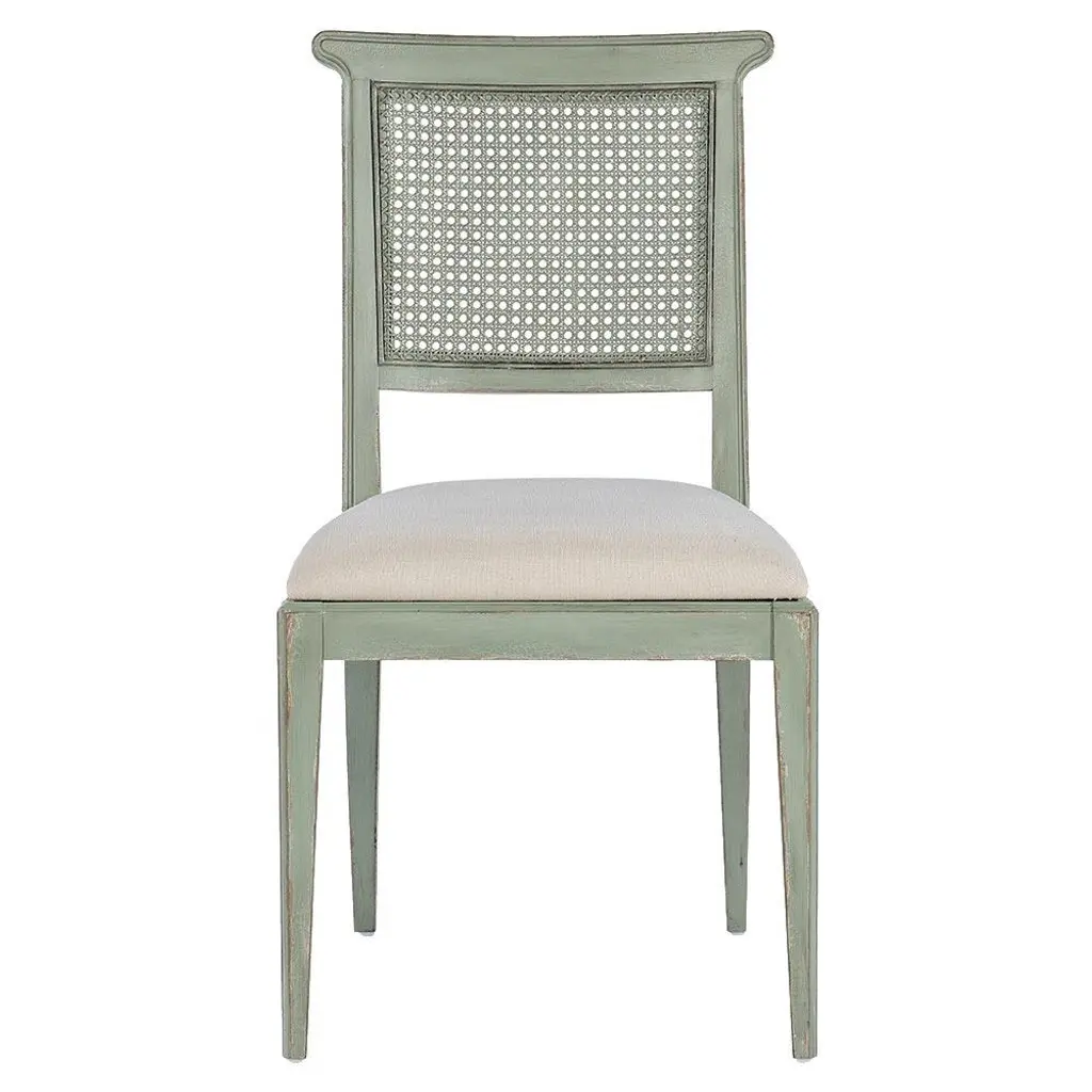Inspired by the tropical craftsmanship of the West Indies and the woven cane accents of classic British and Dutch Colonial design, the Charleston Side Chair (set of 2) has an oyster-colored fabric seat and a cane back. The finish is Verdigris Green, also known as "true Charleston Green." The color is the result of the natural patina formed when copper is exposed to air and seawater. This weathered green color represents years of Low Country heat and moisture degrading the pure pigment color, creating a truly venerable aesthetic.