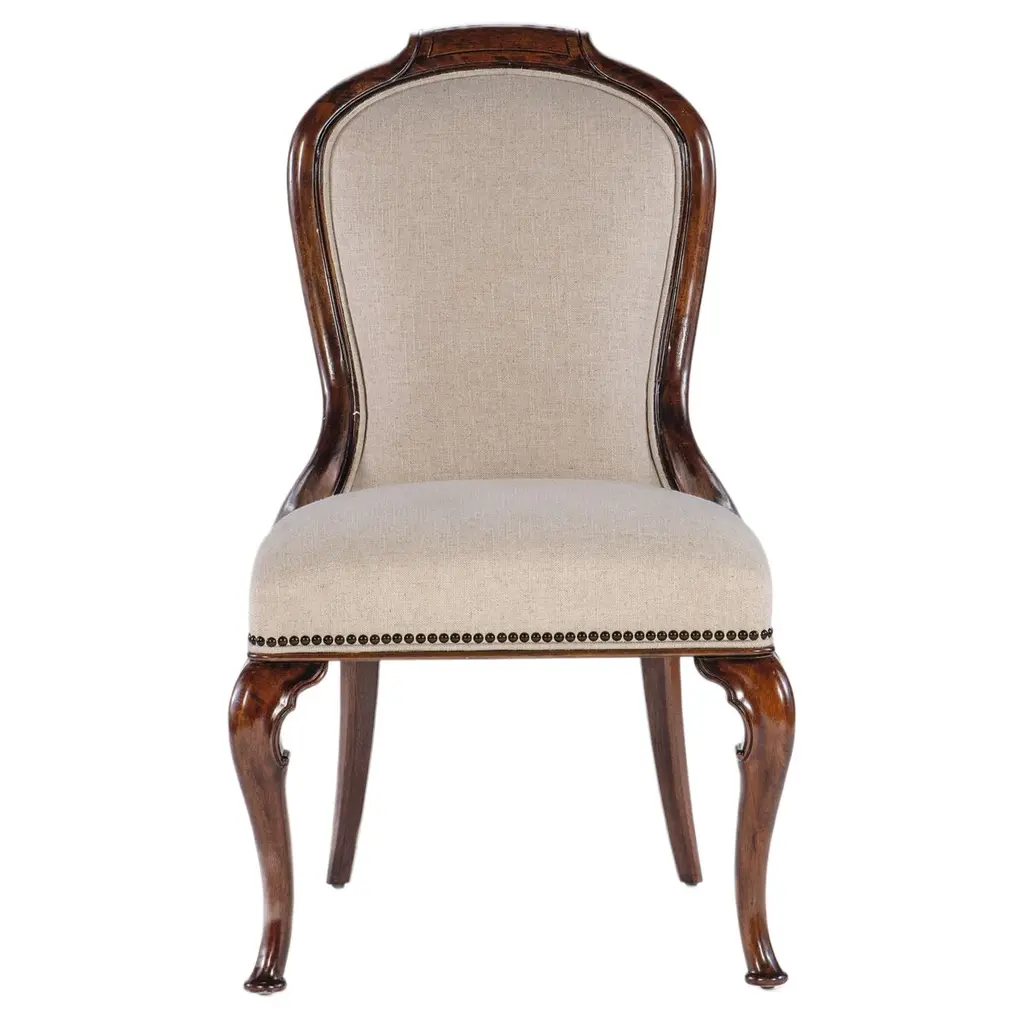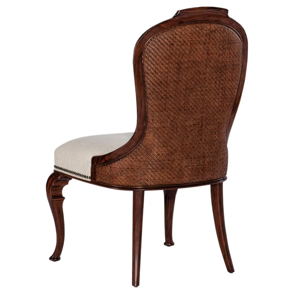 Exuding character and charisma, the shapely Charleston Side Chair is inspired by the tropical craftsmanship of the West Indies and the woven cane accents of classic British and Dutch Colonial design. Featuring a seat and back upholstered in fabric, the chair has nailhead trim along the seat, and welt trim along the top and sides. The entire outside back of the chair is covered in cane. The carved cabriole legs are finished using natural grain veneers showcasing dramatic cathedral patterns with the selective inclusion of naturally occurring knots to deliver a rich warm finish and a smooth, sophisticated aesthetic.