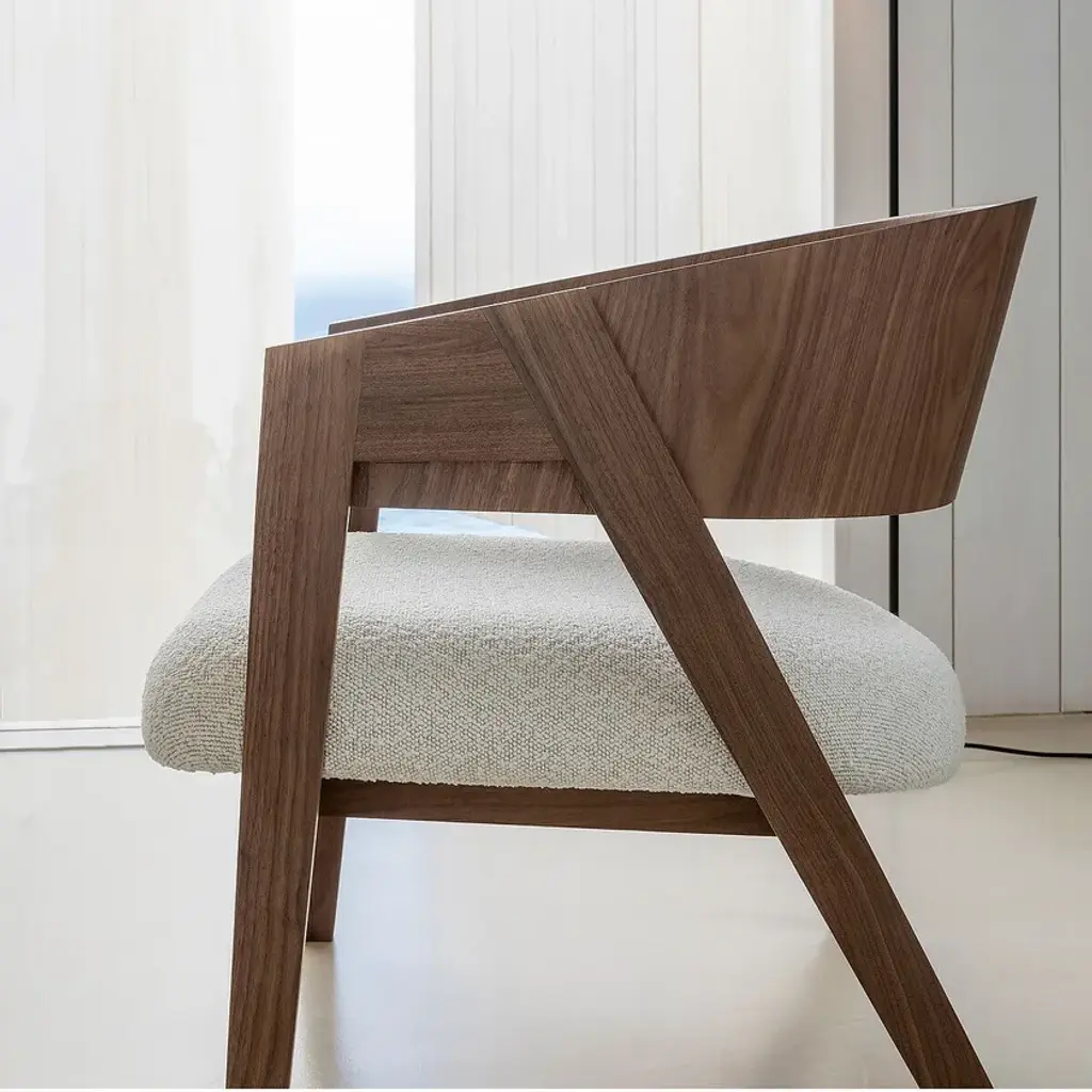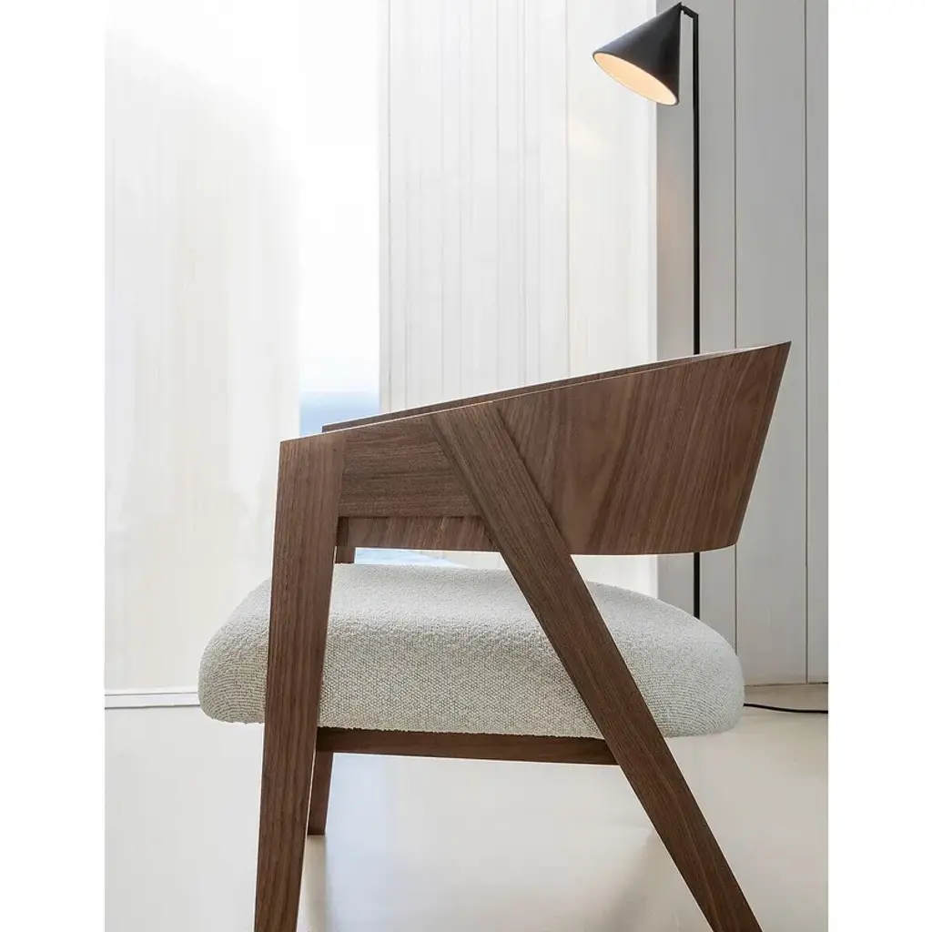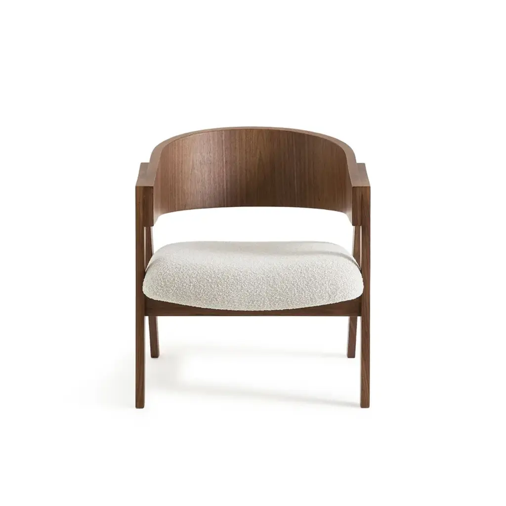 With its modernist elegance which is a sign of the times, its inverted V shape and its curved line, the Charly armchair offers a welcoming and comfortable seat. AMPM signature.Seat comfort: FirmBackrest comfort: FirmSitting: StillCovering in 100% polyester sponge fabric, ecru colourStructure in solid walnut with nitrocellulose finishBackrest in walnut veneered plywood with nitrocellulose finishSeat: plywood covered with 30 kg/m3 polyurethane foam