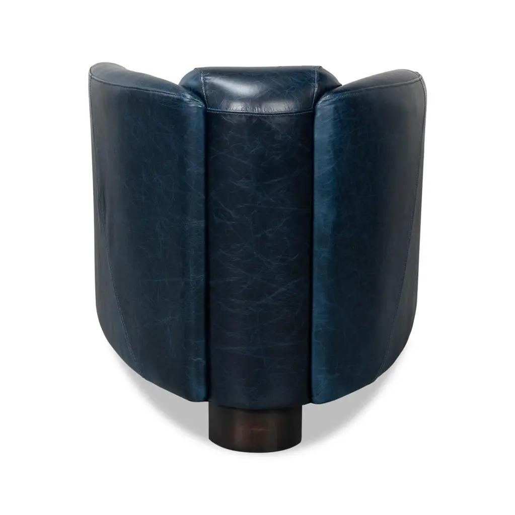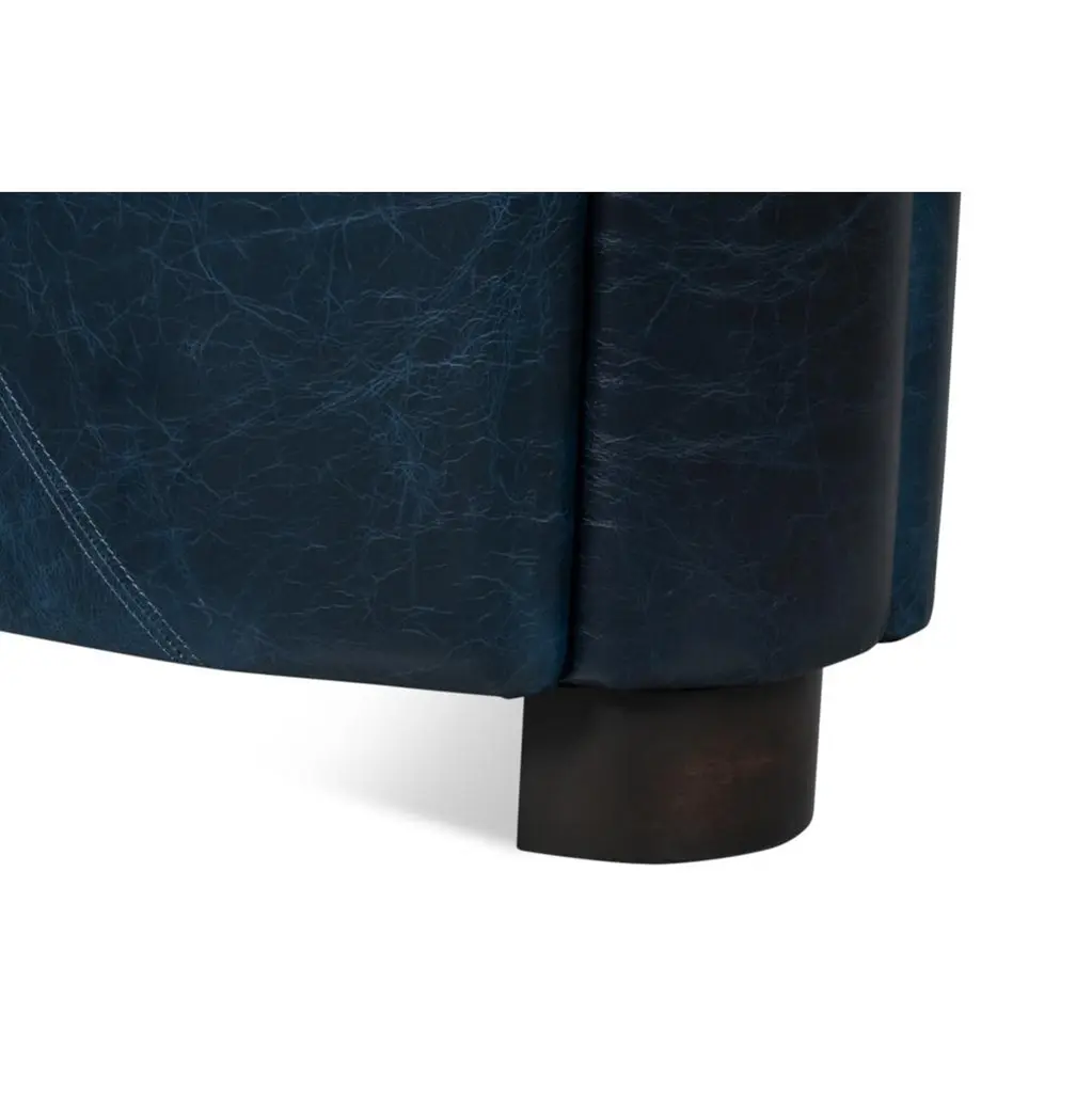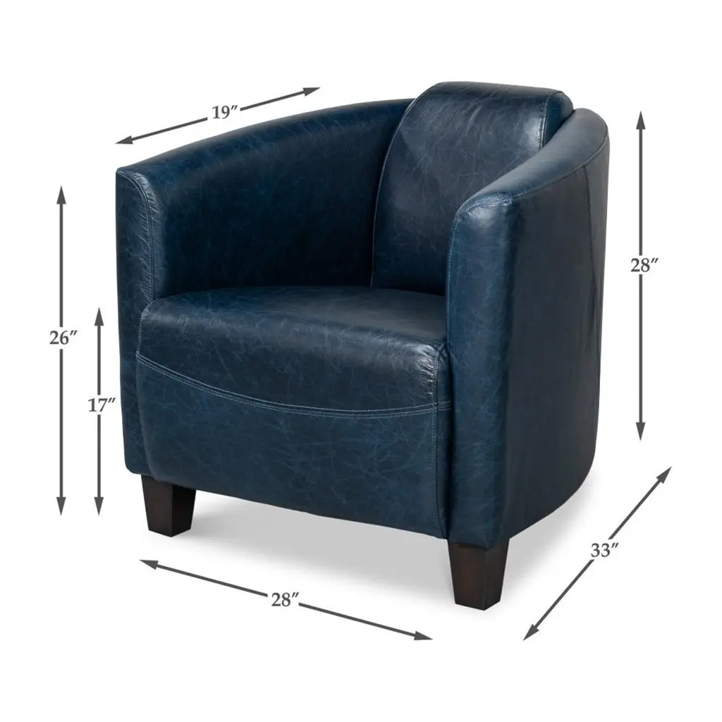Crafted of luxurious top-grain leather in a wonderful blue hue, this stylish and comfortable chair is perfect for your den, library, or living room.Color variation is common and acceptable on vintage leather.Dimensions: 28" W x 33" D x 28" HSeat: 17" H x 19" DArm Height: 26" H