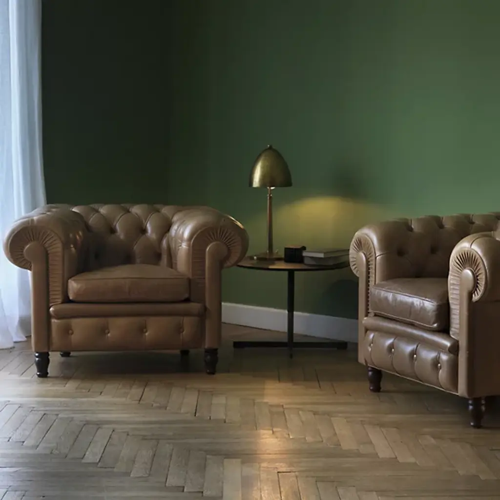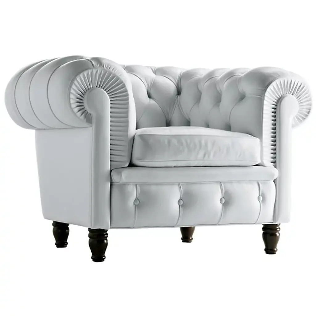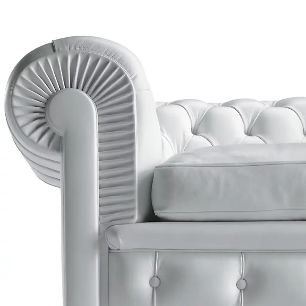 The Chester Armchair by Poltrona Frau epitomizes fine craftsmanship. Revisited by Renzo Frau in 1912, this armchair exudes luxury. Your chair celebrates the style of Edwardian England. Your chair is composed of exquisite leather crafted using the meticulous capitonné process. A narrow seat is bookended by oversized arms featuring beautiful contours. This piece is defined by its elegant, pleated armrests. Tufted buttons add character, while intricate diamond silhouettes draw your gaze. Chester is built with a durable beech frame and biconical springs for optimal performance. A goose-down cushion gives you a comfortable seating experience.