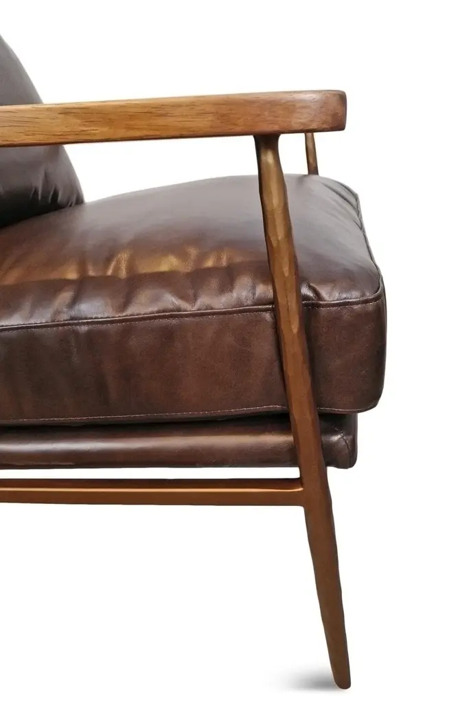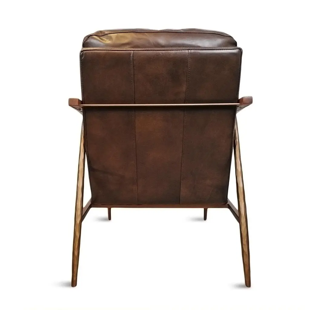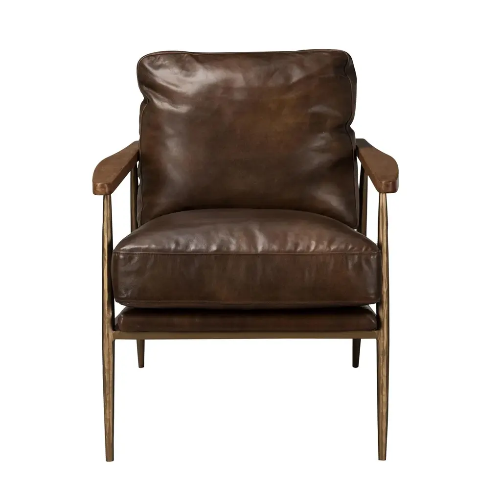 Remake of the classic mid-century den chair. Hand hammered iron frame with matte gold finish, oak arm rests, and top grain natural chestnut color leather seat and back. Each chair may vary in leather tones/grain, wood tones/grain, and exact finish/textures of iron. Seat height is 19" and arm height is 24".