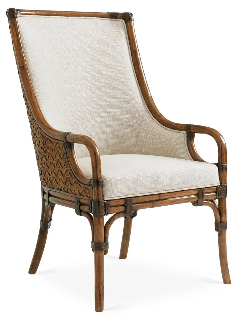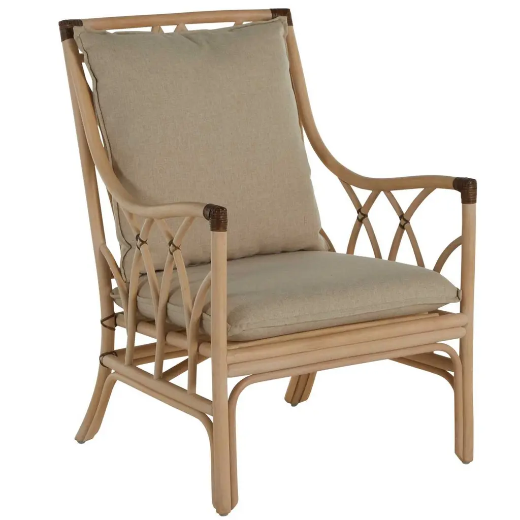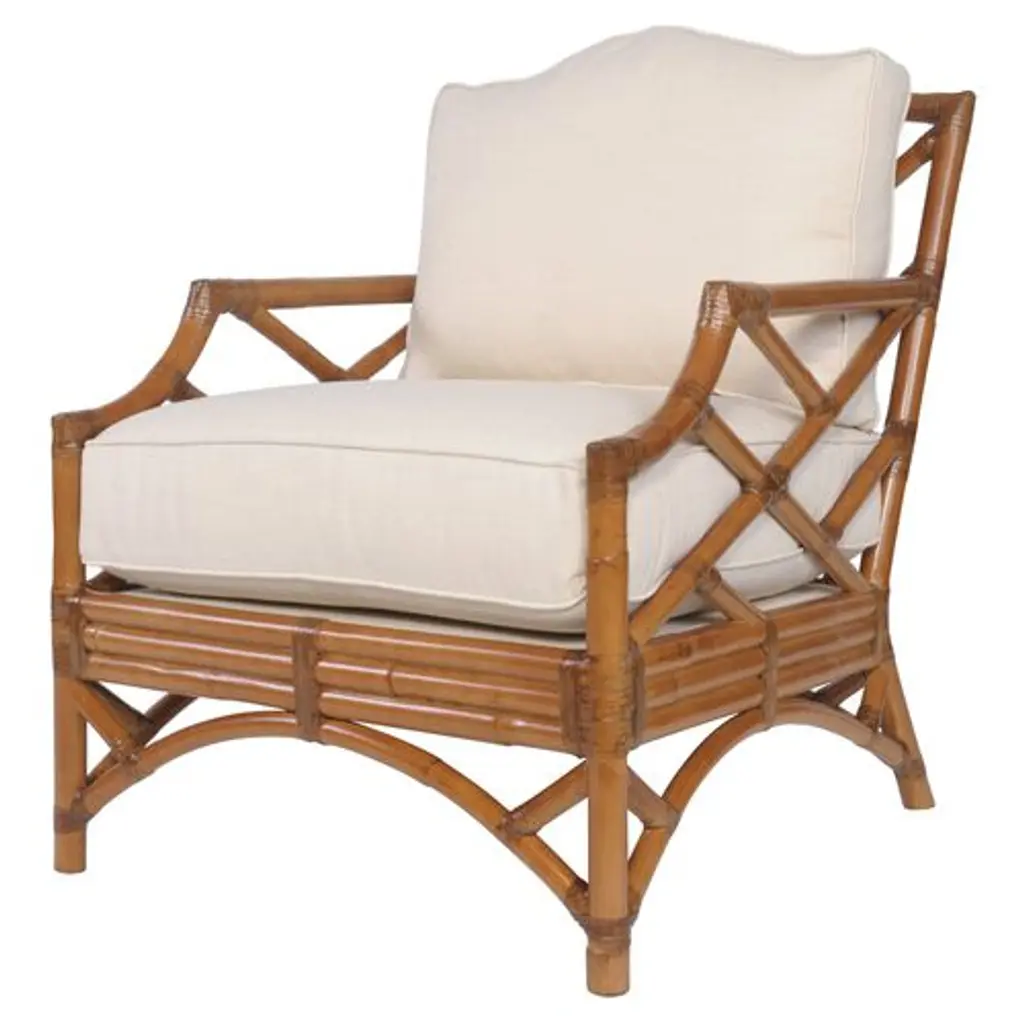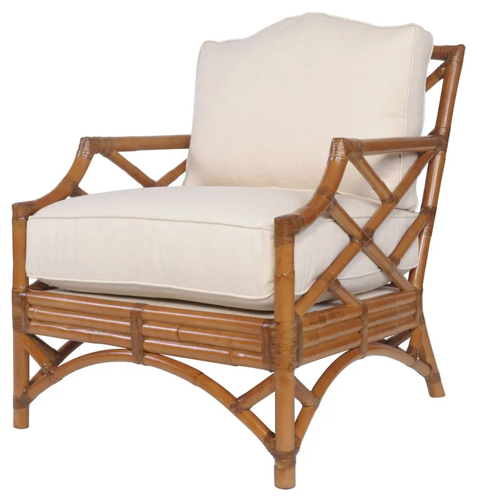 Hand-finished in a gorgeous camel hue, this chair is crafted of rattan with a Chippendale-style design and an upholstered webbed deck. Rawhide-wrapped joints add strength and textural contrast, while amply padded cushions upholstered in linen-blend fabric ensure a comfy seat.