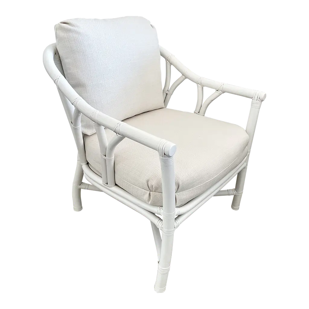 Hand-finished in a gorgeous camel hue, this chair is crafted of rattan with a Chippendale-style design and an upholstered webbed deck. Rawhide-wrapped joints add strength and textural contrast, while amply padded cushions upholstered in linen-blend fabric ensure a comfy seat.