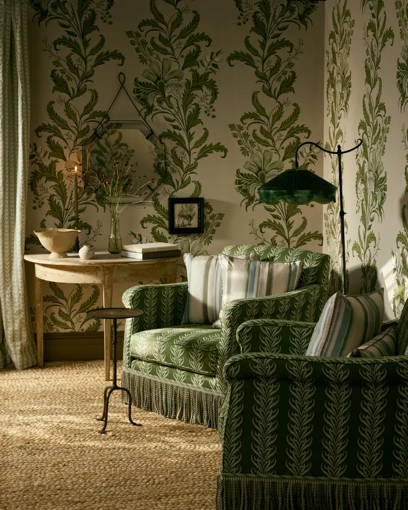 CINNY ArmchairThe CINNY Armchair, upholstered in Lorcan Reverse fabric in Banana Palm, beautifully crafted and designed for style and comfort. Hand sourced and upholstered in Cinny’s signature specification, with a fully upholstered self-piped frame and seat pad, and complimentary Samuel & Sons bullion fringe. We have two Cinny armchairs in stock, they can be brought individually or sold as a pair. We love them with our Marni Provence cushions with co-ordinating pipe to skirt (As seen above) and also available to purchase.