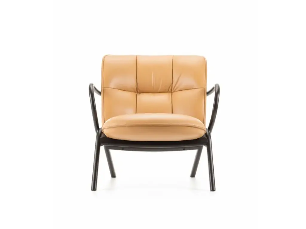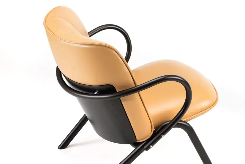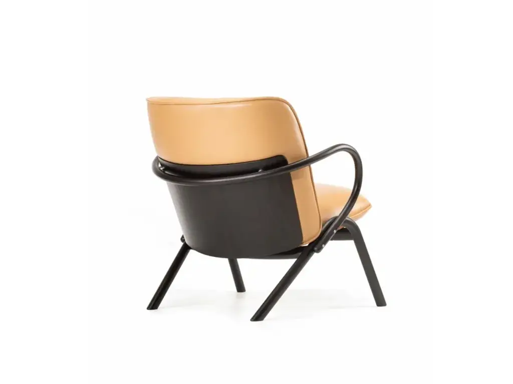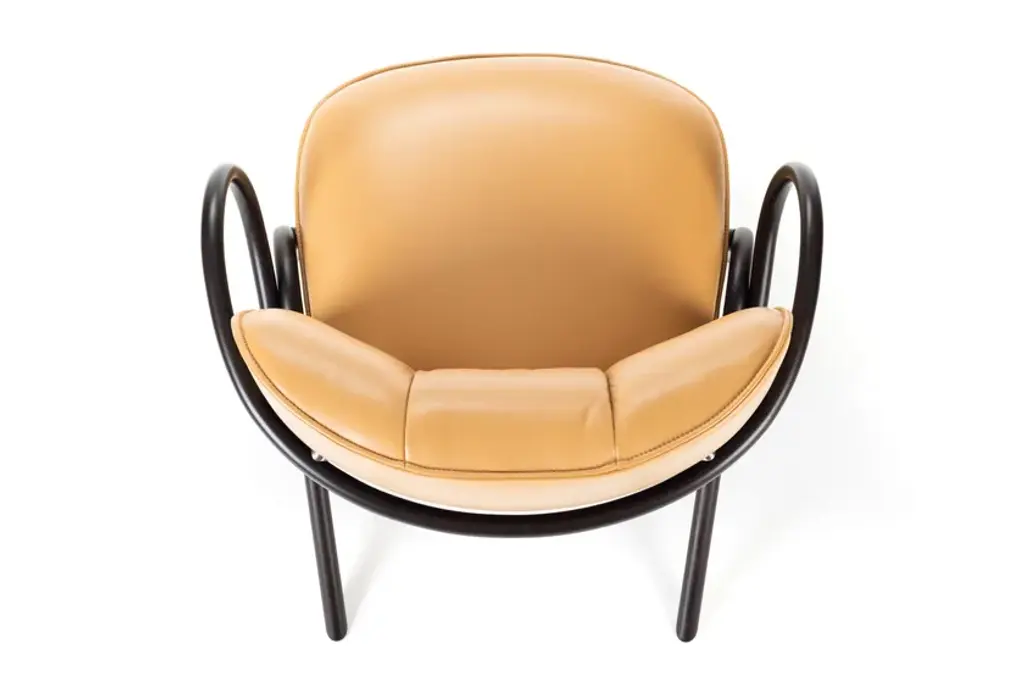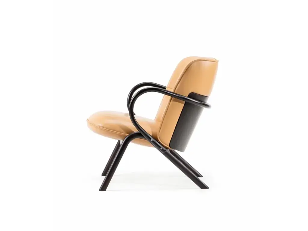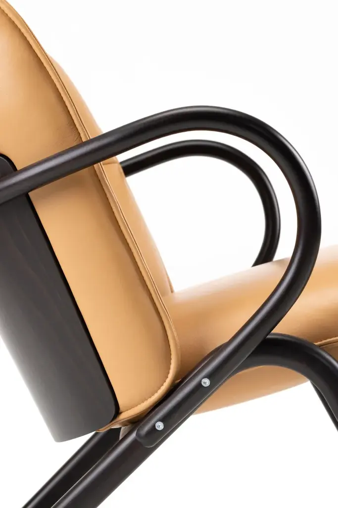 Cissy is a small armchair in beech wood with armrests, featuring a padded seat and backrest upholstered in leather. A chair that doesn't just invite you to sit, it invites you to experience. Cissy is a seamless blend of comfort, craftsmanship and character. Its soft upholstery offers a warm embrace, while the elegant bentwood curves embody the timeless artistry of Ton. Designed for relaxation, Cissy, in either the high or low back version, effortlessly balances heritage with contemporary ease. Paired with a matching footstool, it transforms any space into a sanctuary of comfort.