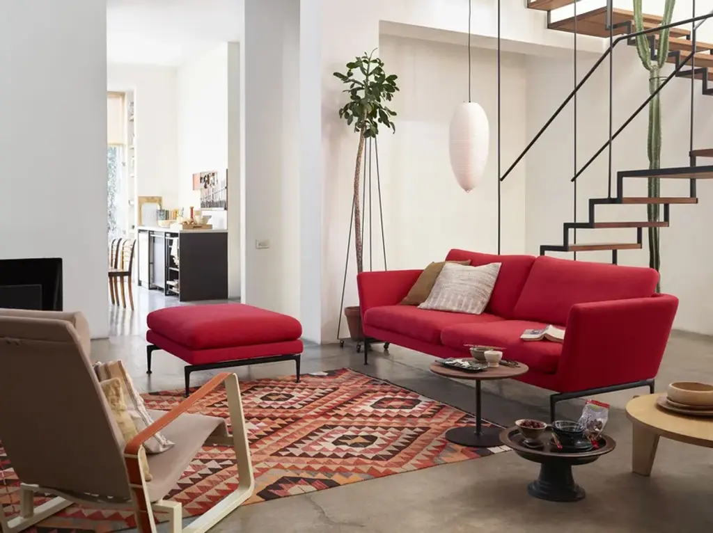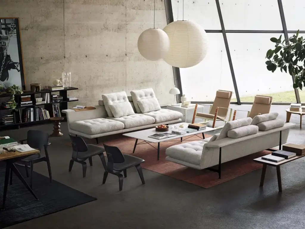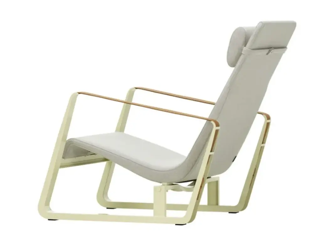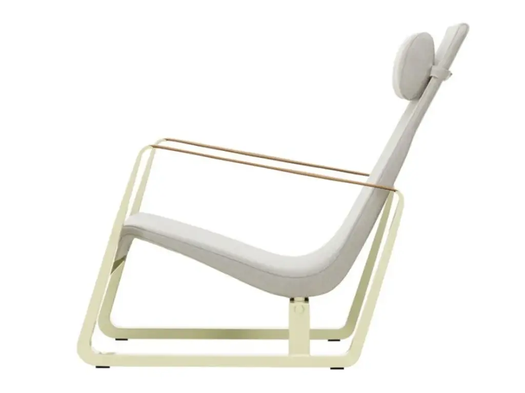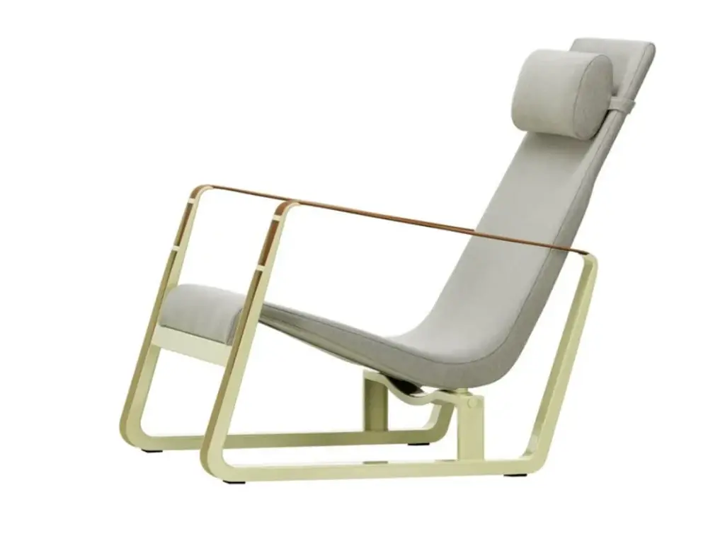 Designed for a competition to furnish the student residence halls at the Cité Universitaire in Nancy, the Cité armchair is one of Jean Prouvé‘s early masterpieces. Prouvé himself used this dynamic looking armchair – with distinctive runners made of powder-coated sheet steel and broad leather belts for armrests – in the living room of his own home. Generous dimensions and inviting upholstery contribute to the great comfort of Cité.Materials:- Cover: seat and backrest with a continuous cover in fabric or leather.- Upholstery: neck cushion in polyurethane foam, height-adjustable.- Base: bent sheet steel, powder-coated finish (smooth).- Glides: fitted with plastic glides for carpet; felt glides for hard floors optionally available.