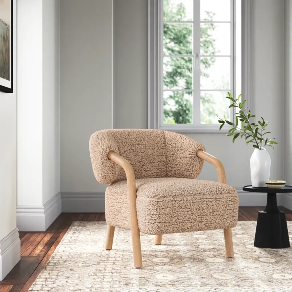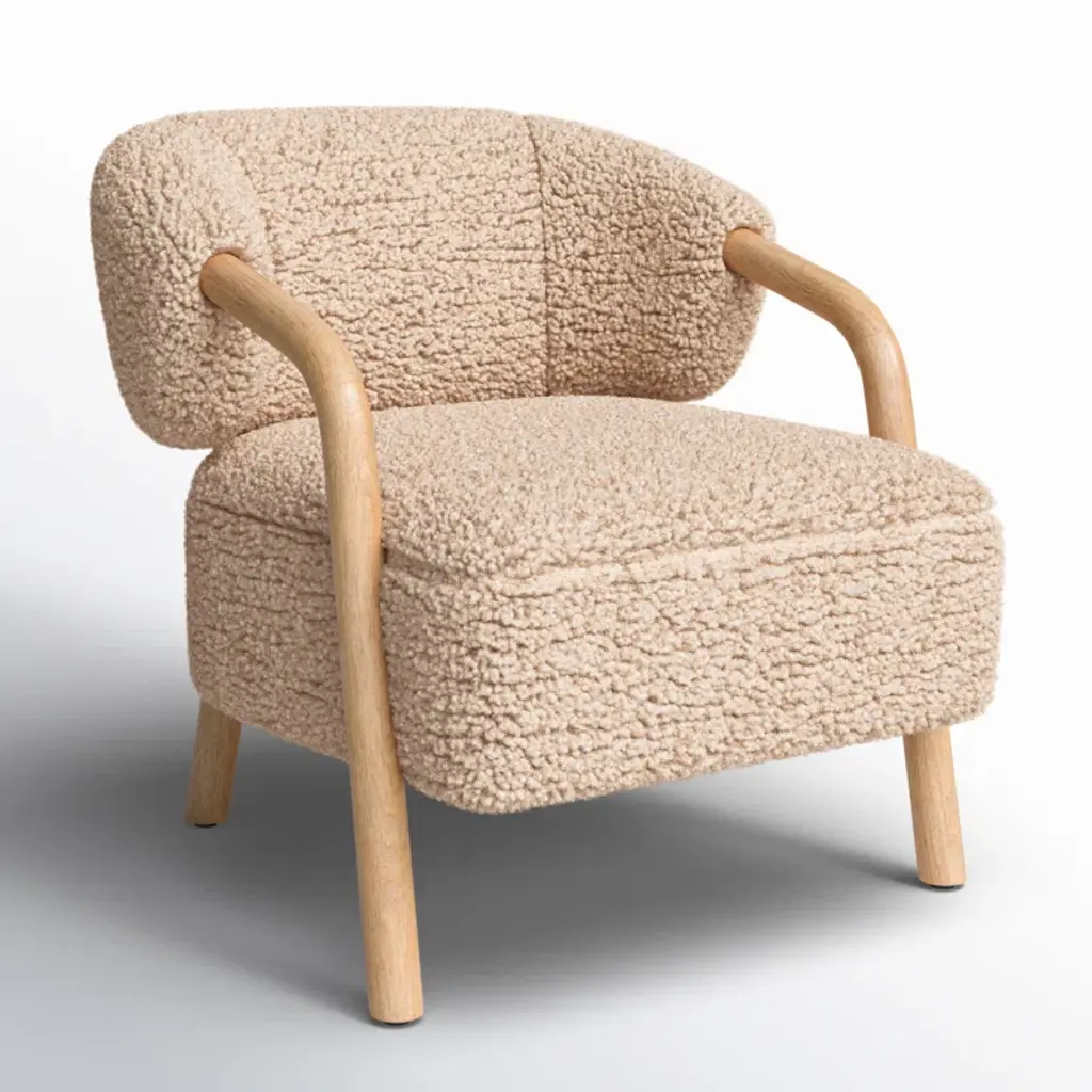 Cozy meets modern. Our sculpted armchair, inspired by 1970s seating, features a high-pile texture and bulky forms for ultimate relaxation. The solid oak frame in brown beautifully complements the soft, neutral upholstery. Round arms and a tight back create a welcoming silhouette, while sinuous springs and fiber-wrapped foam cushions offer comfort and support. This armchair is a stylish addition to any living space. Arrives fully assembled.
