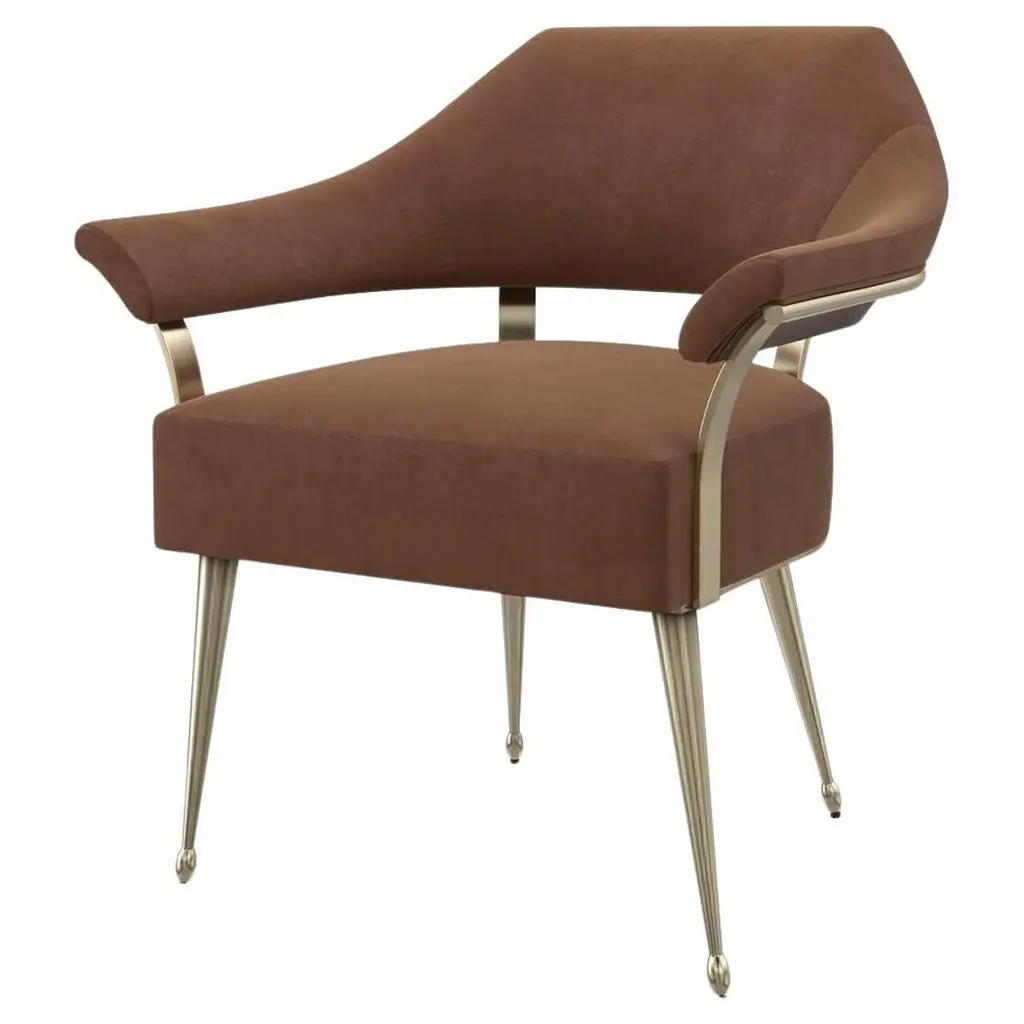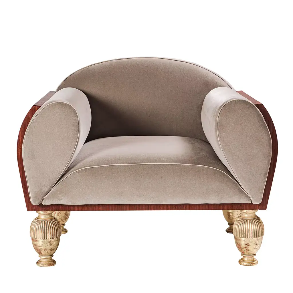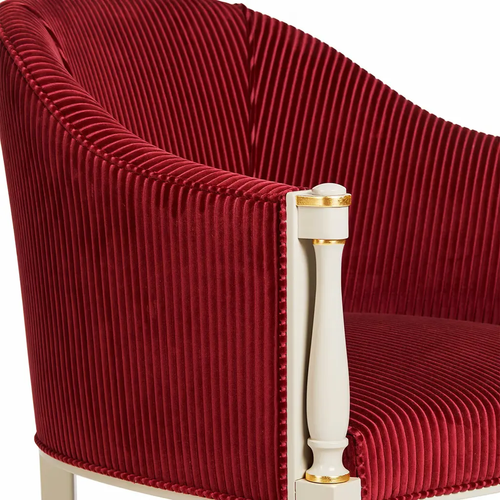 An enveloping shell luxuriously upholstered with grooved crimson-hued fabric distills this armchair's sartorial allure at first glance. Plush and exclusive, its beech structure reveals its grace through the minutely turned legs accented with golden details. The generous padding underlying the textured cover contributes to the long-lasting comfort this superb armchair ensures.
