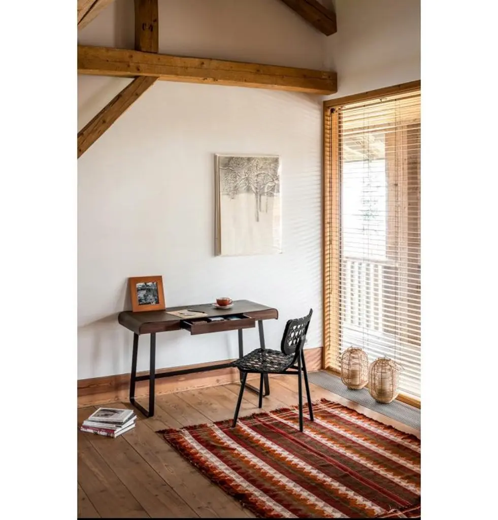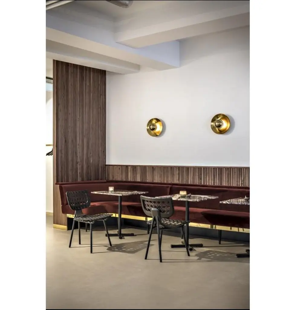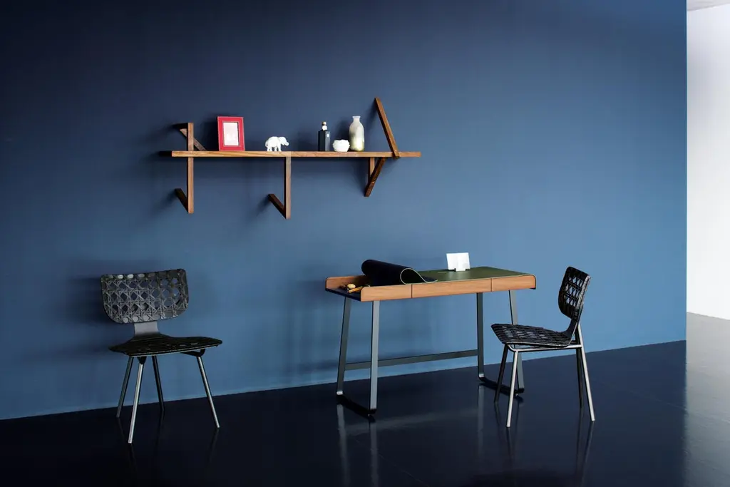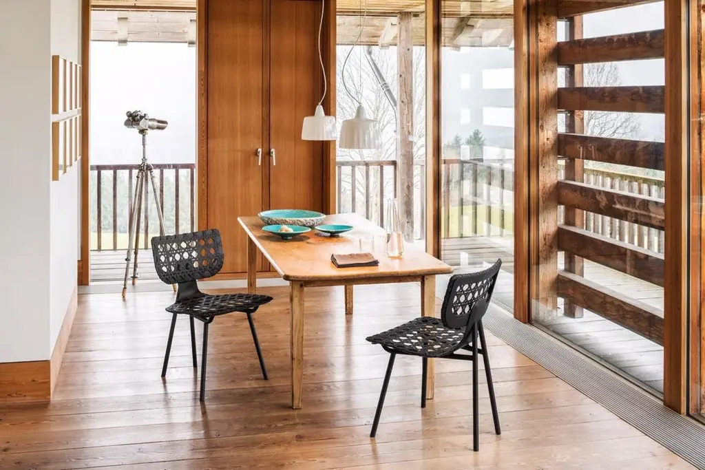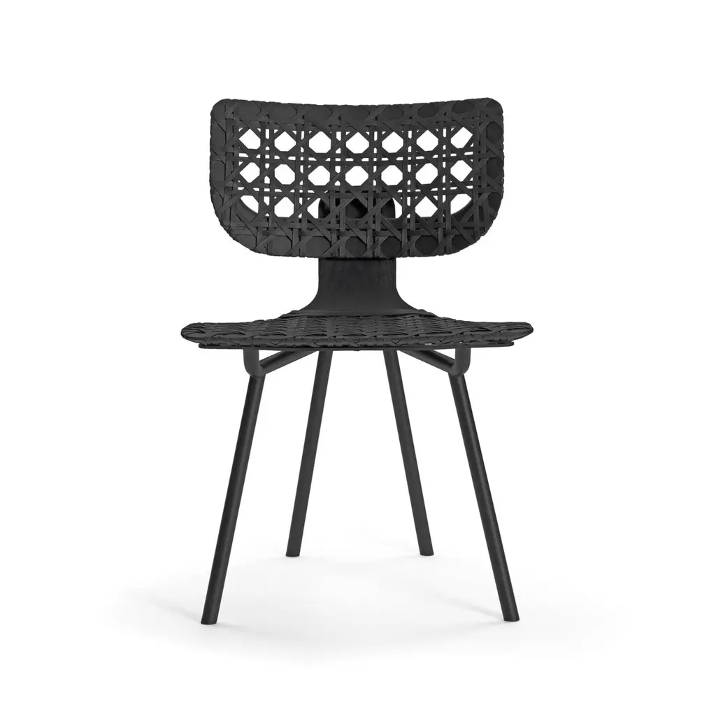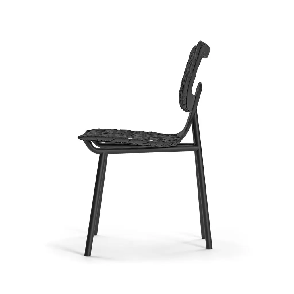 Aërias surprises with formal conciseness, lightness and innovative weaving: the familiar pattern of the Vienna wickerwork is reinterpreted with a changed scale and leather as a material. Just as the look of a type font changes depending on its size, the traditional weaving used for Aërias also gains character due to the multiple enlargement of the pattern. The high sitting comfort results from the leather straps stretched on a wooden frame. Similar to the leather stretched on a drum, the result is flexing minimal surfaces absorbing the movements of the body and making sitting and leaning back especially comfortable. High-quality craftsmanship skills are required for executing the traditional weaving technique in this format with leather straps. The graphic appearance of the pattern is enhanced by the optional use of leather in two different colors. As a chair or lounge chair, Aërias is an adaptable companion in private or public spaces. It is also suitable as an attractive Stand-alone piece, with its leather weaving casting interesting shadows on its environment.Frame powder-coated tubular steel. Seat and backrest frame made of molded wood, lacquered, stretched with interwoven leather straps. Leather weaving optionally in one or two colors. Felt or plastic gliders, replaceable. Dimensions: W 55 cm, D 54 cm, H 82 cm, SH 46 cm.