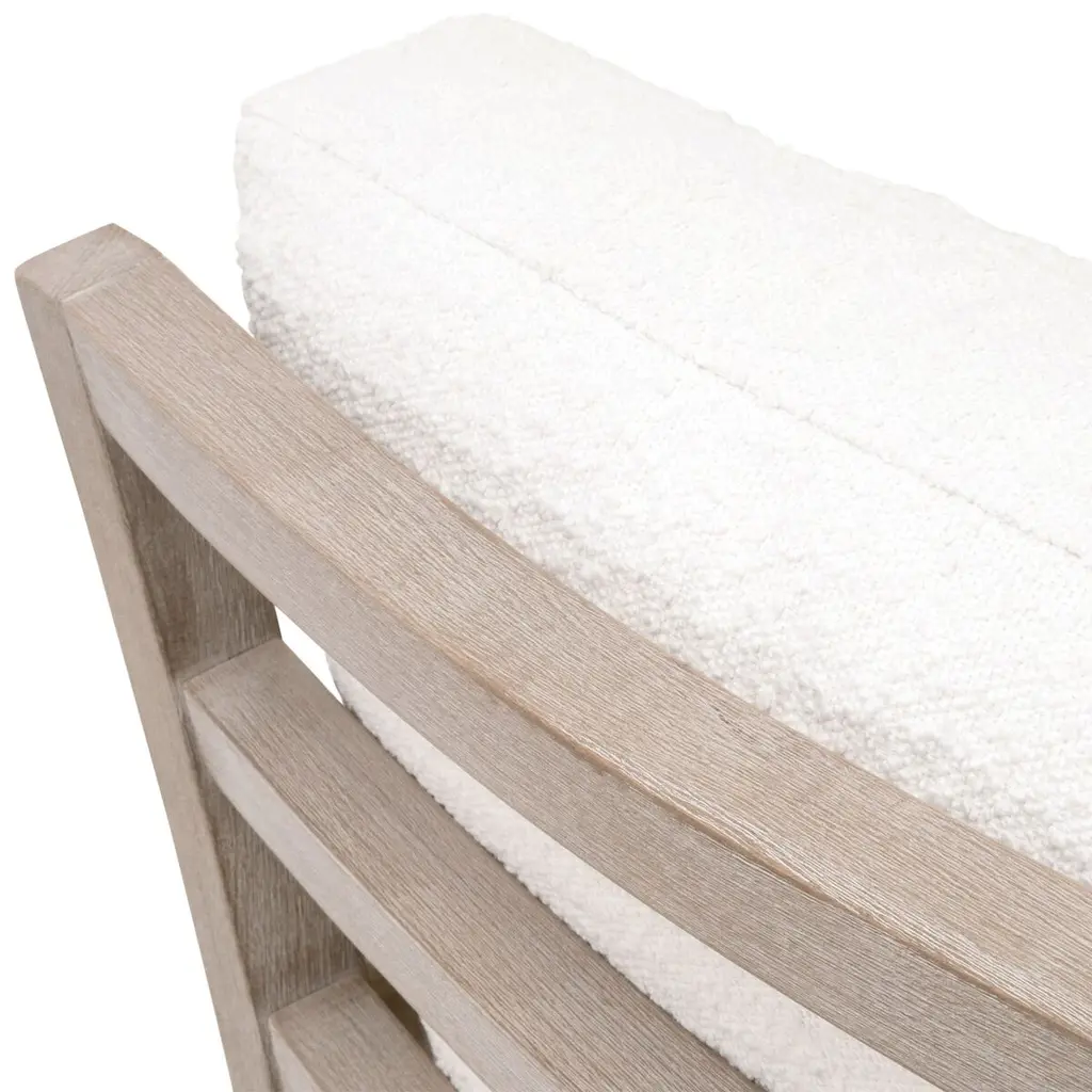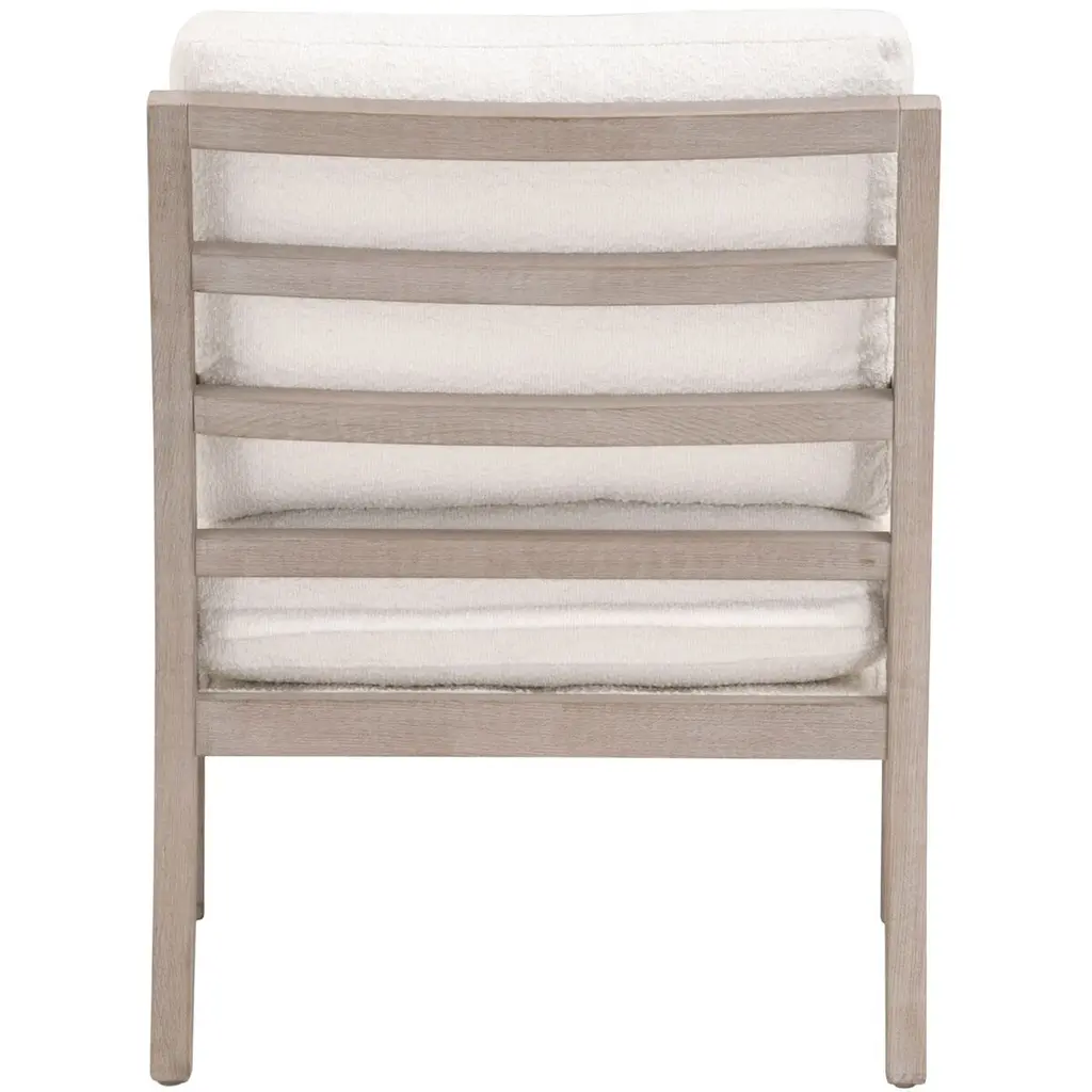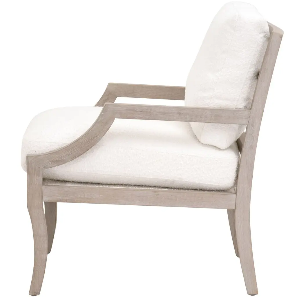This club chair features removable and reversible seat and back cushions made of a high-performance white boucle upholstery and a Dacron feather blend filling. The gorgeous soft white boucle cushions pair nicely with the natural gray tones of the sleek beech wood frame. The frame is constructed with a slatted seat back, curved legs and arm rests featuring a concaved curve design. The light and calming tones of this chair make it an inviting place to sit and enjoy your time. This club chair will be the perfect accent seating in an airy room filled with light and neutral tones.