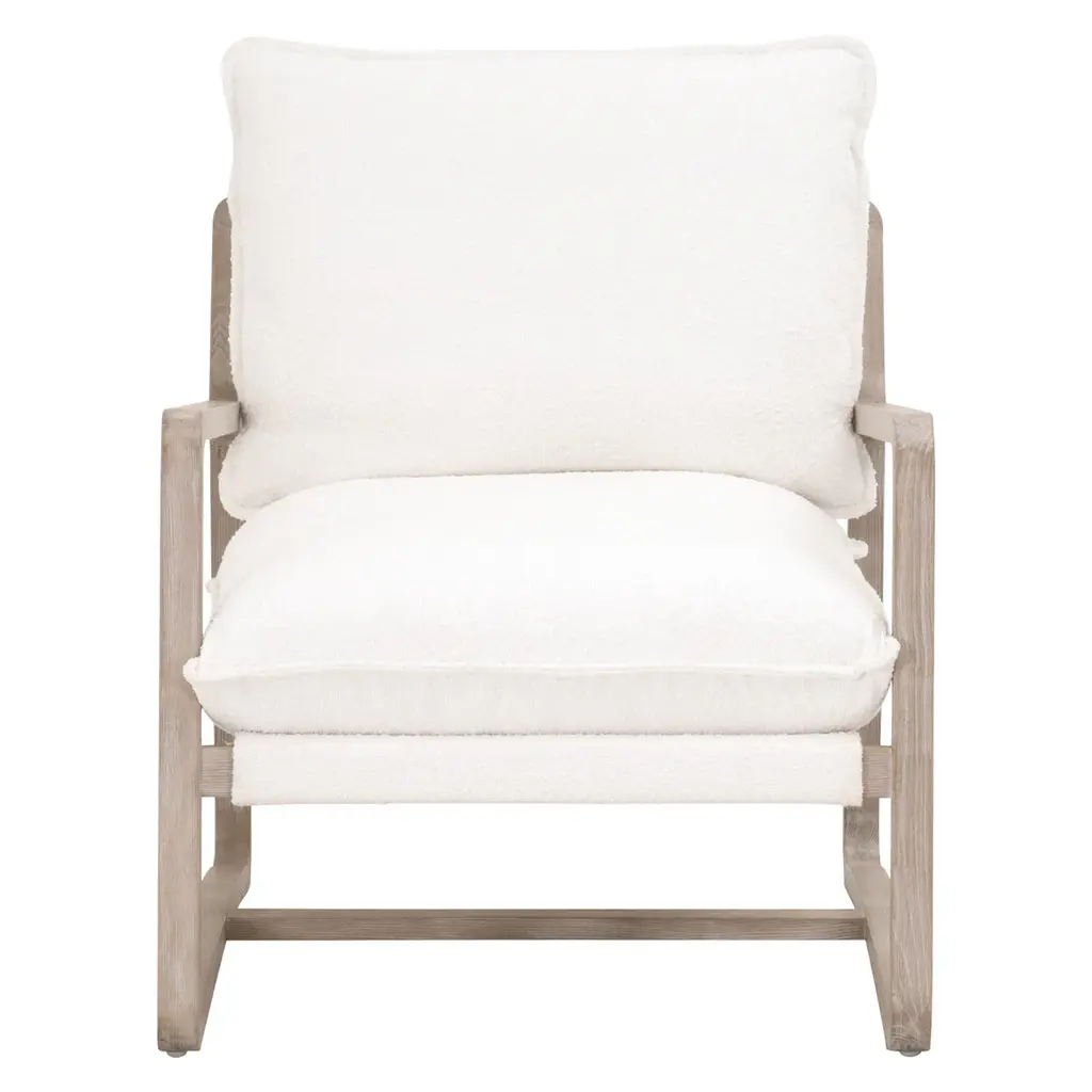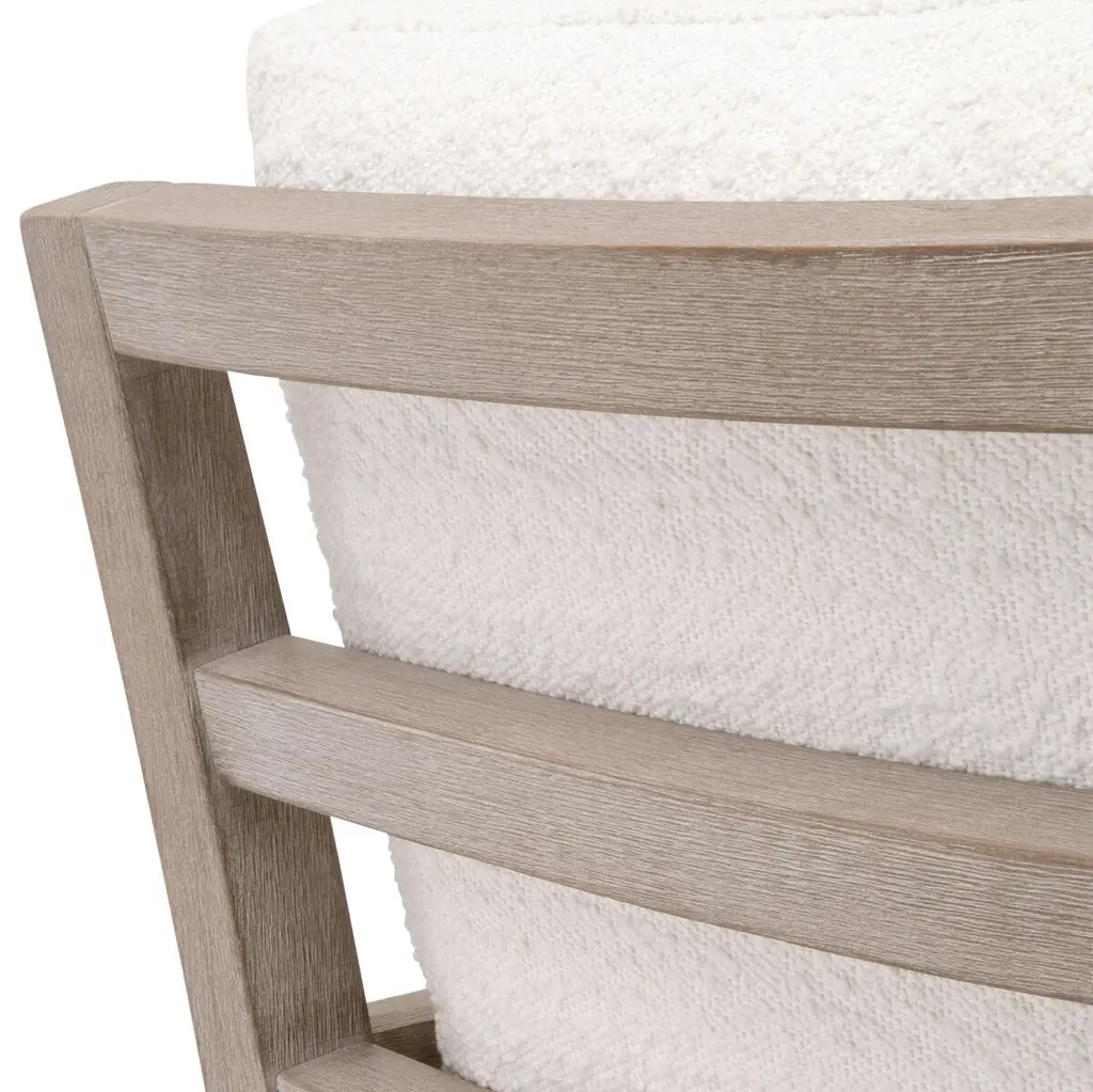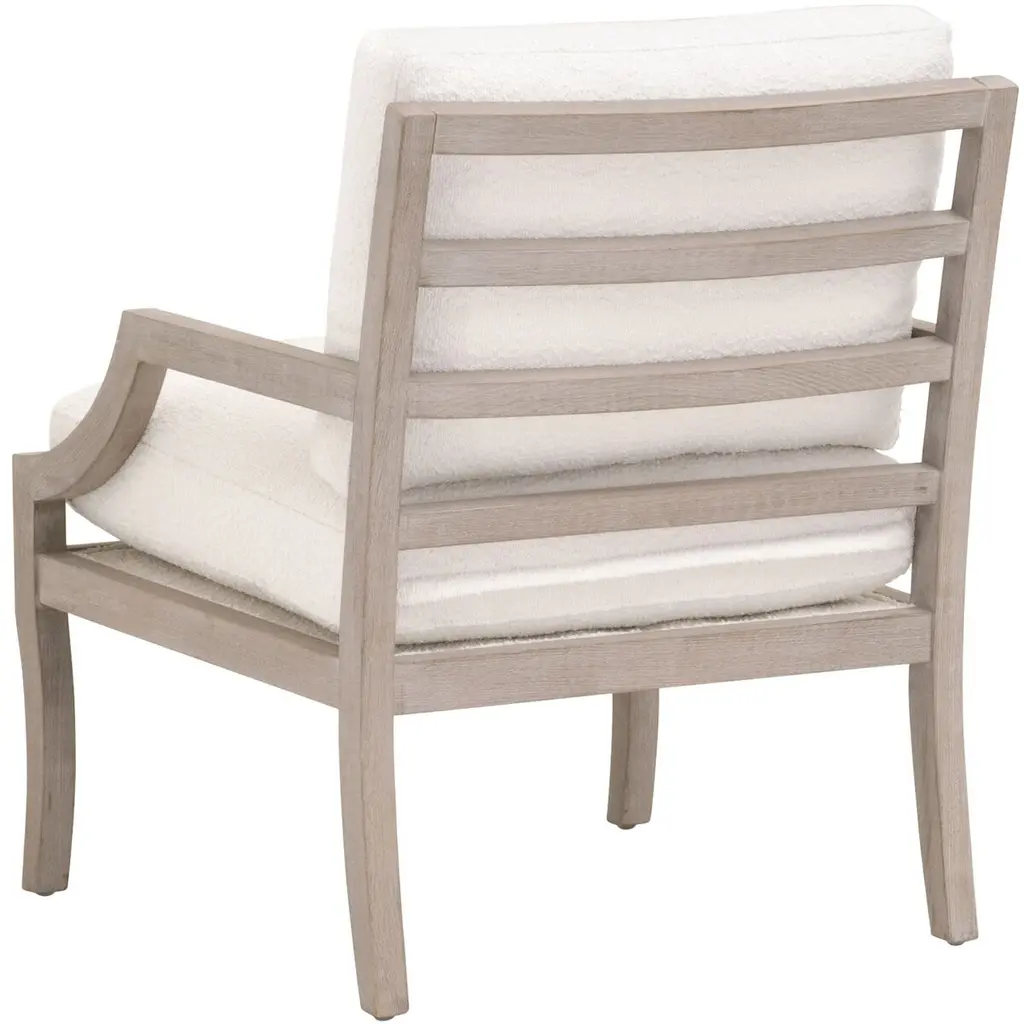 This club chair features removable and reversible seat and back cushions made of a high-performance white boucle upholstery and a Dacron feather blend filling. The gorgeous soft white boucle cushions pair nicely with the natural gray tones of the sleek beech wood frame. The frame is constructed with a slatted seat back, curved legs and arm rests featuring a concaved curve design. The light and calming tones of this chair make it an inviting place to sit and enjoy your time. This club chair will be the perfect accent seating in an airy room filled with light and neutral tones.