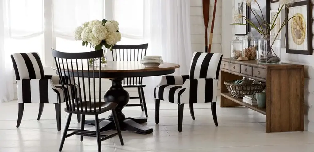 Dinner party or cozy night in—however it’s used, the Clinton host chair is bound to become a favorite seat at the table. Atop its slim, tapered legs, Clinton's simple, clean lines are an inviting canvas for pattern, color, or even leather in the dining room. Also available: Clinton dining bench (202067) and side chair (202068).