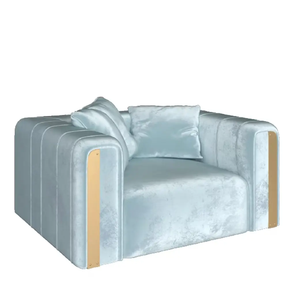 Ideally paired with the Clizia Sofa to create a welcoming and exceptionally refined living room, this stunning armchair combines excellent comfort with an elegant aesthetic. Entirely upholstered with beige fabric, the piece is exquisitely adorned with shiny brass inserts marking the front of each armrest. Please ask the Concierge for further information on materials and possible customizations.