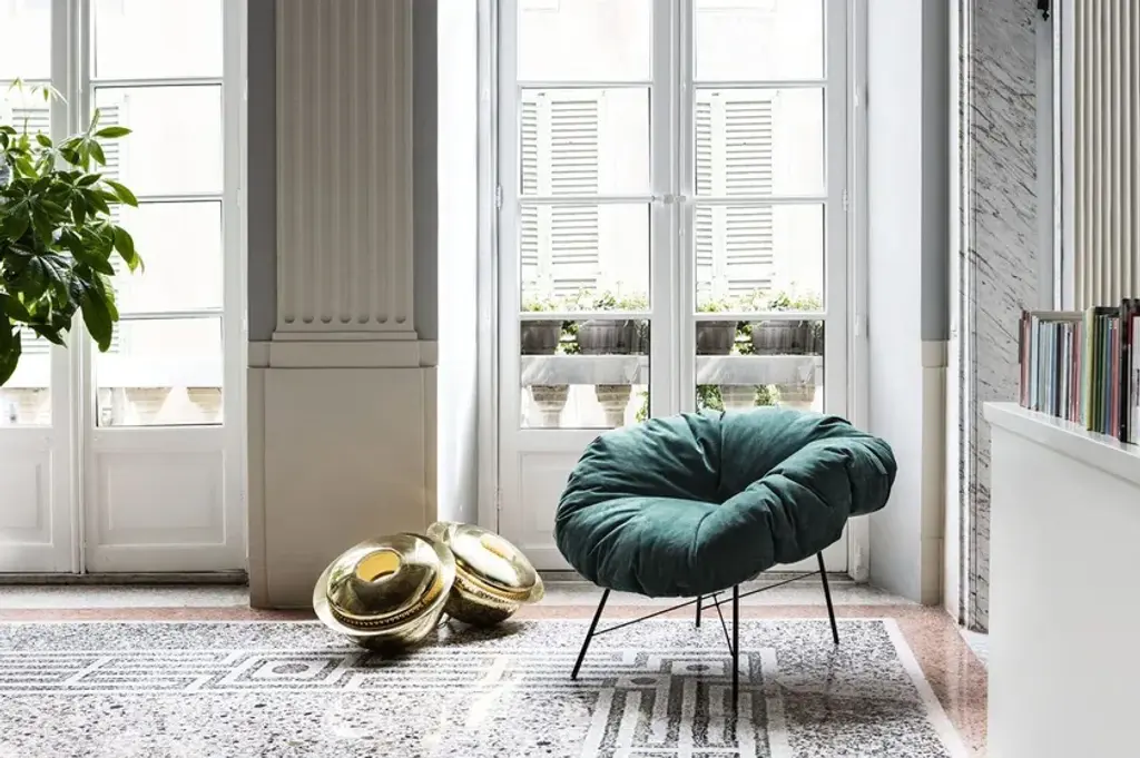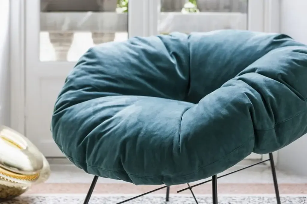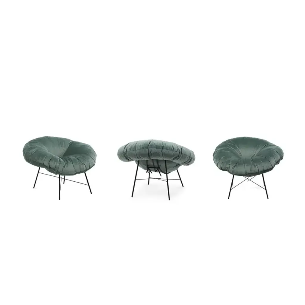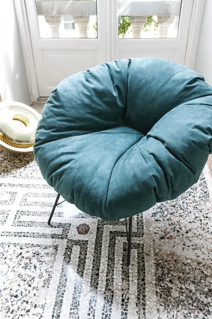 Closer is a small armchair with a matte black painted iron frame and a feather-filled cushion with a removable cover, fixed in the leather version. A slender yet extremely sturdy metal structure supports the large, enveloping cushion with its generous shape.