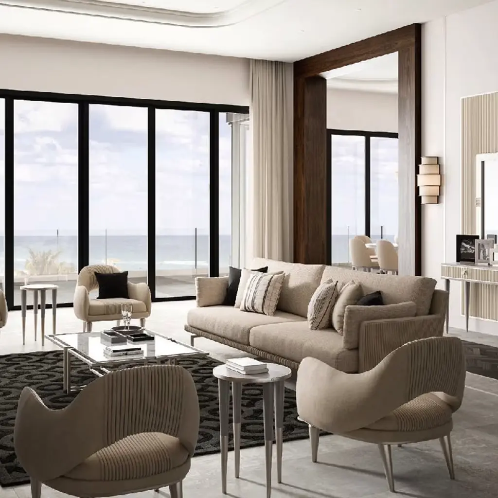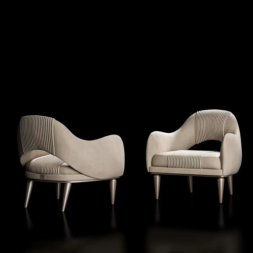 An effortless union of modern sensibility and traditional craftsmanship, this armchair exudes comfort and style. The barrel-shaped frame, with its open back and embracing arms, is entirely upholstered with fine nabuk leather in a delicate and versatile beige color. An eye-catching band of cannette embroidery runs vertically from the backrest to the front seat, adding a glamorous accent to the central band. The tapered, conical feet are made of wood in a matching gray color. As a standalone statement or in a pair, this armchair will transform a study, living room, or guestroom.