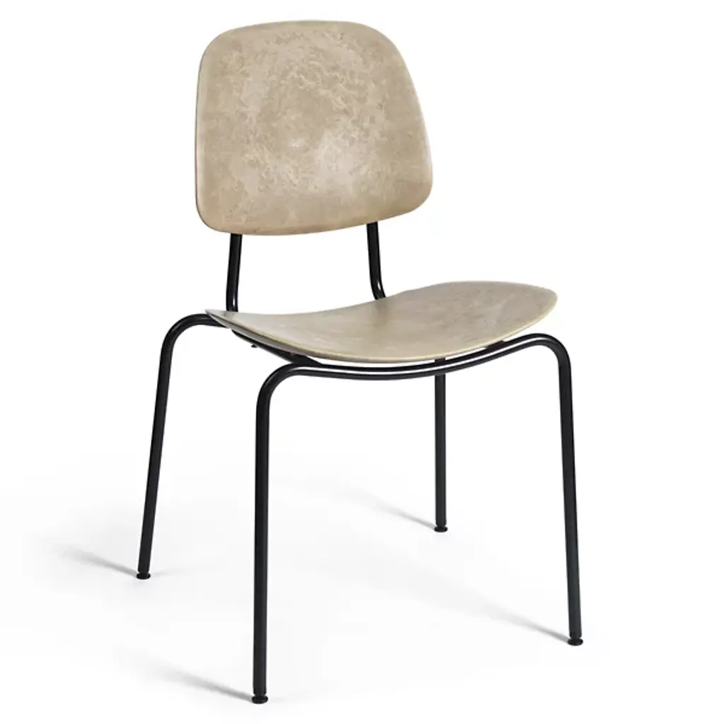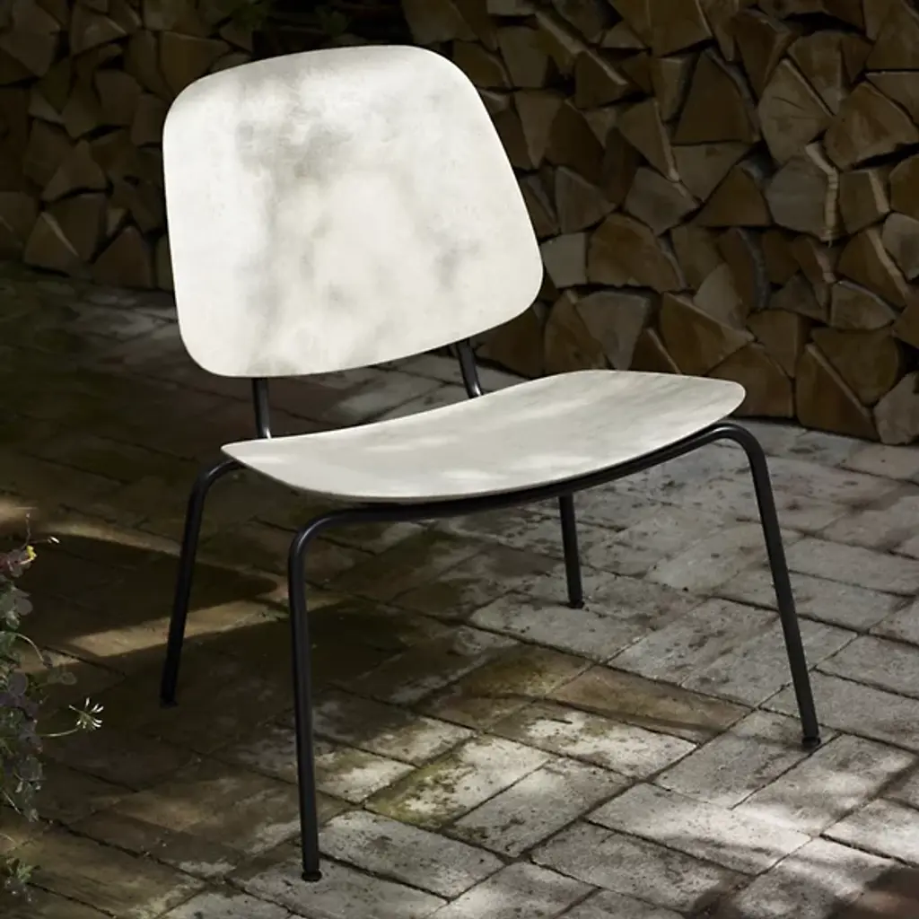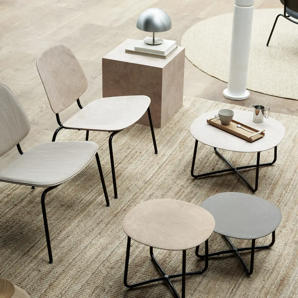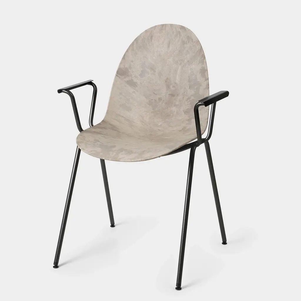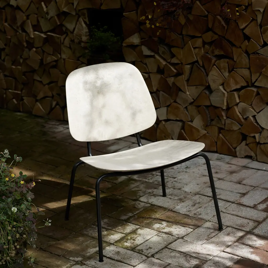 The Compound Lounge Chair features a frame made from 20% recycled steel, supporting a seat and back crafted from Matek®—a proprietary material that blends coffee shell waste, wood waste, and industrial plastic waste. Designed by OEO Studio, the chair's minimalist structure offers comfort suitable for both private and public settings. It is available in various Matek® blends, and is stackable up to four chairs.