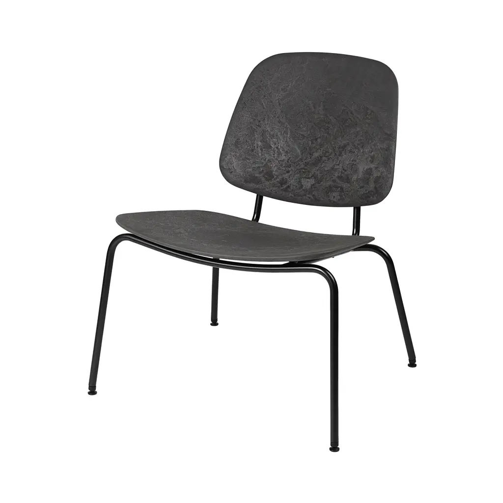 The Compound Lounge Chair features a frame made from 20% recycled steel, supporting a seat and back crafted from Matek®—a proprietary material that blends coffee shell waste, wood waste, and industrial plastic waste. Designed by OEO Studio, the chair's minimalist structure offers comfort suitable for both private and public settings. It is available in various Matek® blends, and is stackable up to four chairs.