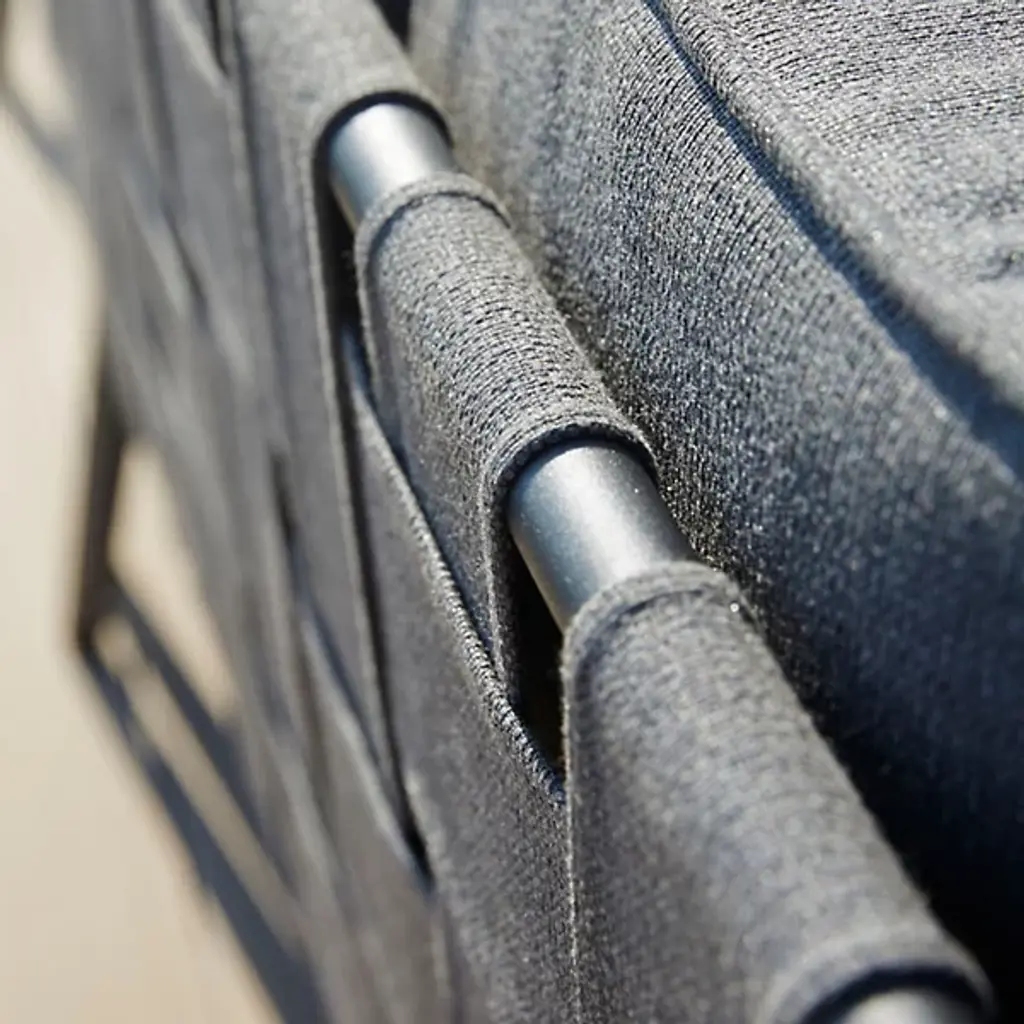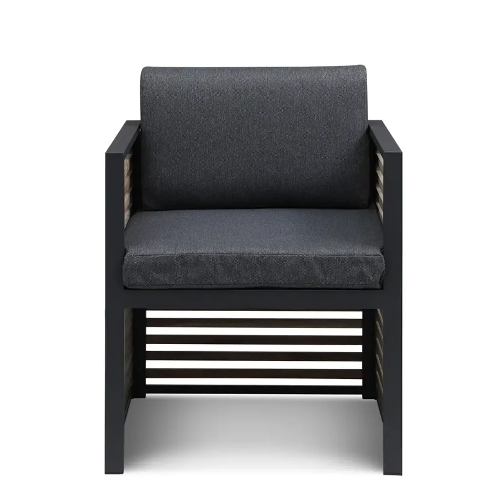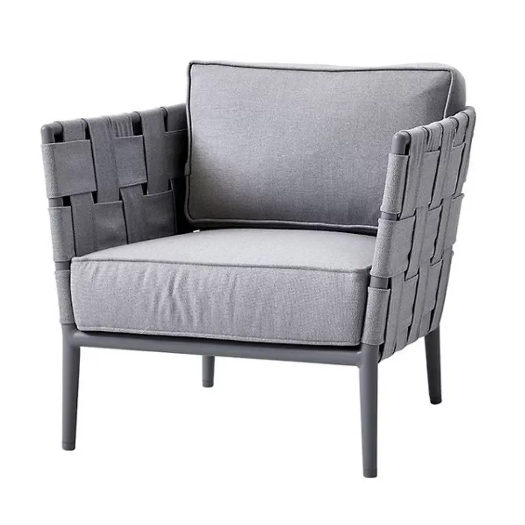 The CConic Outdoor Lounge Chair is part of a modular outdoor lounge group distinguished by plush upholstery and a frame made out of conic pipes. The unique frame is enhanced, yet remains airy-feeling, with woven straps made out of weatherproof Cane-line Tex. The frame finish matches the color of the Cane-line SoftTouch fabric upholstery.