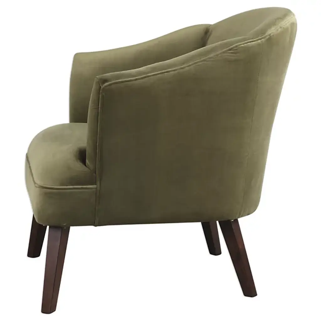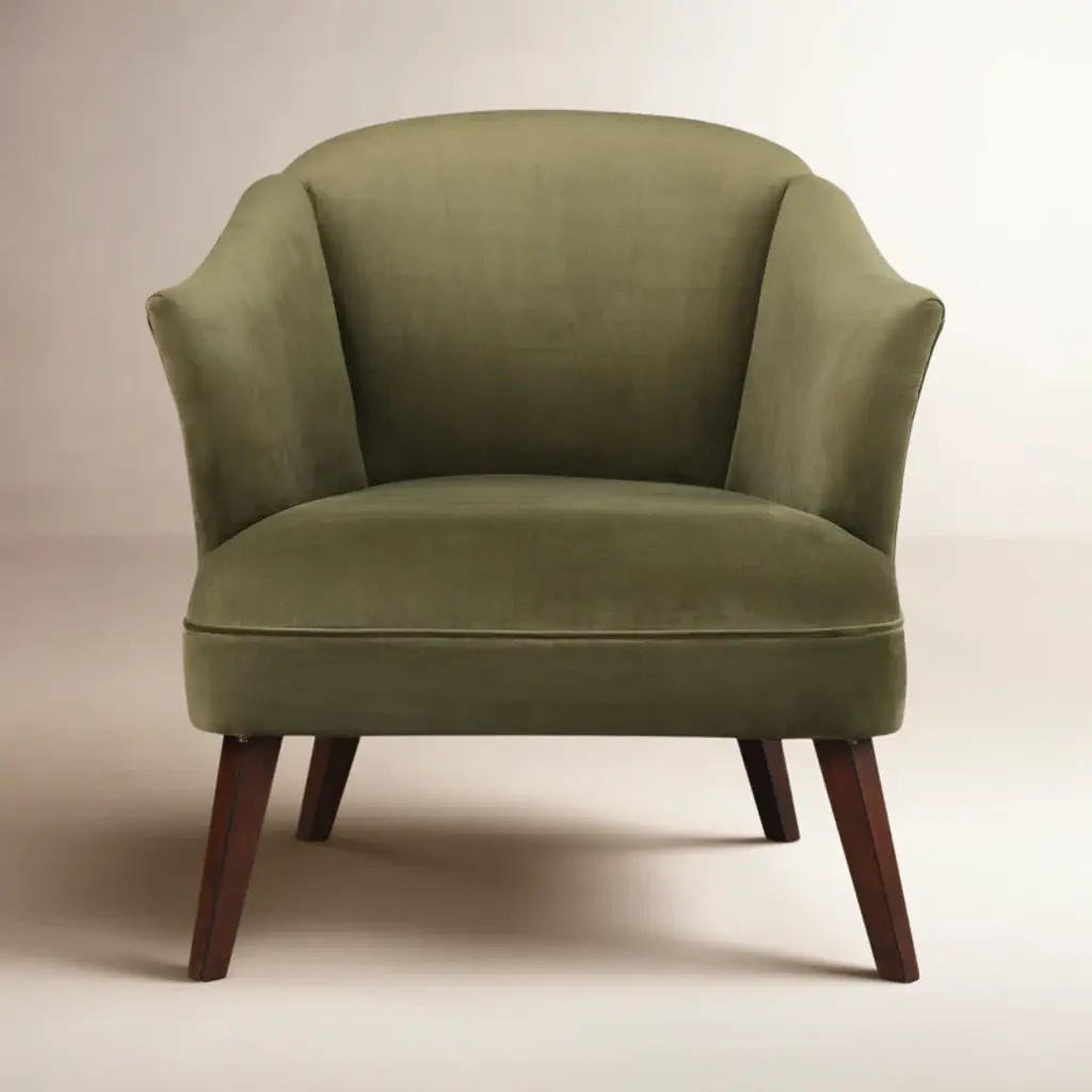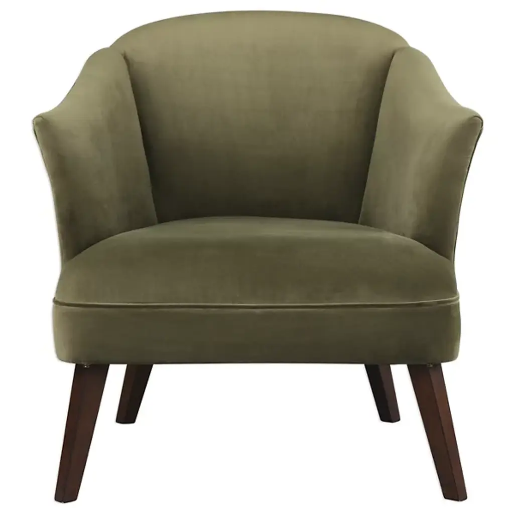 The Conroy Accent Chair from Uttermost is an impeccable blend of premium materials and distinctive high-style design artfully crafted by renowned designer Jim Parsons. The inviting allure of the barrel back style accent chair is enveloped in a luxurious soft olive-toned polyester velvet fabric, elegantly accented with welt trim. The cozy and sophisticated appeal is complemented by tapered birch legs in a rich dark walnut finish, adding a touch of timeless elegance to any space.