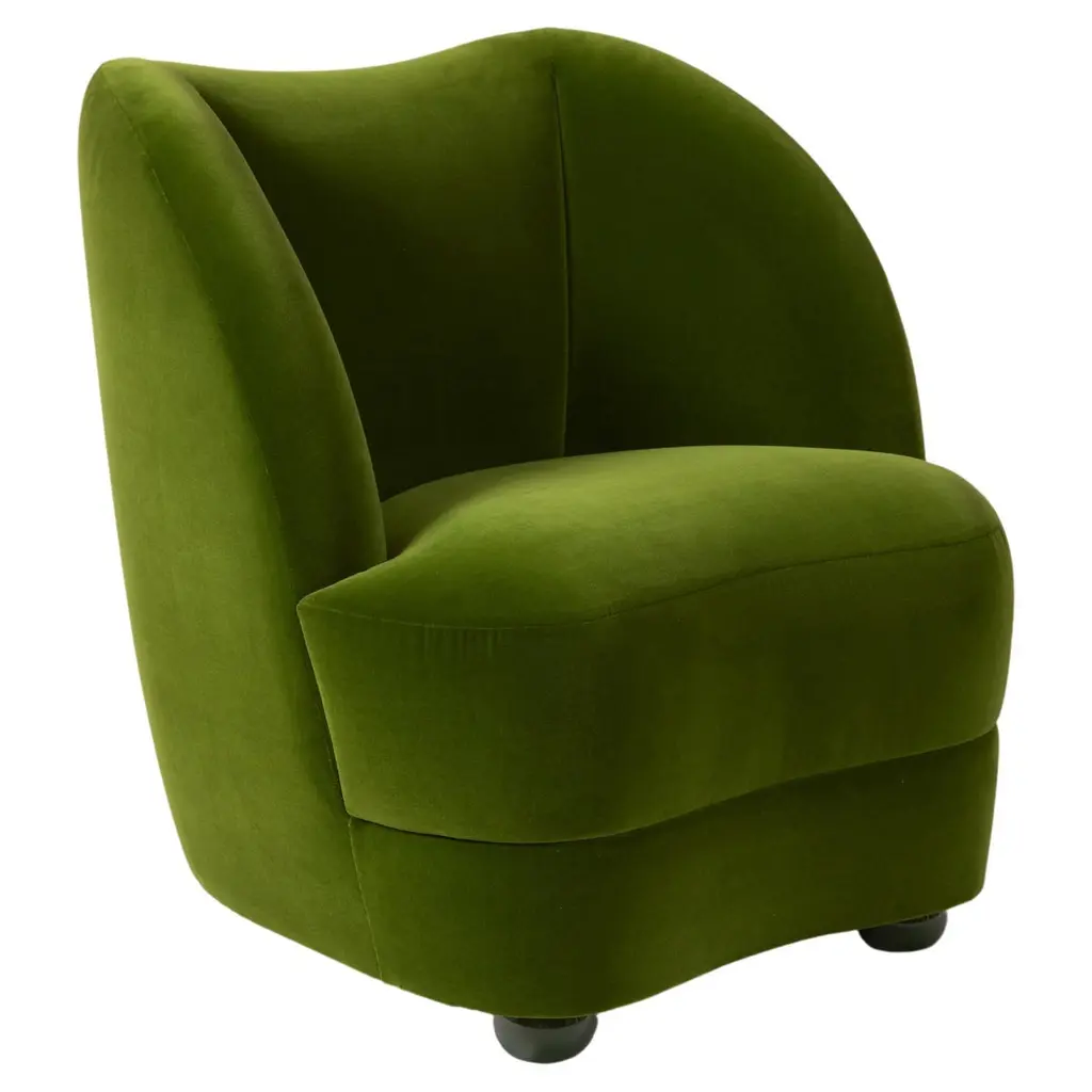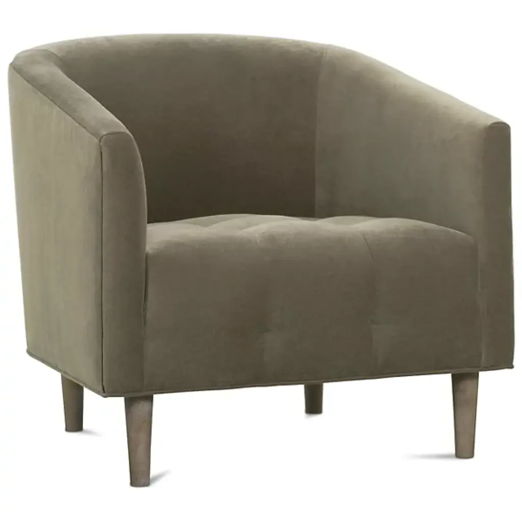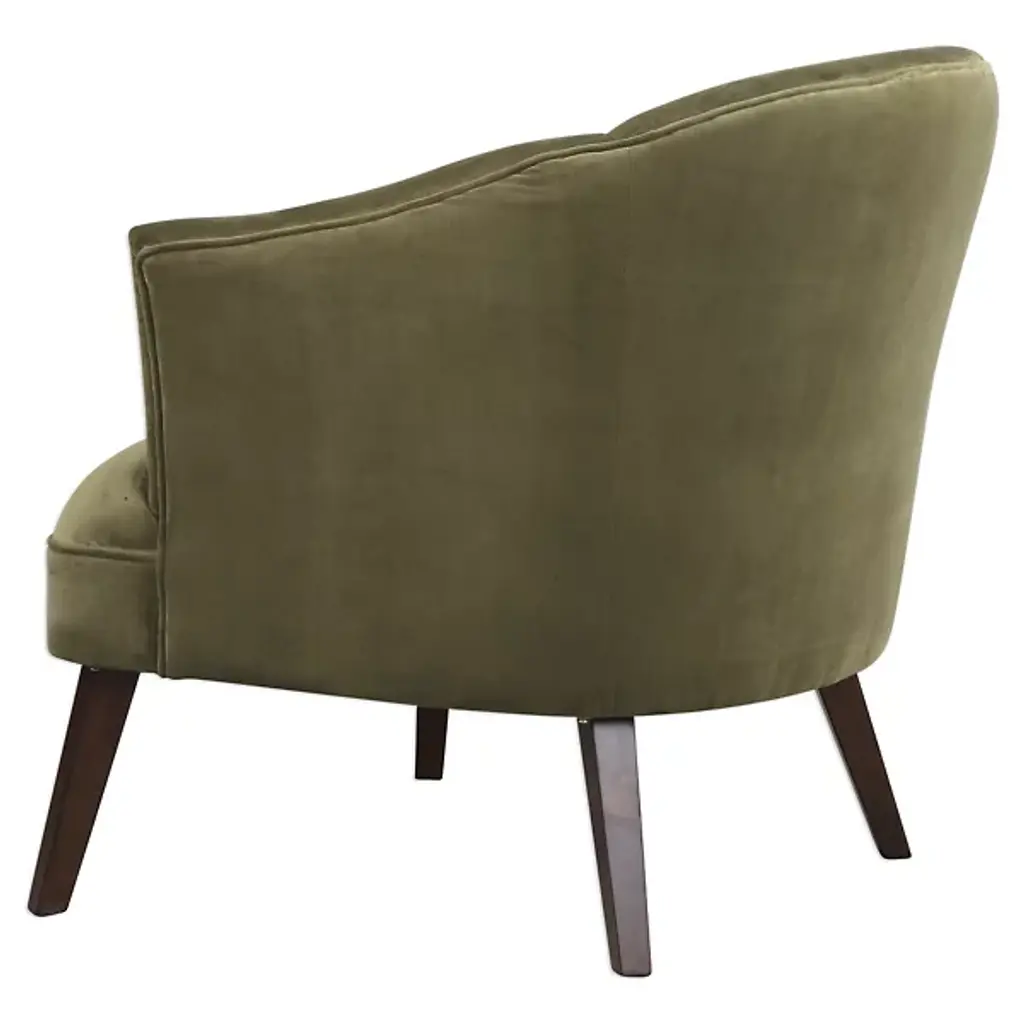 The Conroy Accent Chair from Uttermost is an impeccable blend of premium materials and distinctive high-style design artfully crafted by renowned designer Jim Parsons. The inviting allure of the barrel back style accent chair is enveloped in a luxurious soft olive-toned polyester velvet fabric, elegantly accented with welt trim. The cozy and sophisticated appeal is complemented by tapered birch legs in a rich dark walnut finish, adding a touch of timeless elegance to any space.