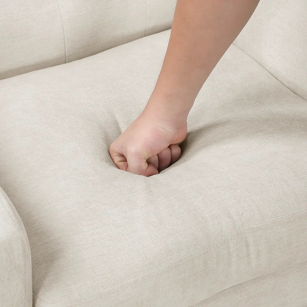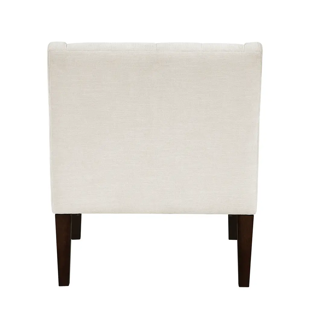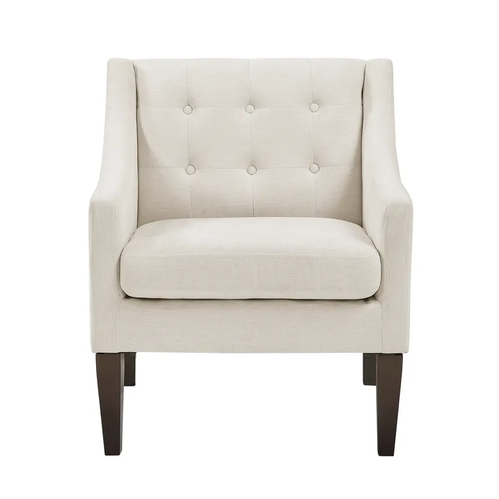 Plywood frame; High-density foam seat cushions; Textured fabric upholstery; Attached back and reversible seat cushions; Removable seat cushion cover with zipper; Button-tufted chair back; Rubber wood legs in brown finish