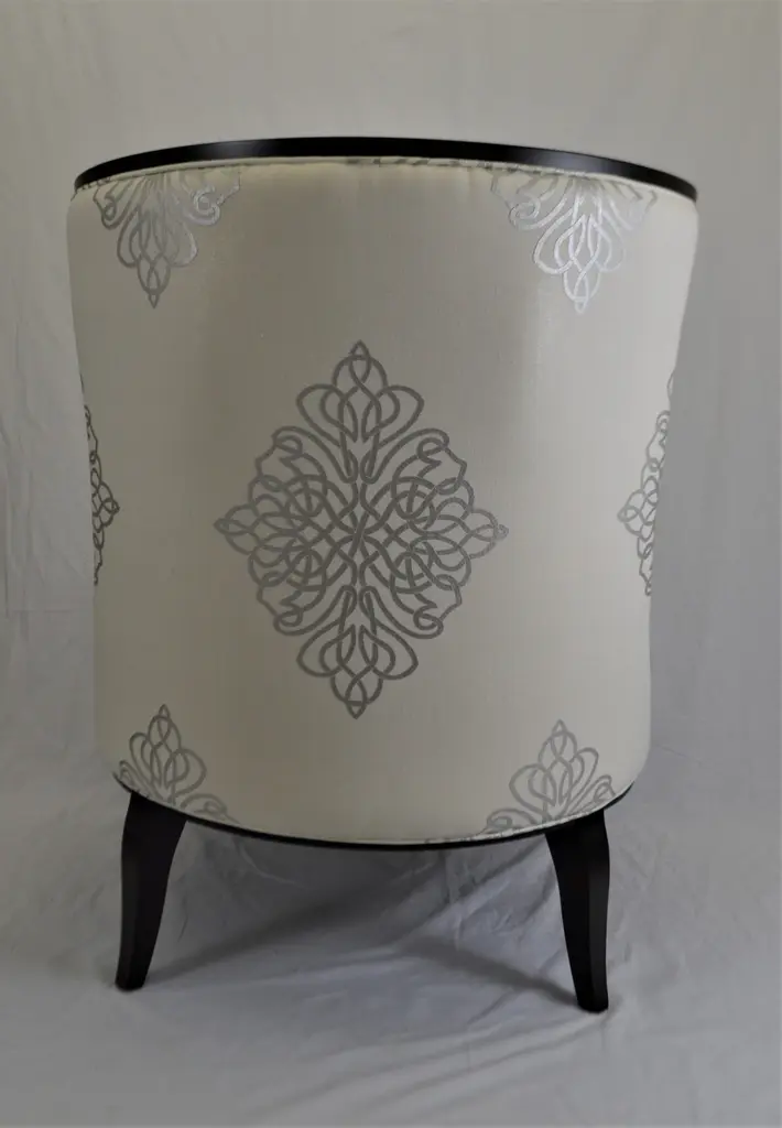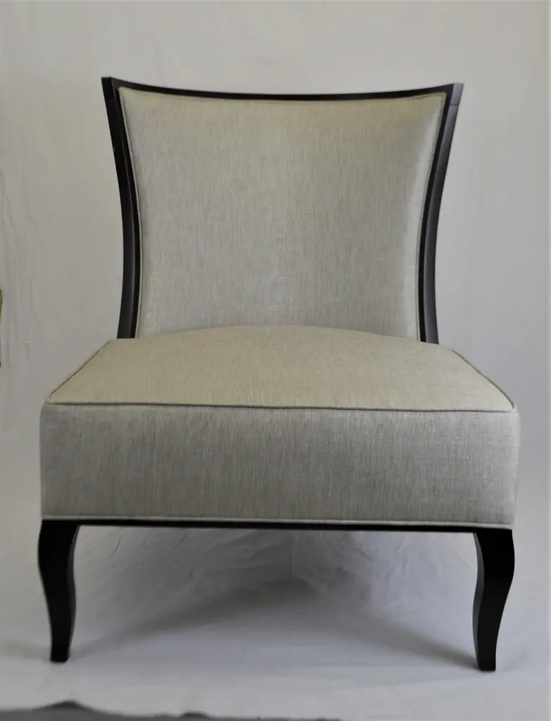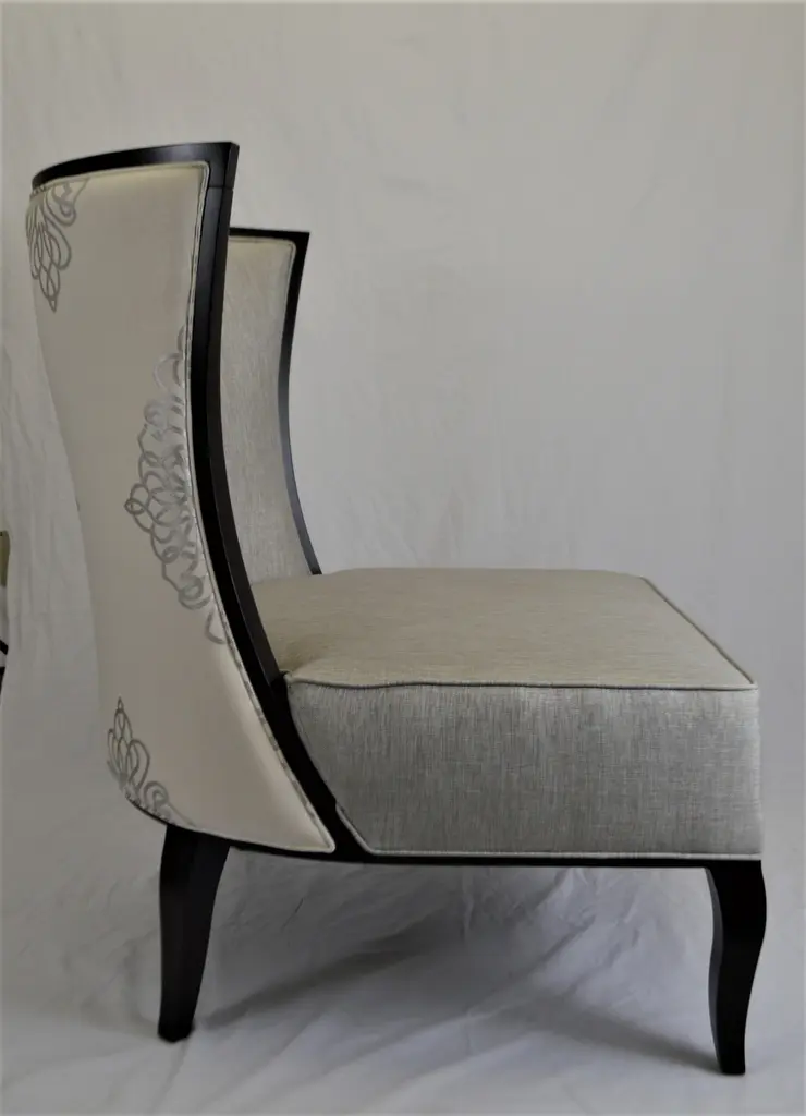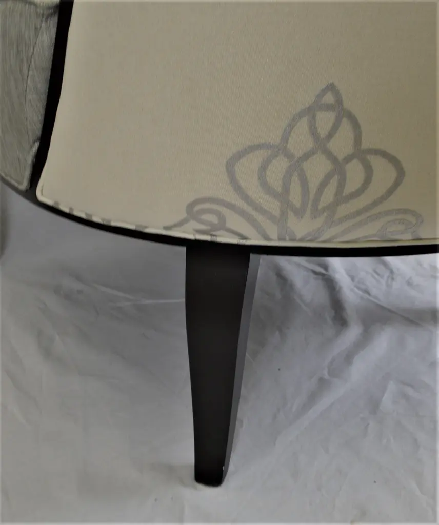 Contemporary high back chair with attractive design and very comfortable. The frame is made in Italy and it has been finished in an expresso wood stain. The upholstery is done in our studio, the fabric for the front of the chair is a solid linen blend and the back of the chair is a printed design fabric. Since the chjair is made in Italy there is a tariff of 15% on the cost of the chair when entering the USA. We can discuss cost sharing.