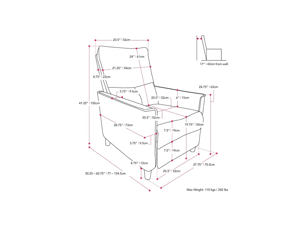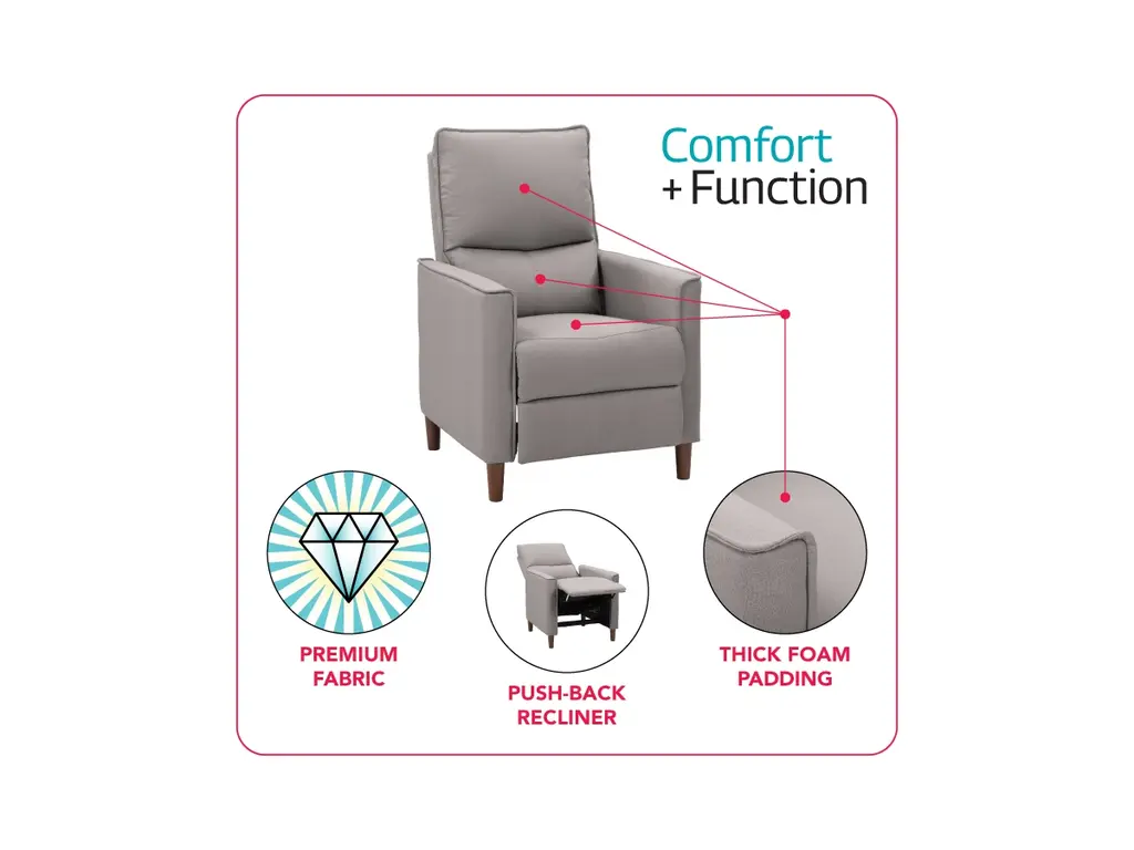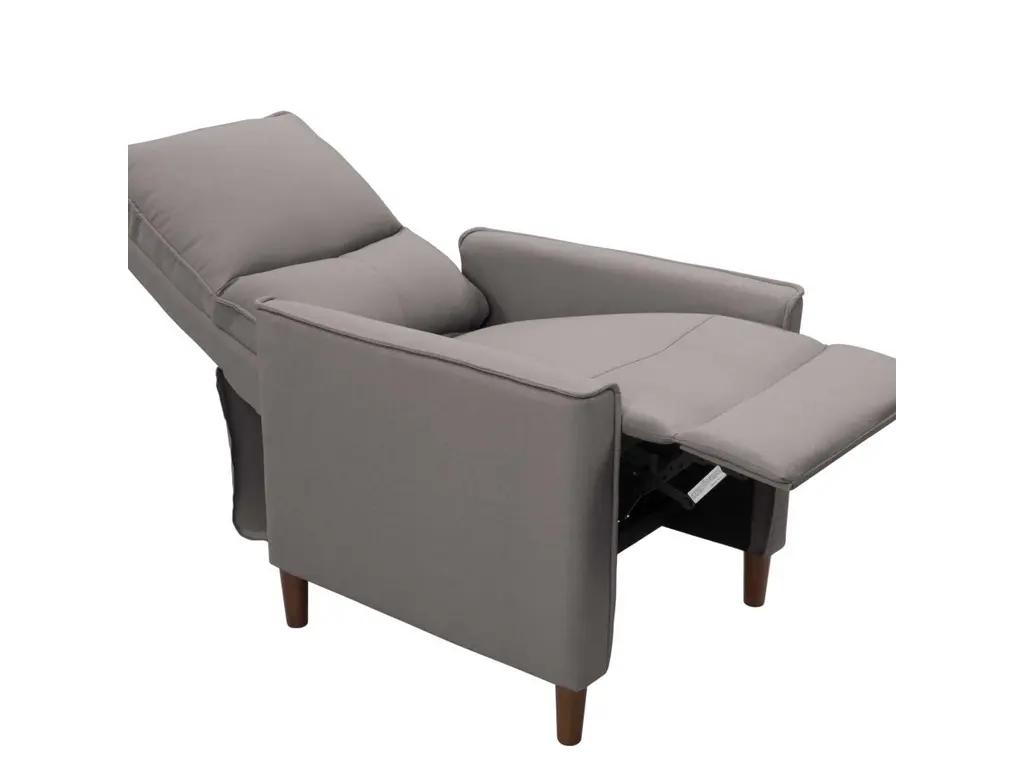 Sit back and relax in your Alder manual recliner chair. The Alder recliner comes upholstered in a plush, durable soft fabric. It features a spring and foam padded seat that will keep you in complete comfort while reading, scrolling or catching up on the latest episode. Additionally, the solid wood legs give this recliner a modern feel ma it the perfect complement to your living room, home office or bedroom.