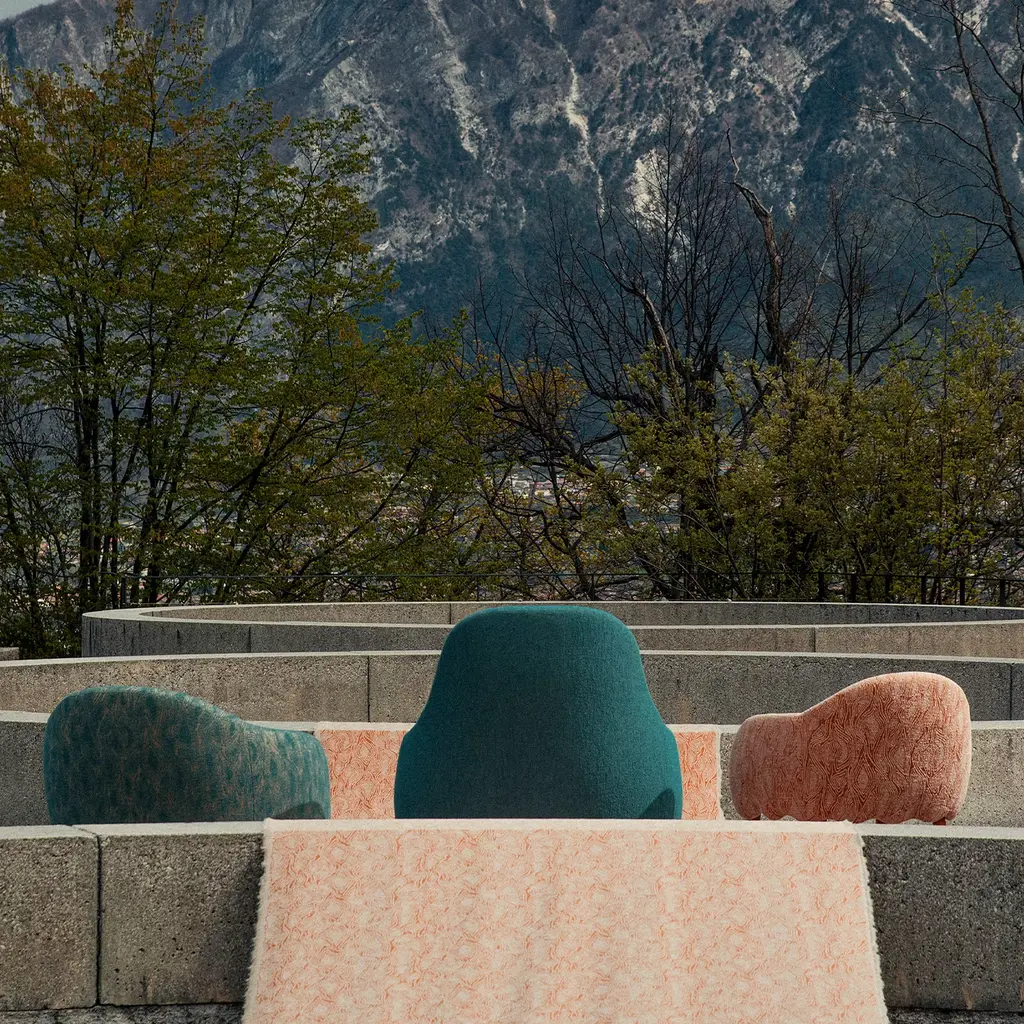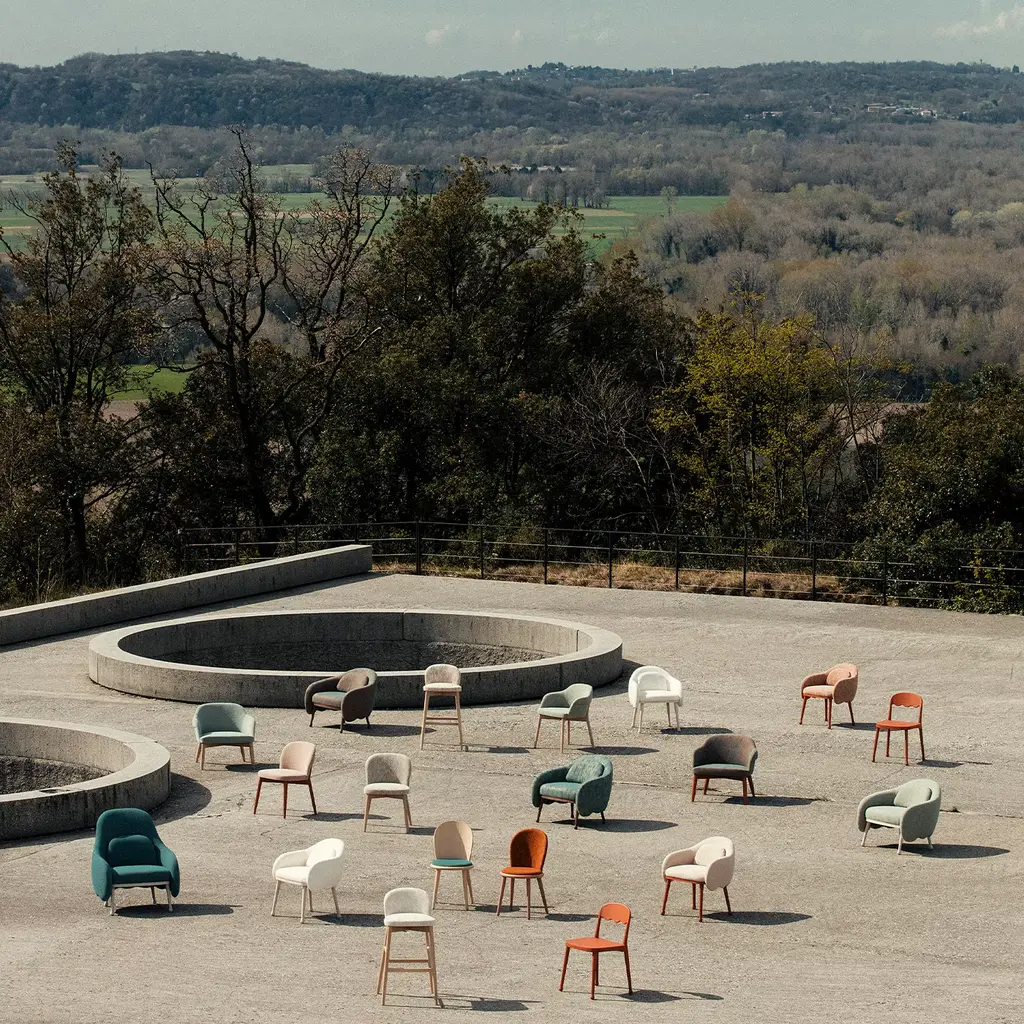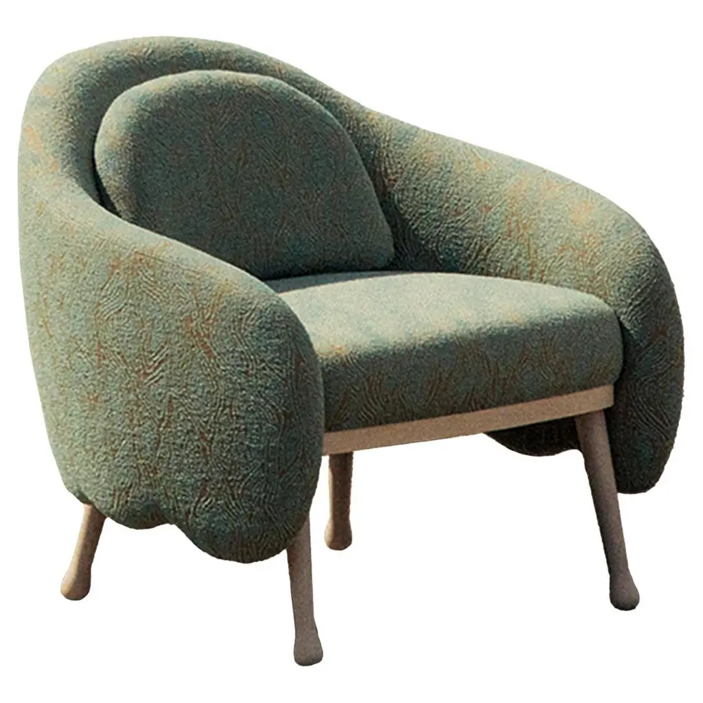An ode to nature actualized in a contemporary design, this armchair in walnut-finished ash owes its name the scalloped edge accenting the shell's lower profile and the sinuous shape of the legs. Equipped with a lumbar cushion for impeccable comfort, it makes the user feel pampered thanks to the enveloping design of its 44cm-high seat upholstered with a patterned upholstery blending a light backdrop with an intricate teal motif.