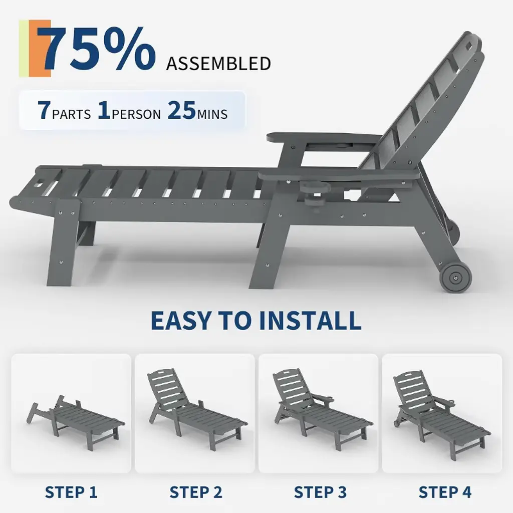 Boasting an expansive design, our HDPE lounge chair on wheels suits all body types, with a stellar weight bearing capacity of up to 450 lbs. Perfect for patios, pool edges, or gardens, it slots right into any outdoor setting without a hitch. Whether you’re into sunbathing, diving into a book, or catching some Z’s, this chaise lounge bends to your comfort demands