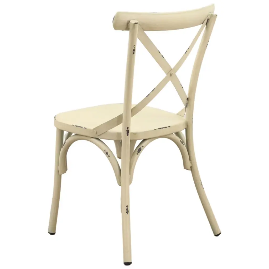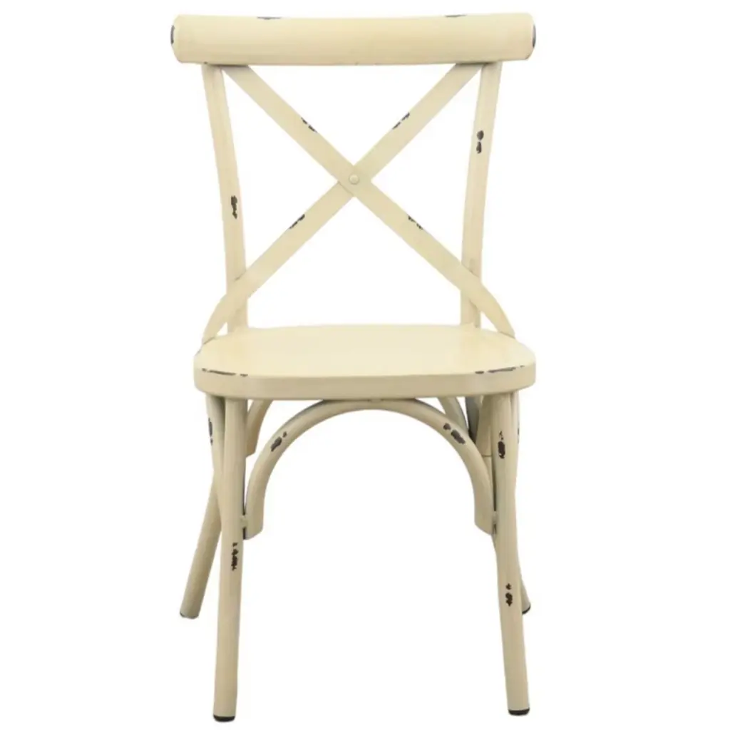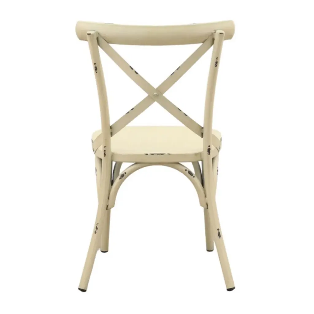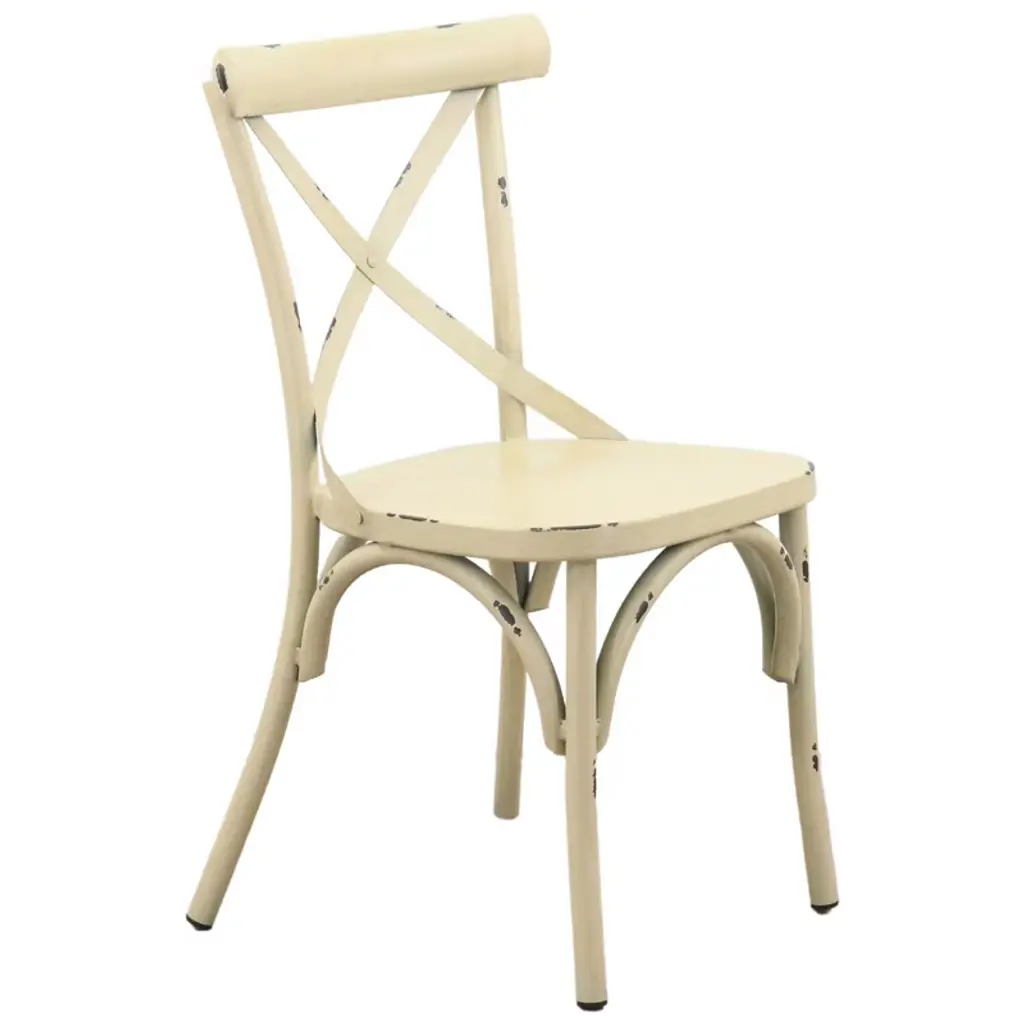 Elegantly detailed our Brookwood collection provides structural integrity as well as a unique look and style. Made from aluminum frames, these frames have been finished by hand to give a rustic look with incredible detail. These chairs are sure to enhance any indoor or outdoor eating area. The crossed back design along with the top curved accent bar provide comfort. Fully assembled and 1 Year Limited Manufacturer Warranty.