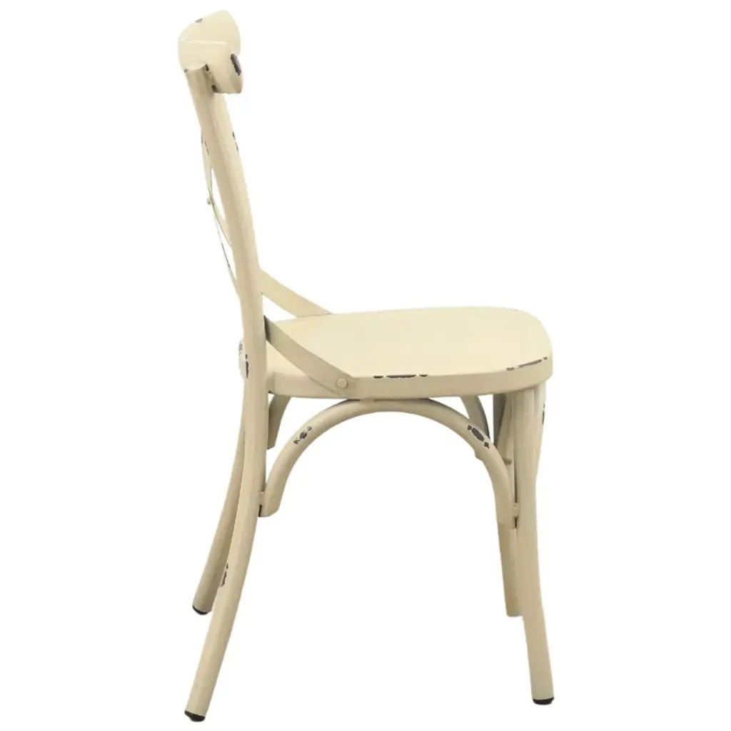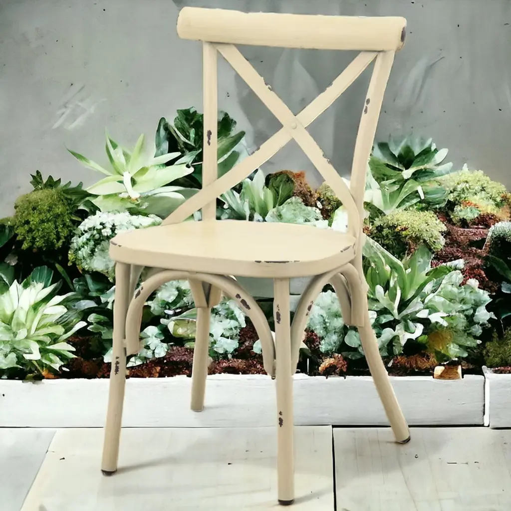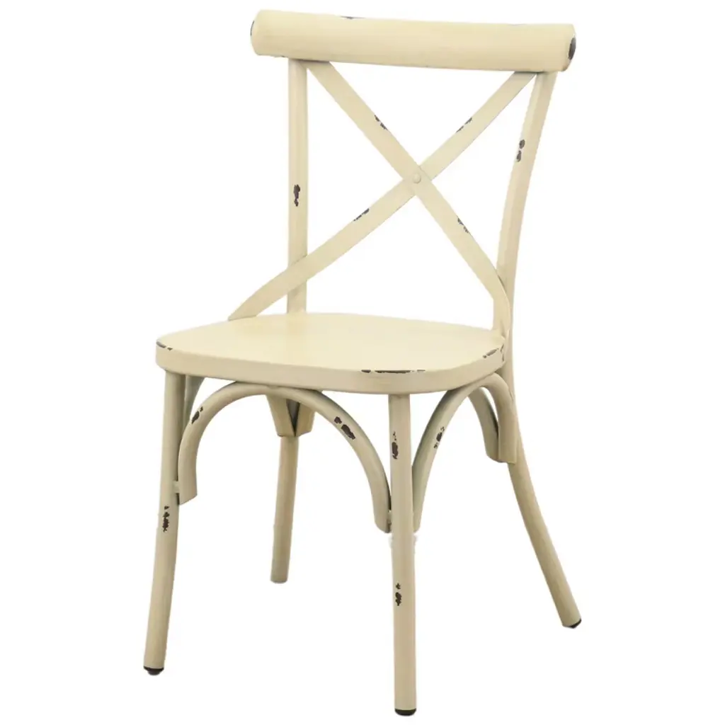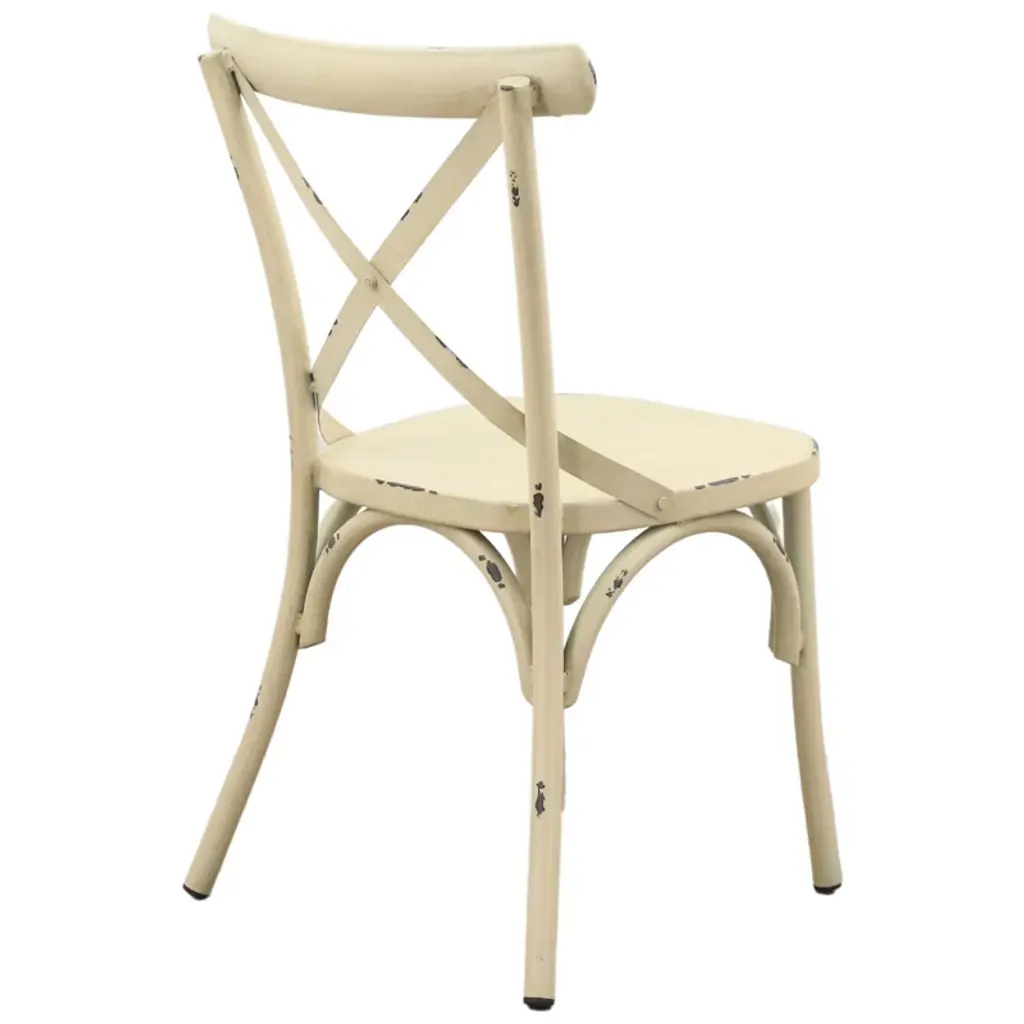 Elegantly detailed our Brookwood collection provides structural integrity as well as a unique look and style. Made from aluminum frames, these frames have been finished by hand to give a rustic look with incredible detail. These chairs are sure to enhance any indoor or outdoor eating area. The crossed back design along with the top curved accent bar provide comfort. Fully assembled and 1 Year Limited Manufacturer Warranty.