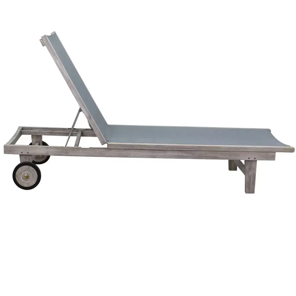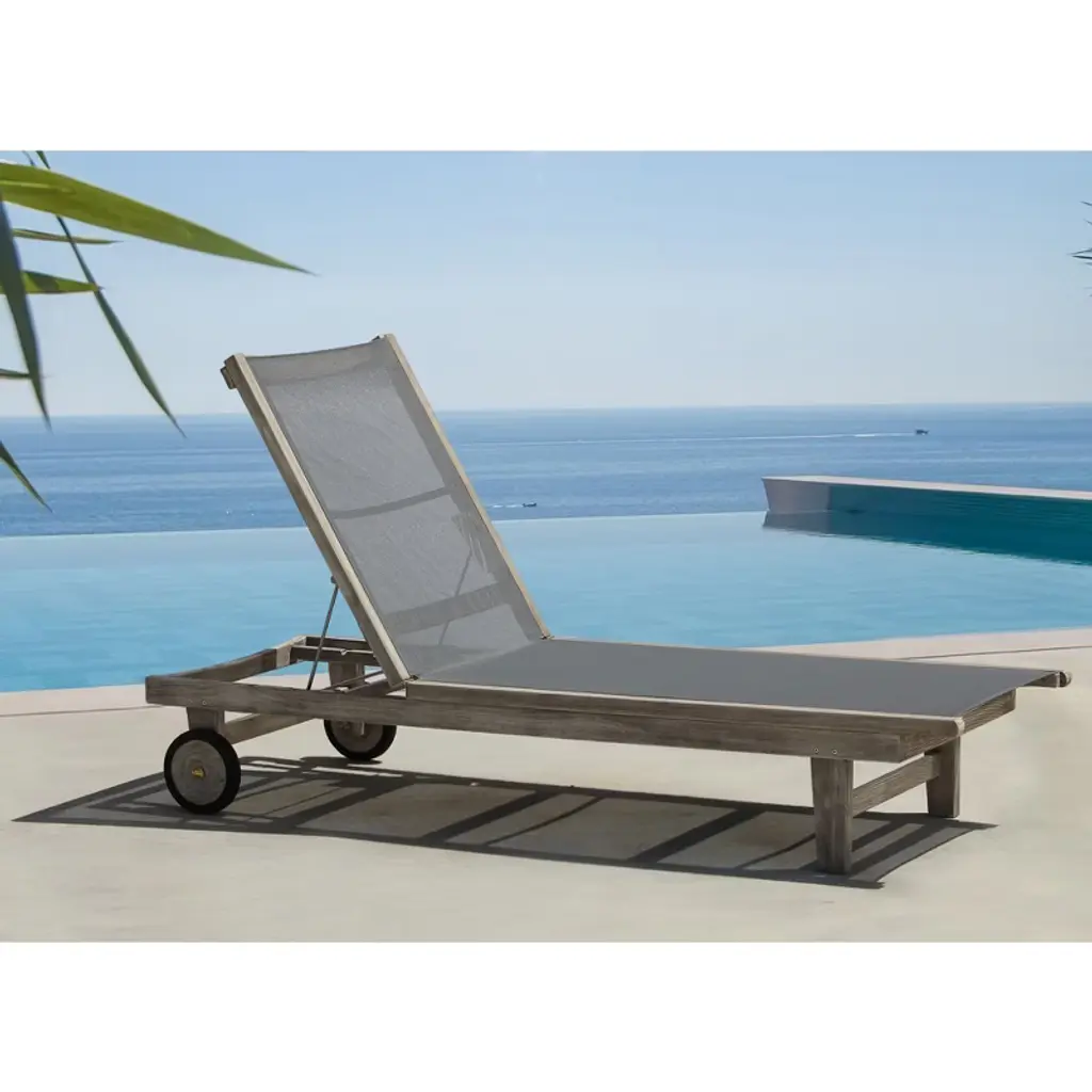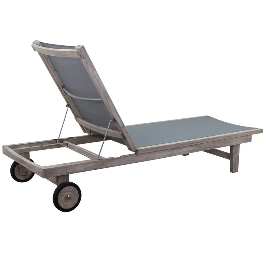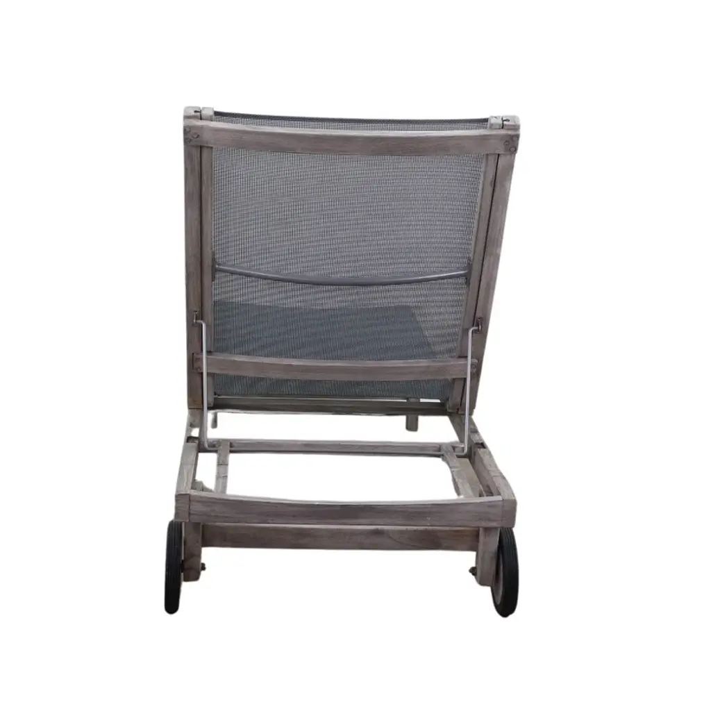 The Deck Side driftwood gray teak outdoor sling chaise lounge brings Venicerary style to the great outdoors. With it's sleek design and natural teak wood patina this piece will be the talk of your next pool party! Made from Grade A, FSC certified teak wood, you know you're purchasing a high quality, environmentally friendly product. Great for any outdoor setting: patio, covered patio, deck, fire pit, outdoor kitchen, poolside, lanai, gazebo, etc. Textiline fabric used for sling. Driftwood Gray stain applied for a more natural patina look The sling is made from Sunproof Textiline. Very easy to clean and comes with a 1 Year Limited Manufacturer's Warranty.