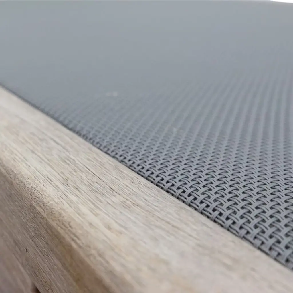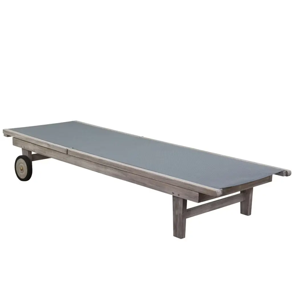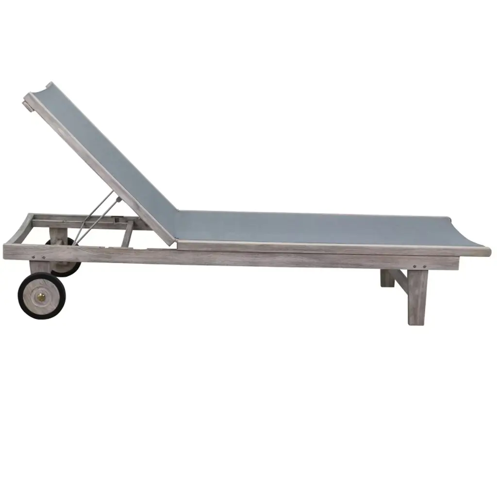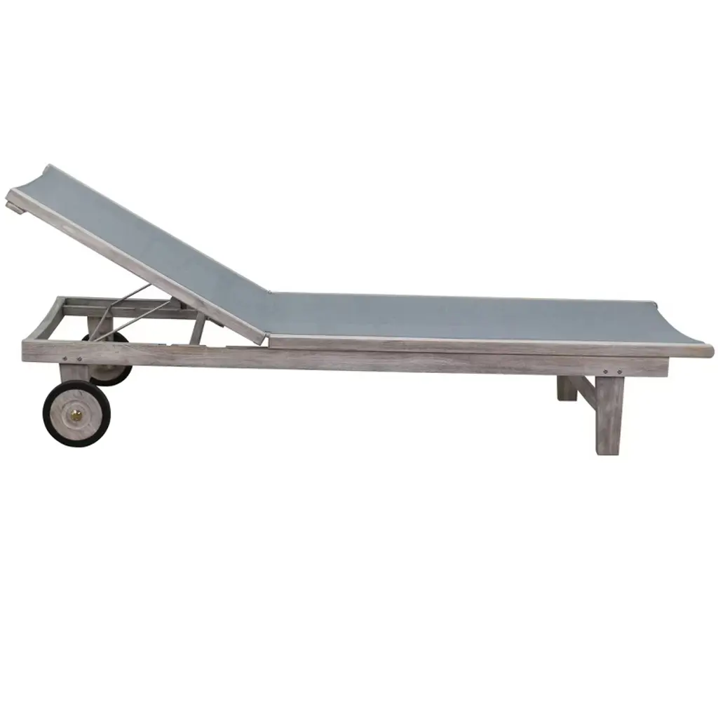 The Deck Side driftwood gray teak outdoor sling chaise lounge brings Venicerary style to the great outdoors. With it's sleek design and natural teak wood patina this piece will be the talk of your next pool party! Made from Grade A, FSC certified teak wood, you know you're purchasing a high quality, environmentally friendly product. Great for any outdoor setting: patio, covered patio, deck, fire pit, outdoor kitchen, poolside, lanai, gazebo, etc. Textiline fabric used for sling. Driftwood Gray stain applied for a more natural patina look The sling is made from Sunproof Textiline. Very easy to clean and comes with a 1 Year Limited Manufacturer's Warranty.
