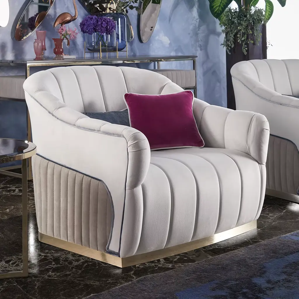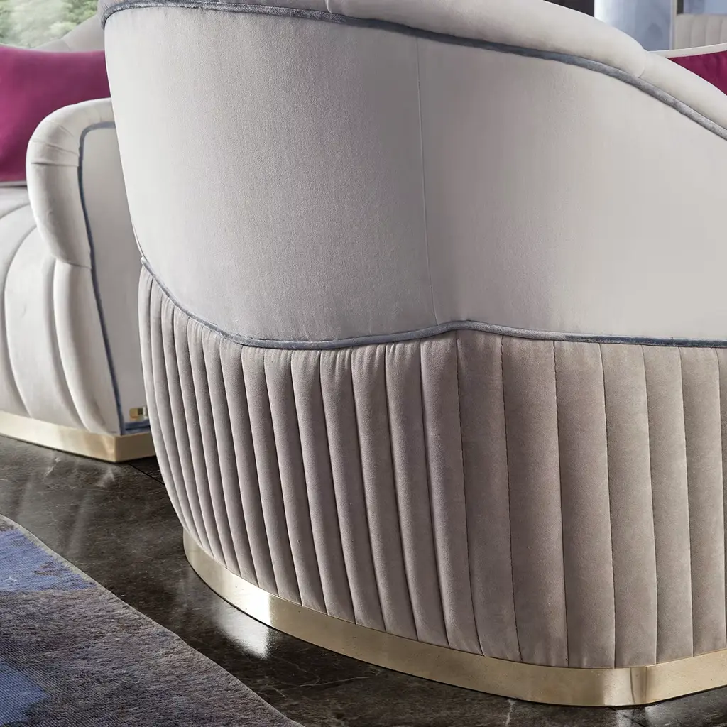 Chaneling chic lounge vibes, the Crystal Armchair is handcrafted in Italy's Veneto region. Perfect for a stylish contemporary living room, the armchair sits on a golden metal base and is enclosed by faux leather in a cool sandy tone. The chair is upholstered in ivory-colored fabric and comes complete with decorative cushions.