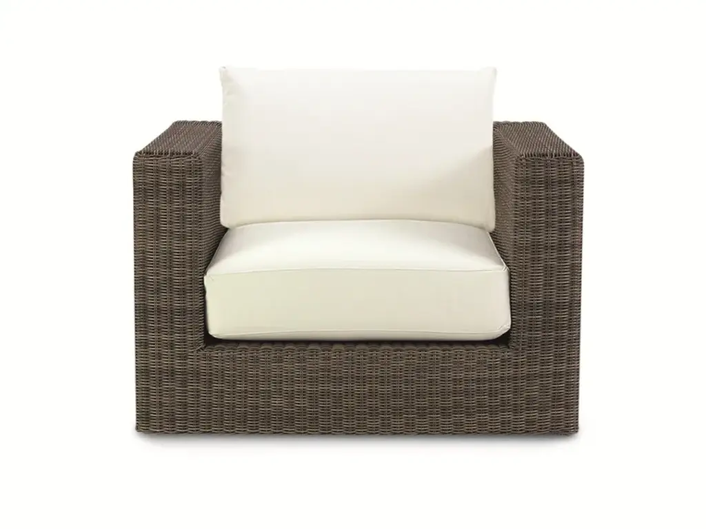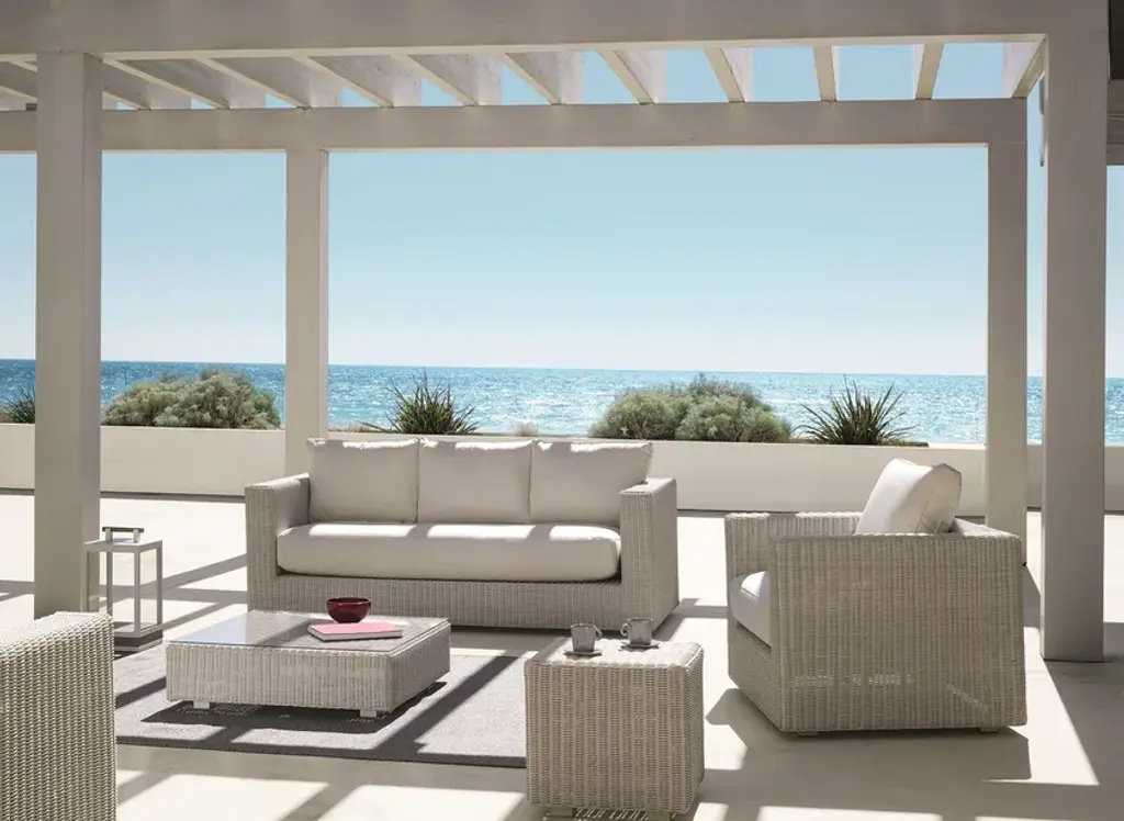 Cube is an armchair in synthetic Etwick fibre with a natural finish, weather resistant, in a linear design, ideal for the garden.Collection in handwoven etwick fiber with rough finish composed of one-piece and modular sofa, pouf, sunbed, available in two natural colours, bark and white. The textural nature of the Etwick fibre, hand woven to create pure geometries of volumes, is the main feature of the Cube collection: a complete range for creating infinite compositions based on a concept of modularity.