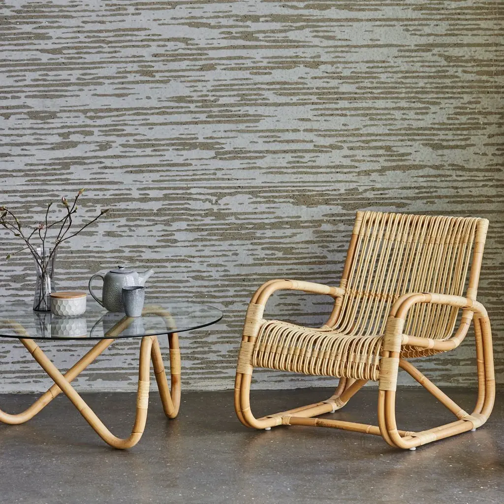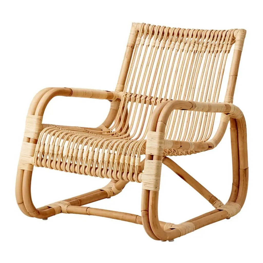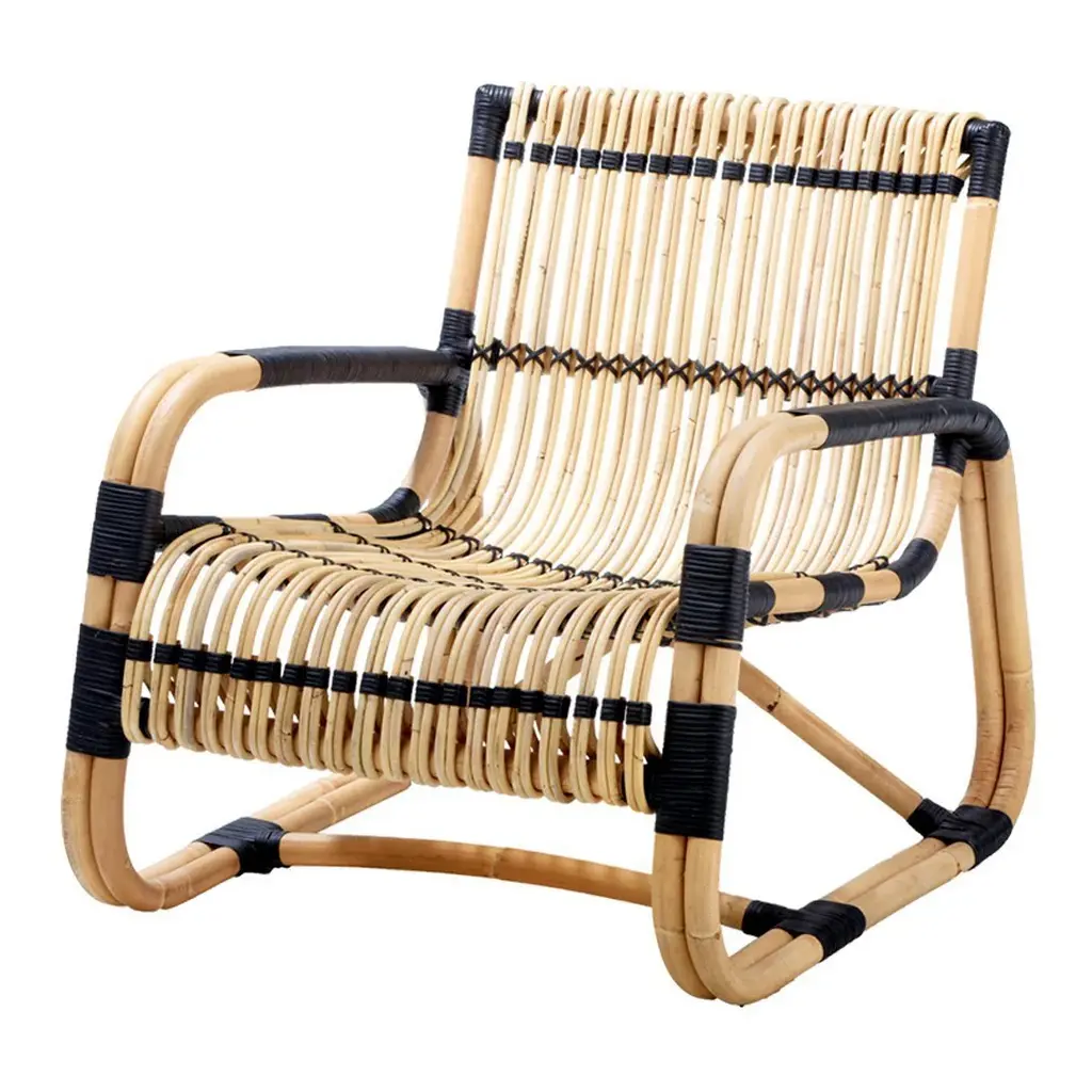 Curve is an unusual lounge chair, and a sure eye catcher, shaped from sustainable natural rattan with black bindings – lightweight yet strong and with a unique sculptural look. Indoor use only.