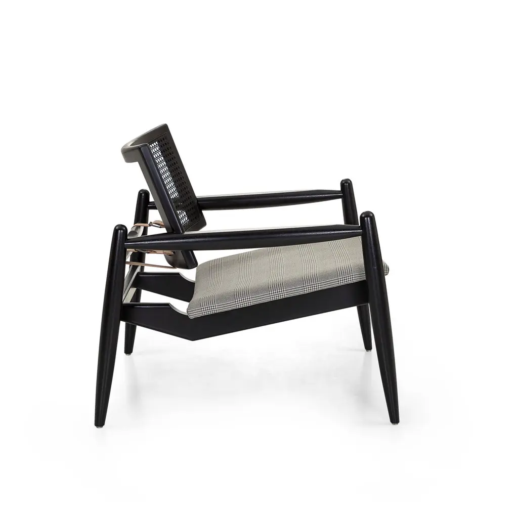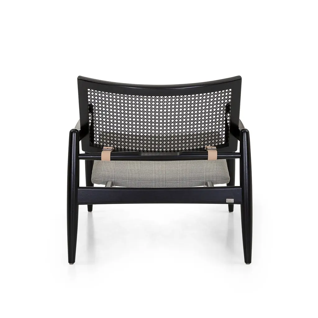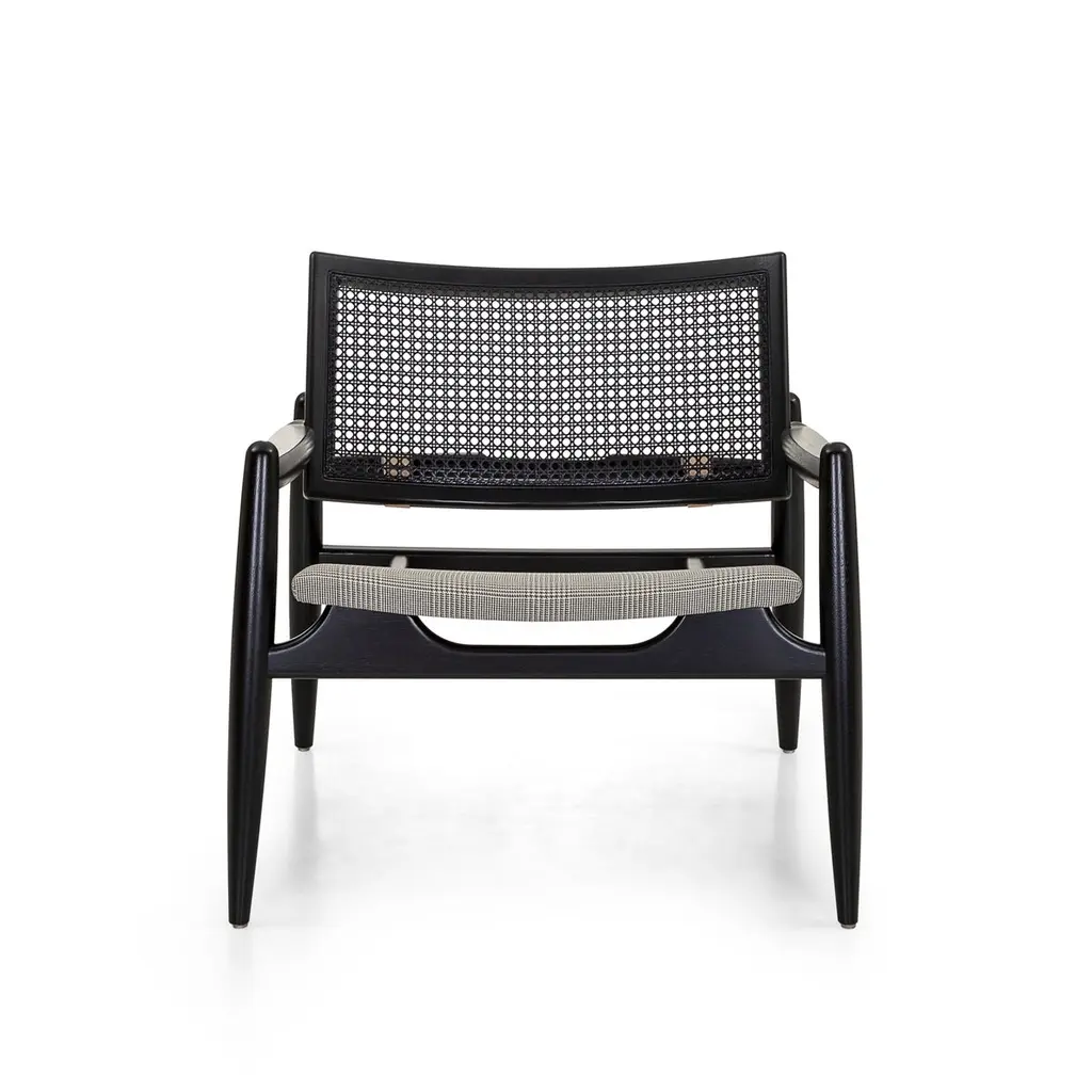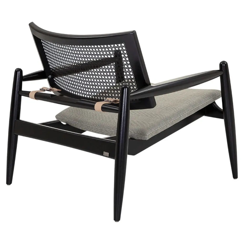 A Soho armchair designed by Sérgio Batista for Uultis with black matte finish and checkered gray fabric. Please check availability prior to purchase.The Soho armchair brings vintage elegance to any interior, with a bold black matte wood finish and a curved cane back that nods to mid-century design. Its very firm seat cushion is upholstered in a chic Suede Grey Basket Weave fabric with a subtle checkered pattern, adding a layer of texture and sophistication. Crafted by hand with attention to detail, the Soho chair combines solid wood construction and fine artisan techniques, making it as durable as it is beautiful. The leather belt buckle strap at the back adds a refined detail that speaks to thoughtful craftsmanship.With its low profile and wide, curved seat, this lounge chair is made for relaxing while still maintaining a sculptural presence in a room. Perfect in a living room as a statement piece, paired next to a sofa or coffee table, or in a reading nook with a side table and lamp. In a bedroom, it makes an ideal accent chair to soften corners and bring a layer of modern vintage charm. The clean lines and handcrafted cane weave make it equally suited for minimalist, contemporary, or mid-century interiors. Built from sustainably sourced materials, the Soho armchair embodies Uultis' commitment to environmental responsibility without sacrificing design. Delivered fully assembled, this piece is ready to become an instant focal point. Its understated elegance makes it versatile for both residential and commercial use—whether styled in a boutique hotel lounge or a refined home office.