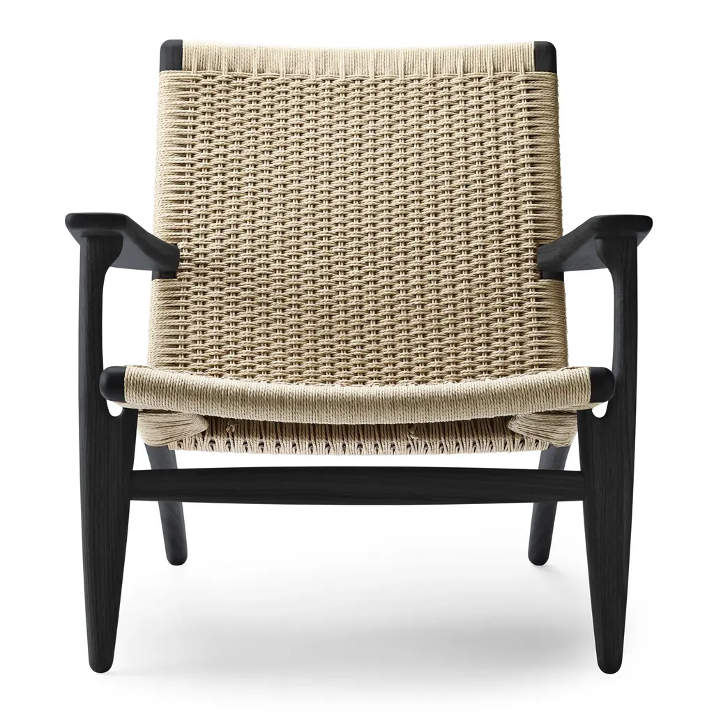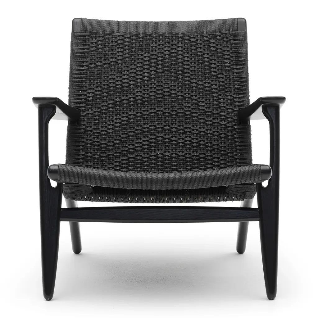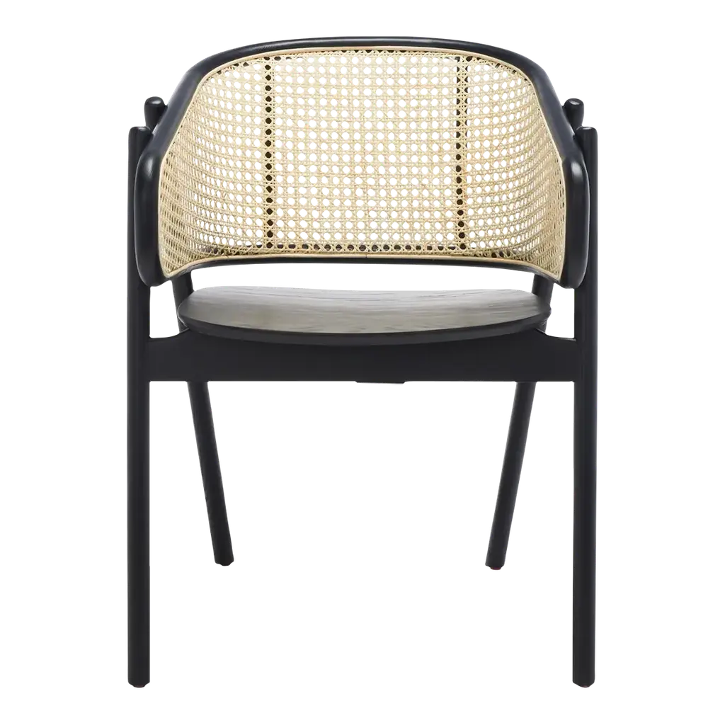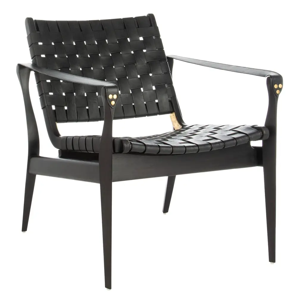 A Soho armchair designed by Sérgio Batista for Uultis with black matte finish and checkered gray fabric. Please check availability prior to purchase.The Soho armchair brings vintage elegance to any interior, with a bold black matte wood finish and a curved cane back that nods to mid-century design. Its very firm seat cushion is upholstered in a chic Suede Grey Basket Weave fabric with a subtle checkered pattern, adding a layer of texture and sophistication. Crafted by hand with attention to detail, the Soho chair combines solid wood construction and fine artisan techniques, making it as durable as it is beautiful. The leather belt buckle strap at the back adds a refined detail that speaks to thoughtful craftsmanship.With its low profile and wide, curved seat, this lounge chair is made for relaxing while still maintaining a sculptural presence in a room. Perfect in a living room as a statement piece, paired next to a sofa or coffee table, or in a reading nook with a side table and lamp. In a bedroom, it makes an ideal accent chair to soften corners and bring a layer of modern vintage charm. The clean lines and handcrafted cane weave make it equally suited for minimalist, contemporary, or mid-century interiors. Built from sustainably sourced materials, the Soho armchair embodies Uultis' commitment to environmental responsibility without sacrificing design. Delivered fully assembled, this piece is ready to become an instant focal point. Its understated elegance makes it versatile for both residential and commercial use—whether styled in a boutique hotel lounge or a refined home office.