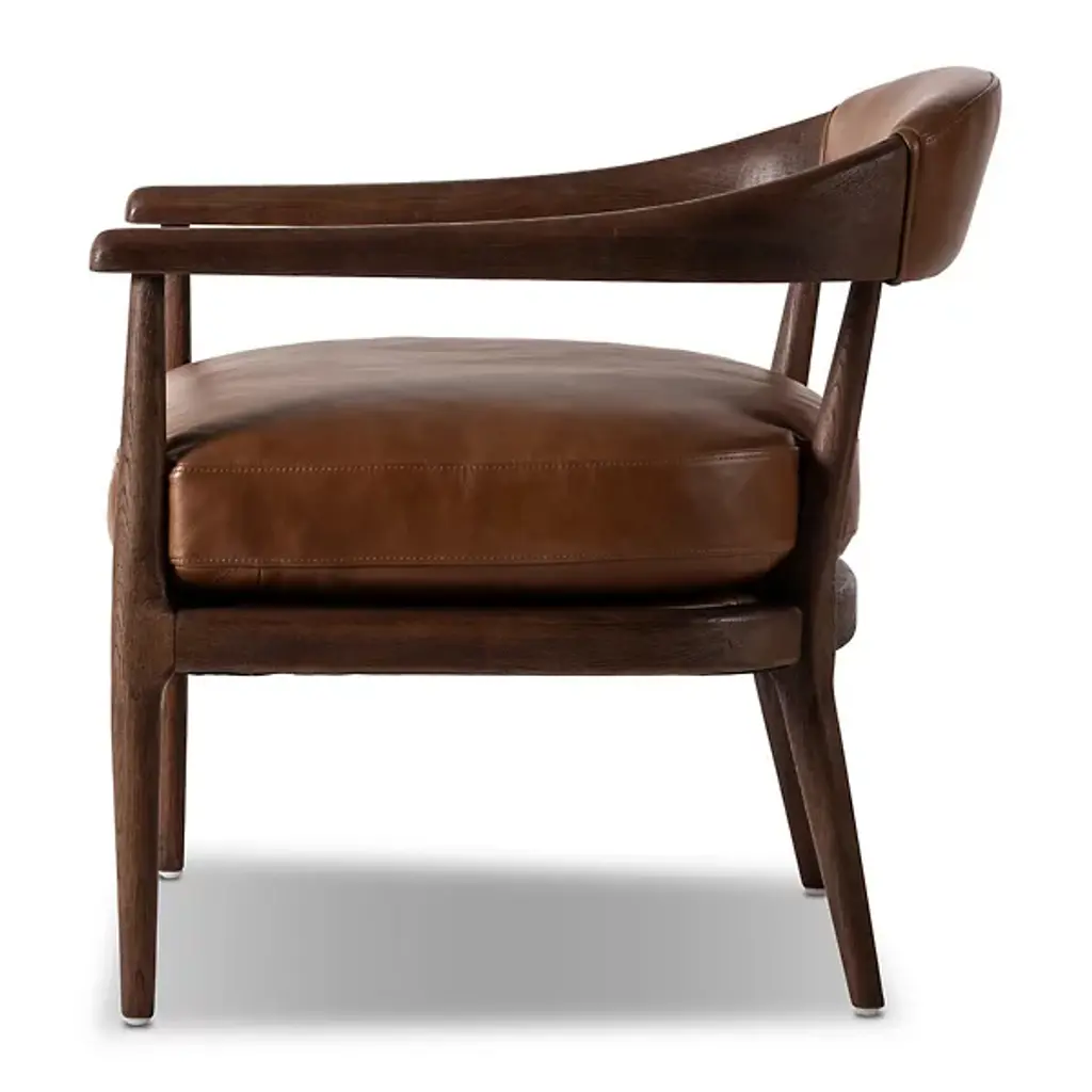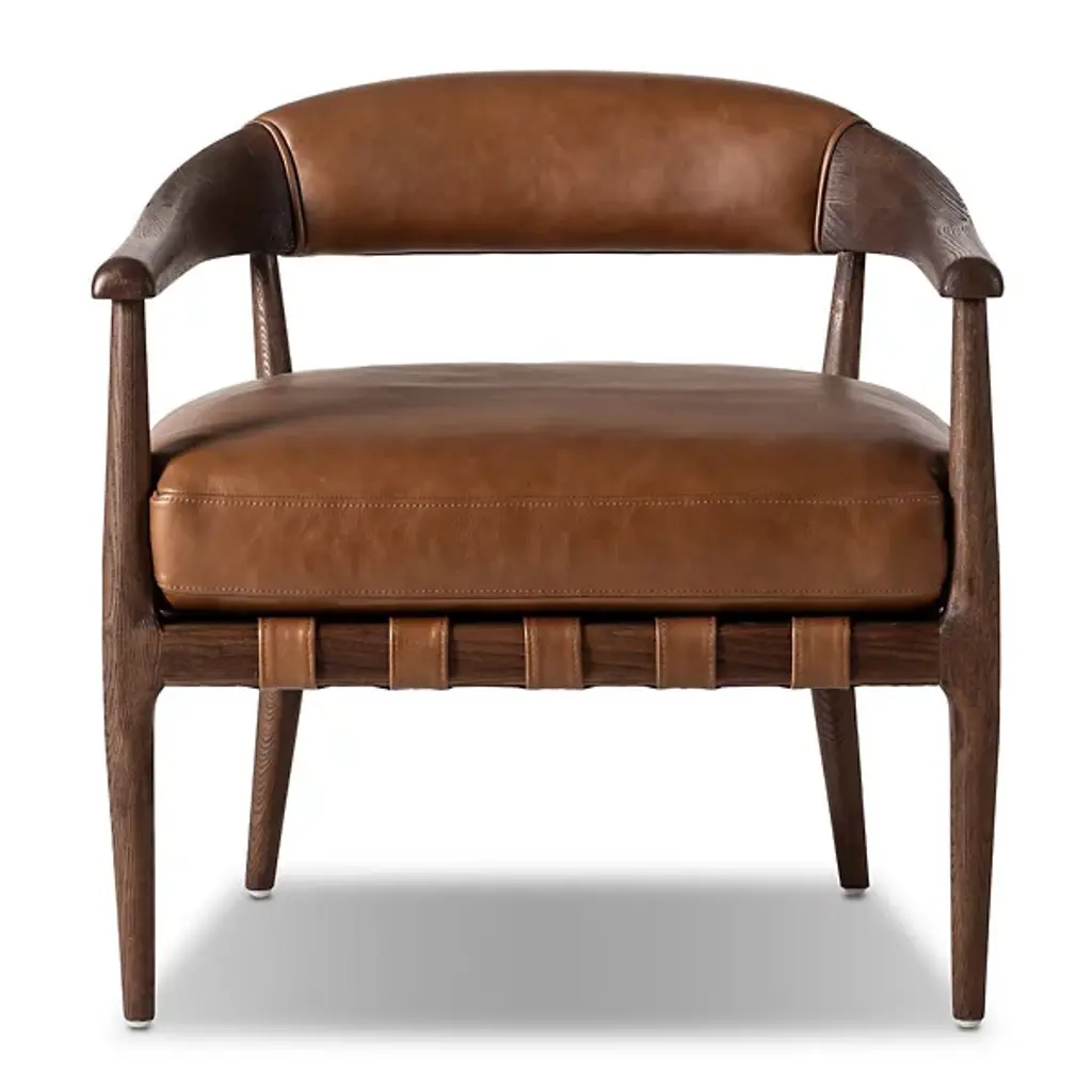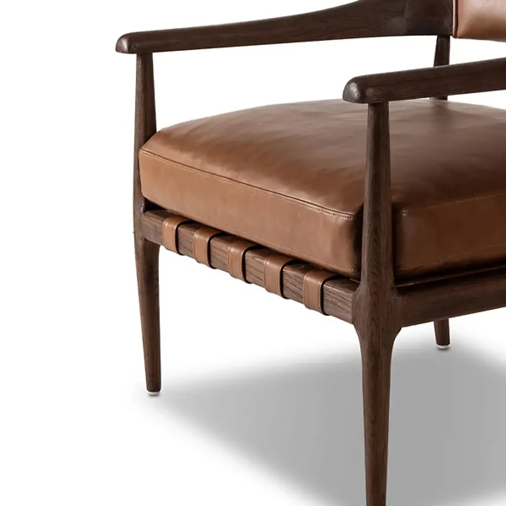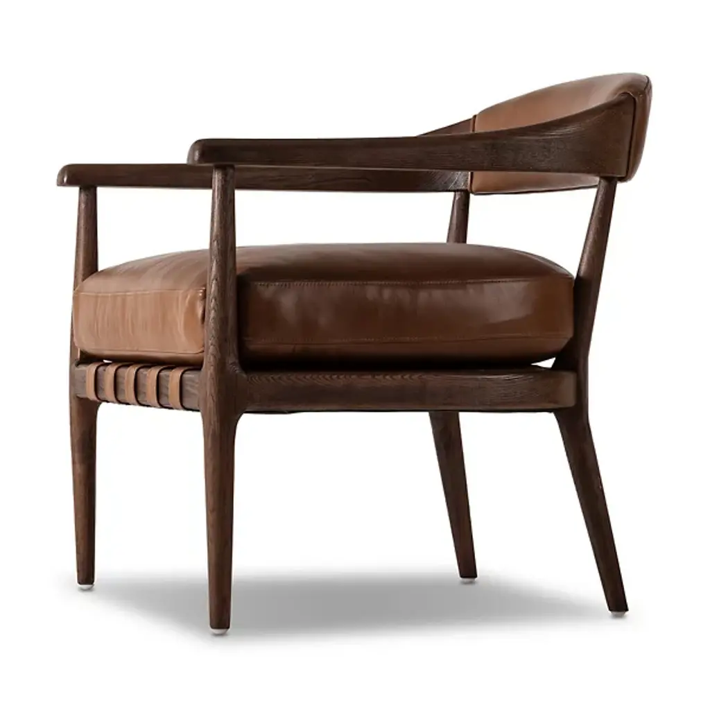 The Dane Lounge Chair from Four Hands brings safari styling into the modern era with its solid wood frame and webbed seating structure, offering a comfortable sink-in feel. The upholstered back, strap details, and loose cushion are wrapped in luxurious Italian-made leather, featuring a soft, buttery texture with subtle variations that add dynamic movement to the design. Treated for water repellency, this leather enhances the piece's durability and elegance, making it a stylish and practical addition to any space.