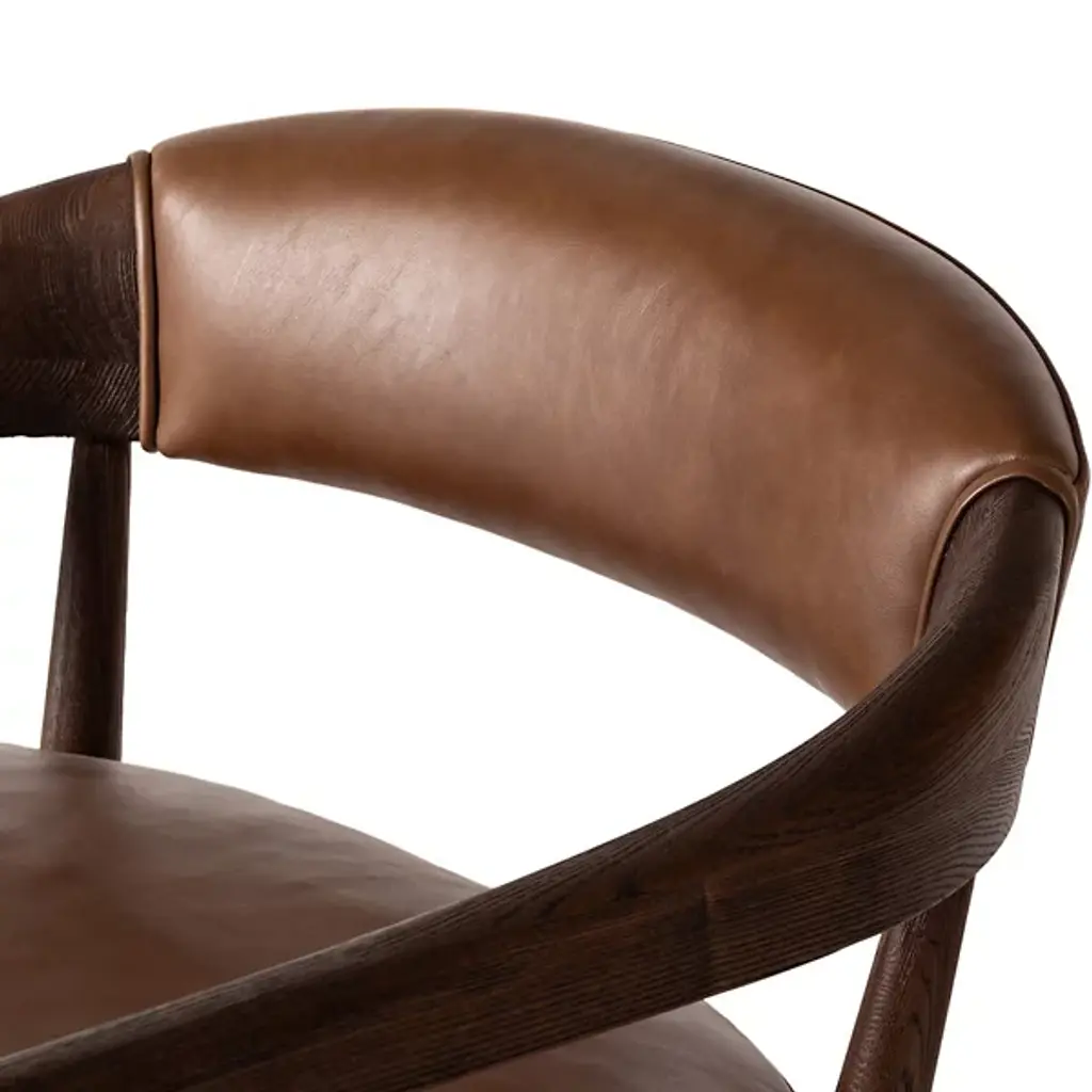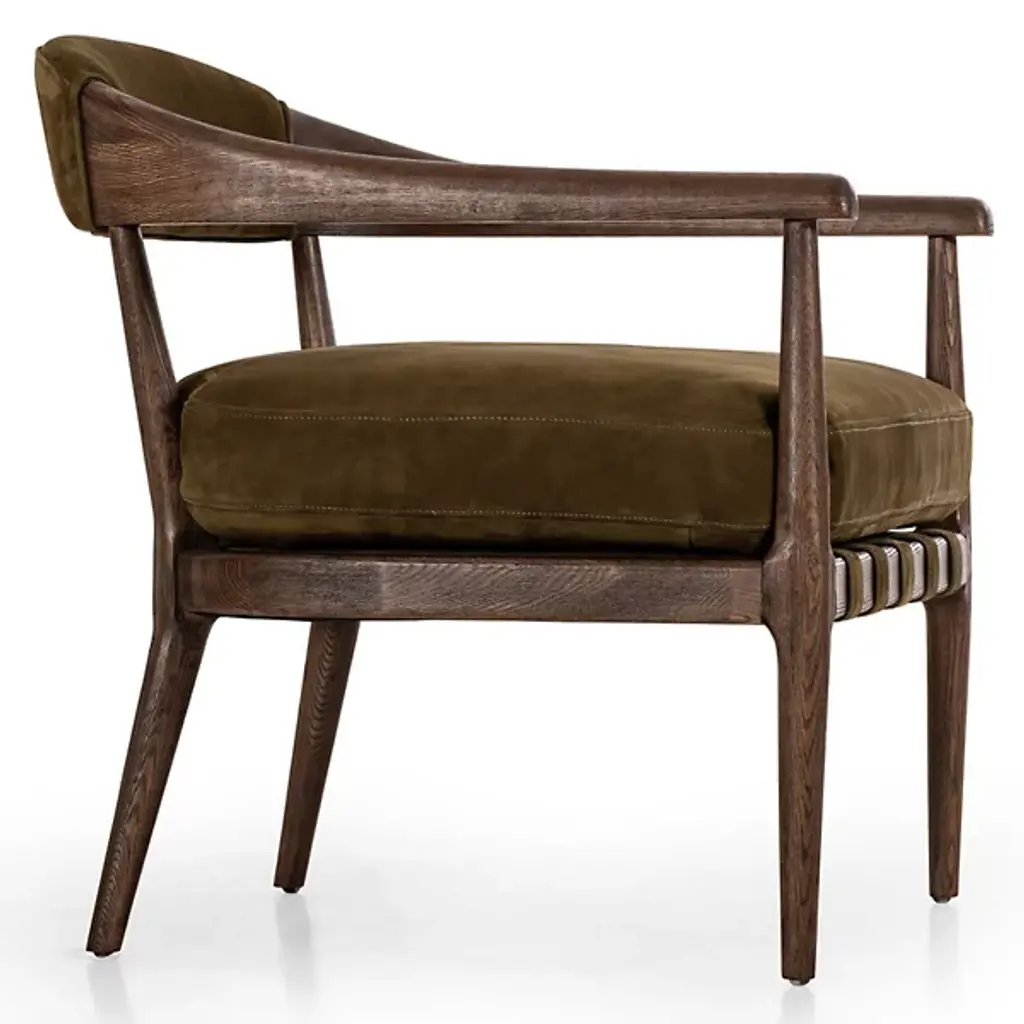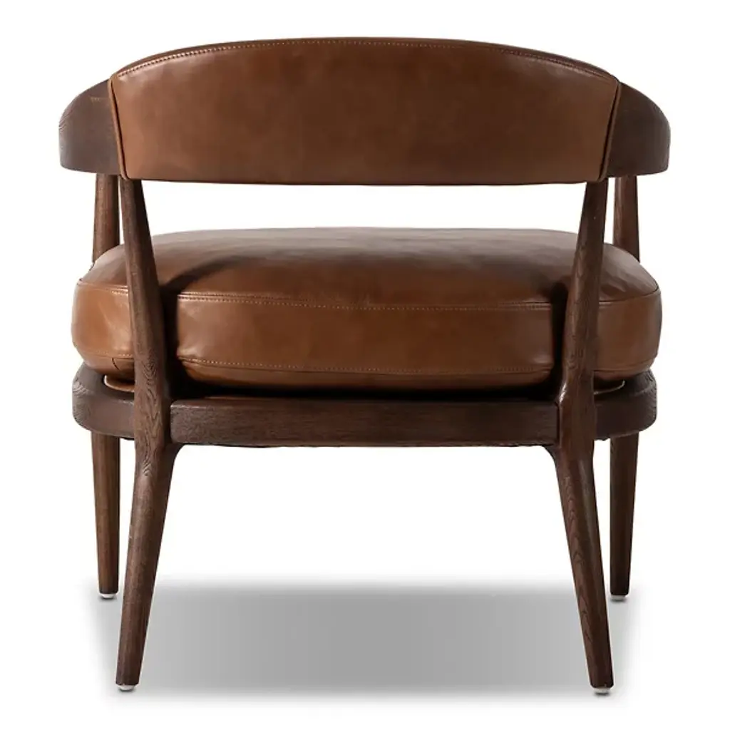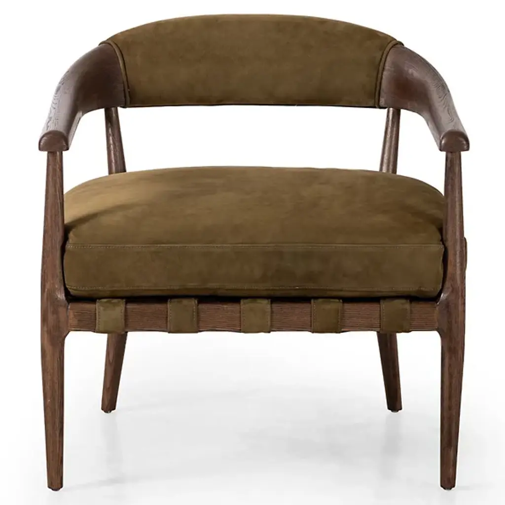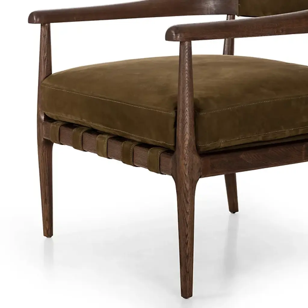 The Dane Lounge Chair from Four Hands brings safari styling into the modern era with its solid wood frame and webbed seating structure, offering a comfortable sink-in feel. The upholstered back, strap details, and loose cushion are wrapped in luxurious Italian-made leather, featuring a soft, buttery texture with subtle variations that add dynamic movement to the design. Treated for water repellency, this leather enhances the piece's durability and elegance, making it a stylish and practical addition to any space.