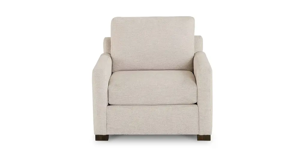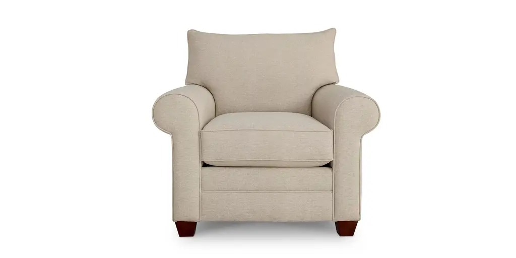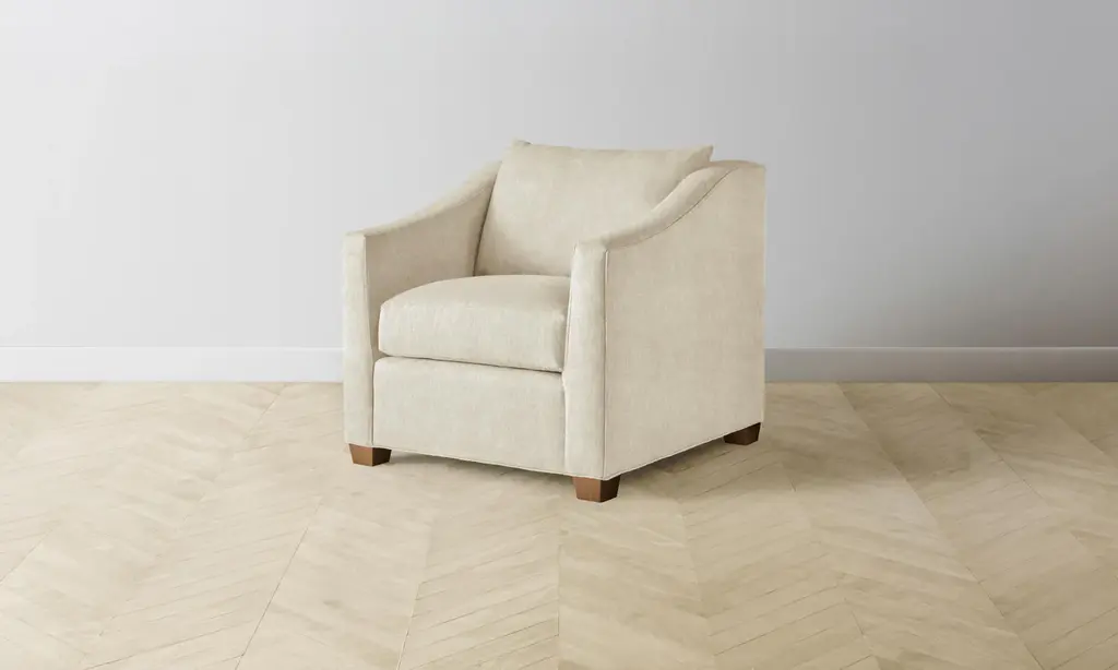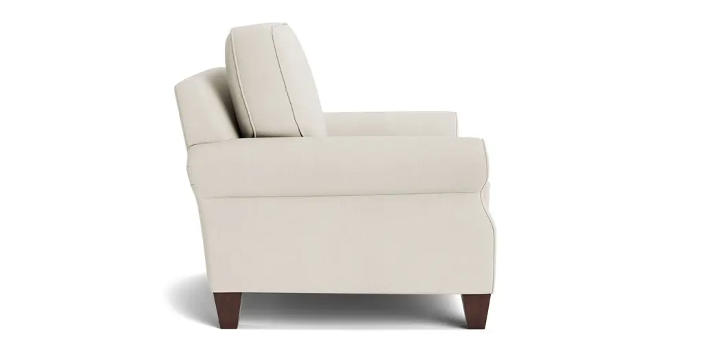 Like a crisp linen suit, the Davenport Chair looks tailored and relaxed at the same time. With relaxed, rolled arms set slightly back and welted seams, this chair invites you to sit for a spell. Loose back boxed cushions bounce back with a quick fluff, and tall, tapered legs in a walnut finish complete the look. Choose from a wide selection of fabrics and colors to make this chair a perfect fit. Custom options available in-store include nailhead trim, seat and backfill options, leg finish colors, and accent pillows in a choice of fabrics.