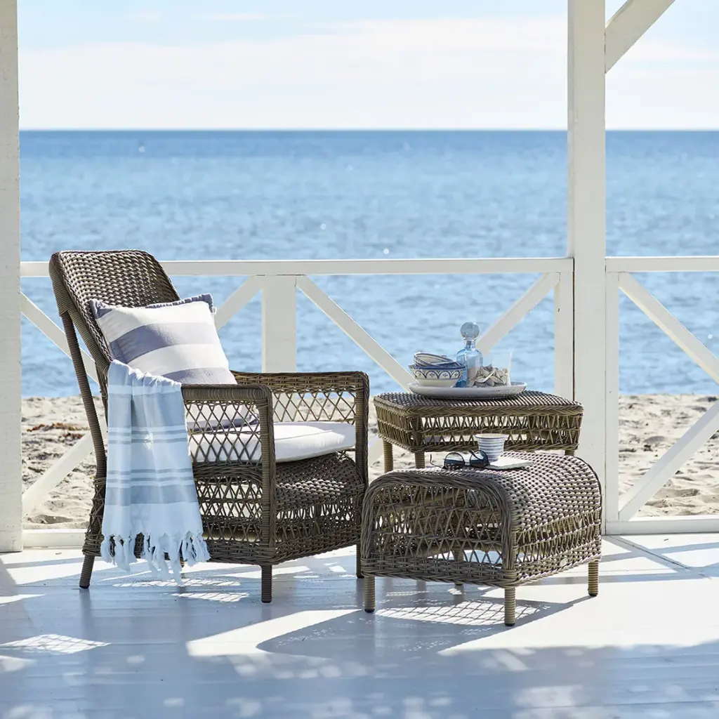 The Dawn Chair is the picture of restful elegance. With arms, a high back and a sturdy base, this chair invites you to stay a while and, with the option of a matching foot stool, to put your feet up while you're at it. The chair is crafted from maintenance-free fibers that are durable enough for year-round outdoor use.
