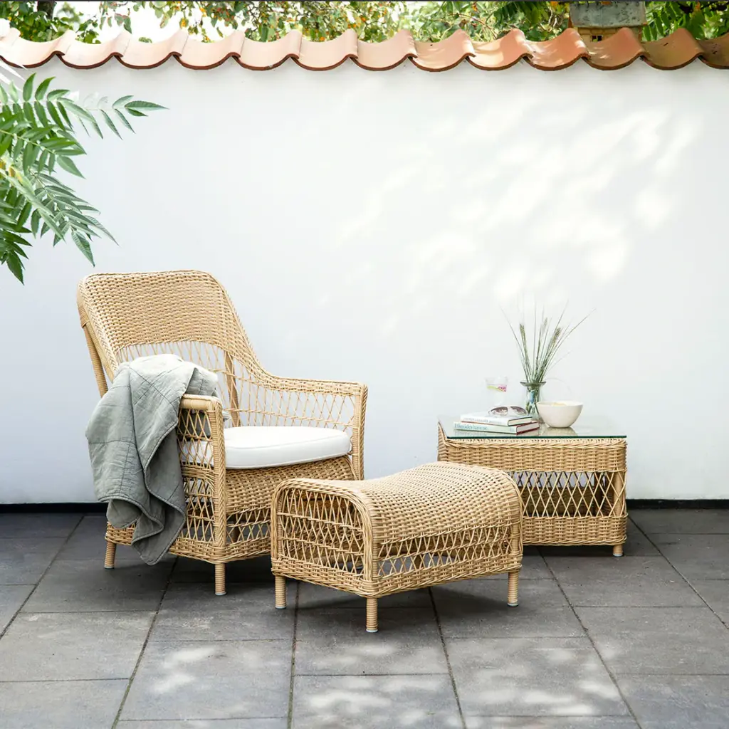 The Dawn Chair is the picture of restful elegance. With arms, a high back and a sturdy base, this chair invites you to stay a while and, with the option of a matching foot stool, to put your feet up while you're at it. The chair is crafted from maintenance-free fibers that are durable enough for year-round outdoor use.