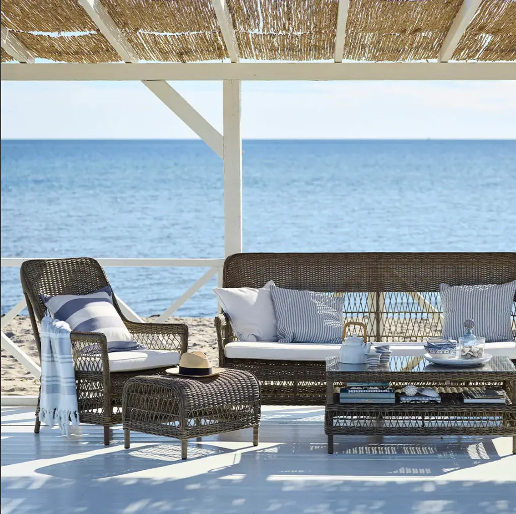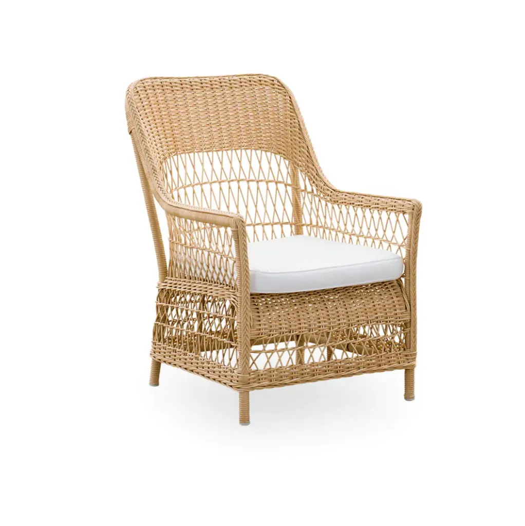 The Dawn Chair is the picture of restful elegance. With arms, a high back and a sturdy base, this chair invites you to stay a while and, with the option of a matching foot stool, to put your feet up while you're at it. The chair is crafted from maintenance-free fibers that are durable enough for year-round outdoor use.