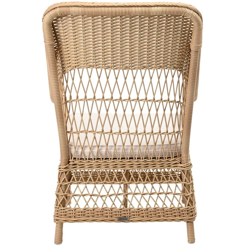 The Dawn outdoor wicker lounge chair by Sika Design is part of the elegant Georgia Garden collection. Inspired by vintage photos and postcards of posh seaside estates, the recreated tall back chair showcases an airy, decorative woven back and apron. The frame is AluRattan™, a lightweight weatherproof aluminum wrapped and woven in a maintenance-free polyethylene ArtFibre™ wicker. Made to stand up to year-round outdoor use in a garden or patio, Dawn is a practical but beautiful addition to the patio or garden.