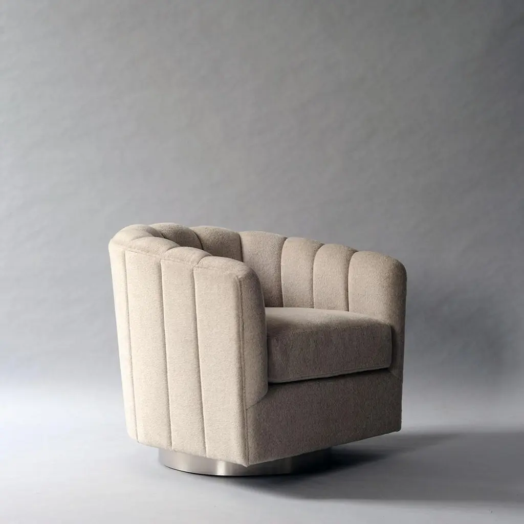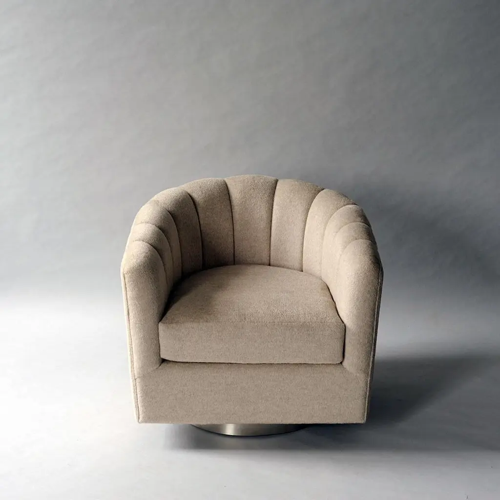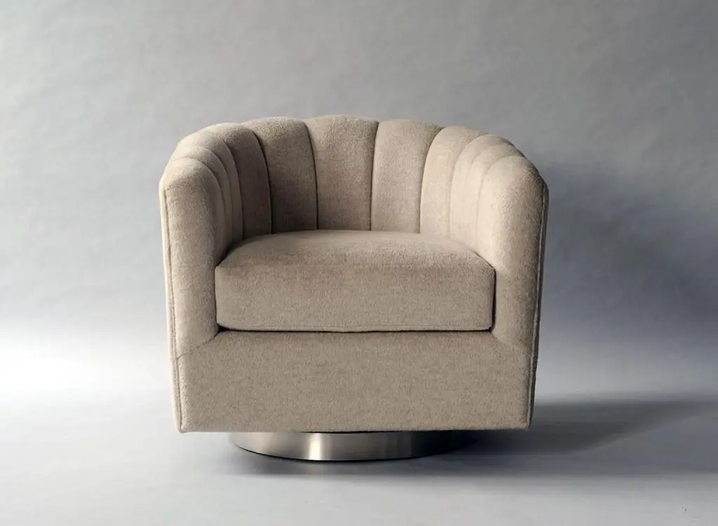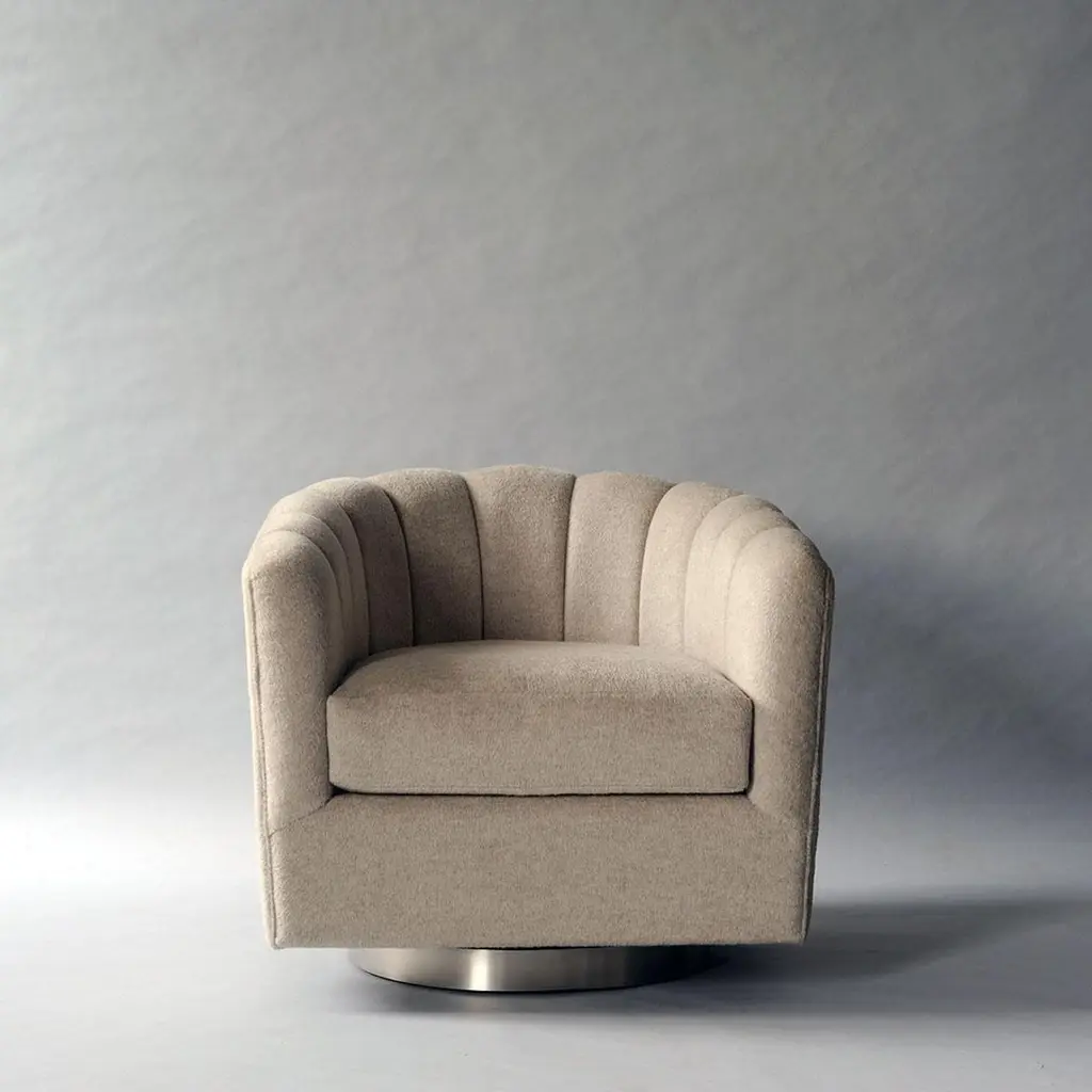 The Deco Lounge conjures the glamour of its namesake style through channel tufting that wraps the arms and back. Fully upholstered with a loose seat cushion, the design rests on a circular metal base, with a swivel mechanism that allows for smooth 360-degree movement.Pricing is quoted COM - does not include fabric costs.