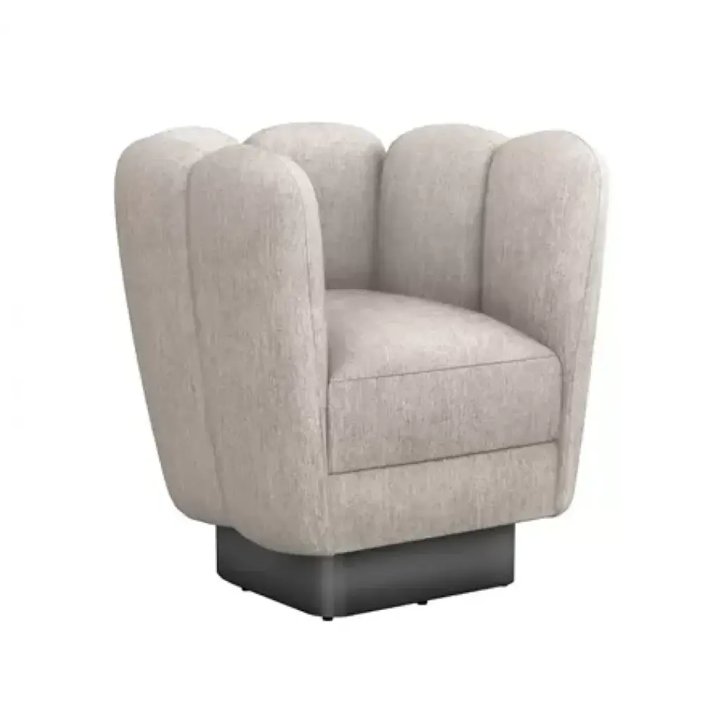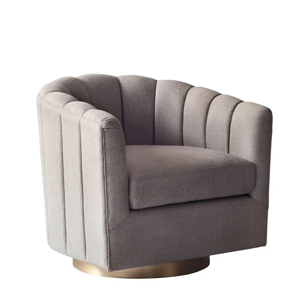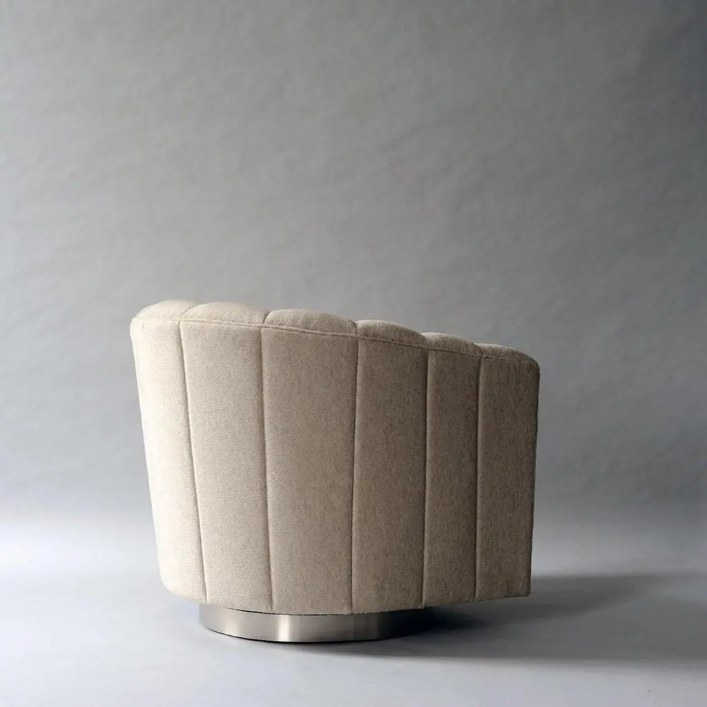 The Deco Lounge conjures the glamour of its namesake style through channel tufting that wraps the arms and back. Fully upholstered with a loose seat cushion, the design rests on a circular metal base, with a swivel mechanism that allows for smooth 360-degree movement.Pricing is quoted COM - does not include fabric costs.